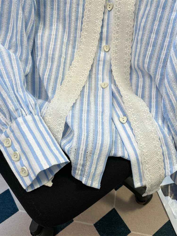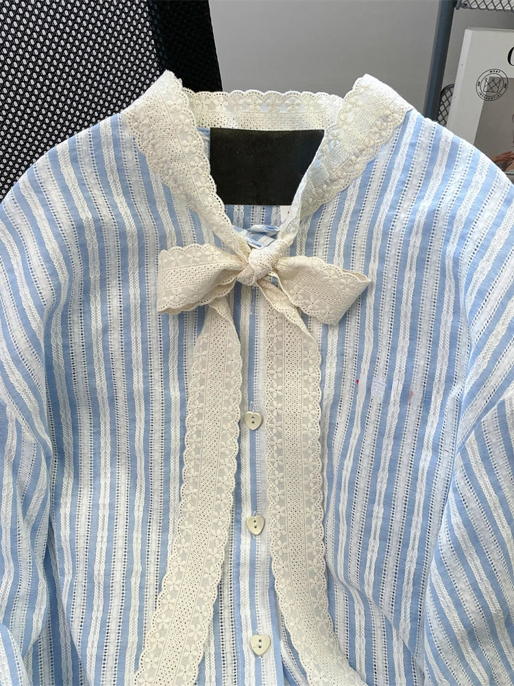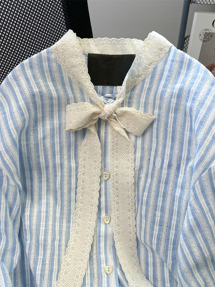 DERMEARNE French Elegant Blouses Lace Bow Striped Long Sleeve Single Breasted Spring Autumn Shirts All Match Design 2025 Women's Clothing