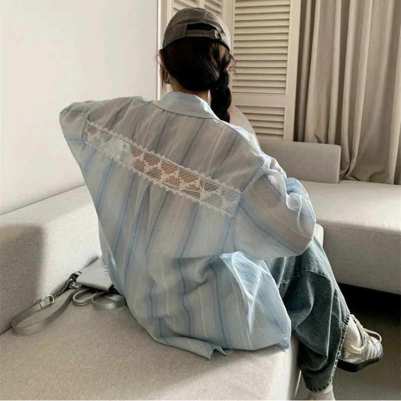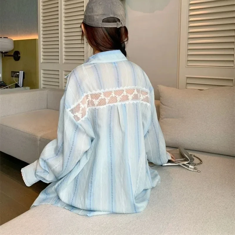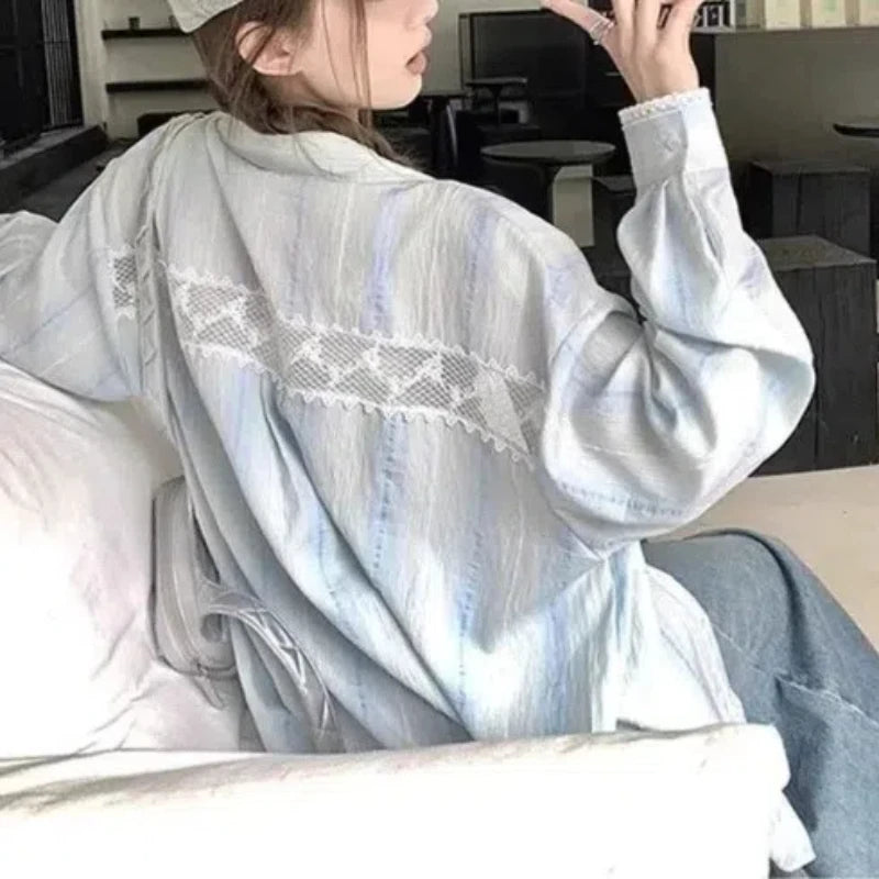 DERMEARNE Fresh and Lazy Style Design Women 2025 New Patchwork Polo Collar Button Lace Stripe Fashion Loose Casual Long Sleeved Shirts