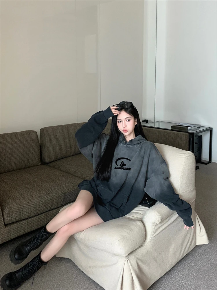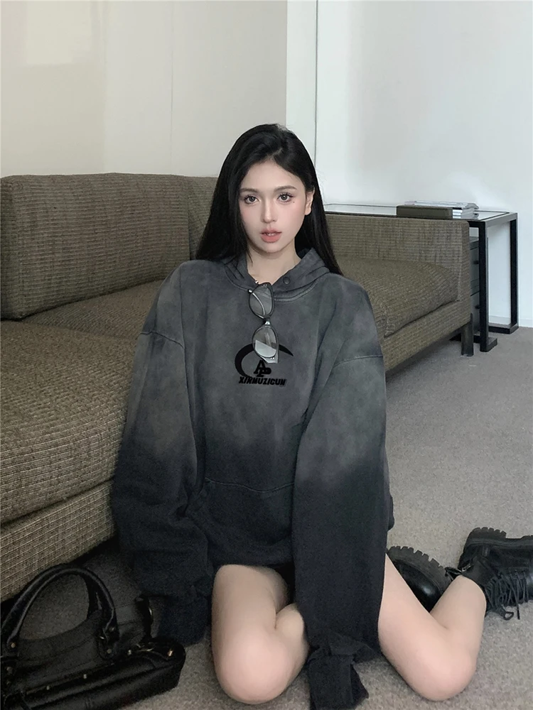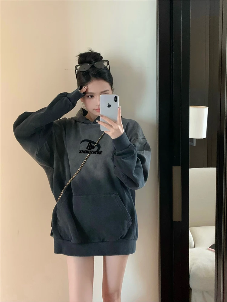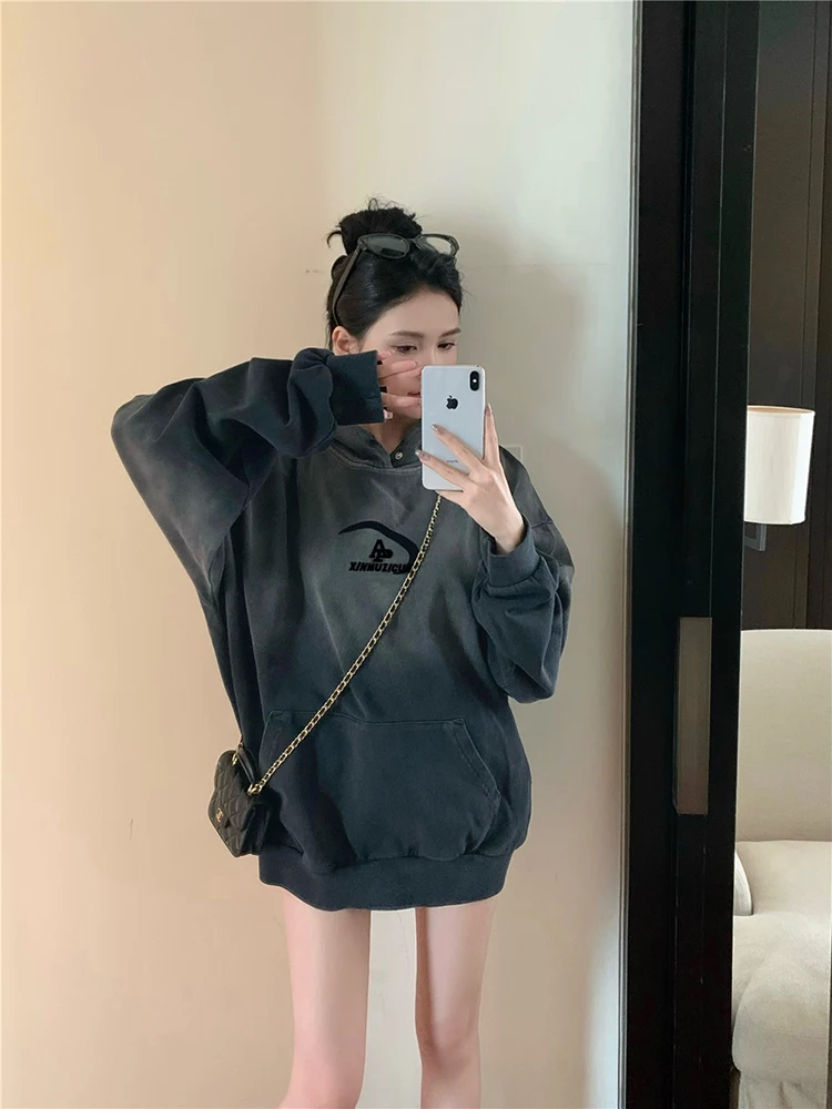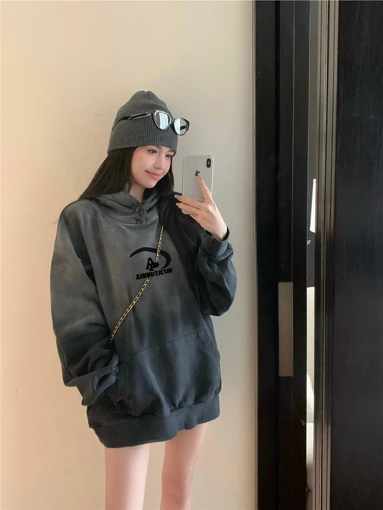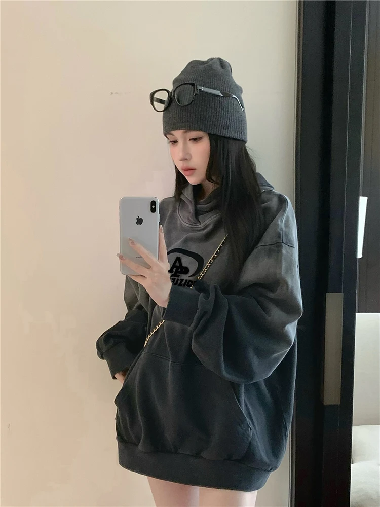 DERMEARNE Grey Womens Clothing Vintage Street Sweatshirt Hooded Harajuku Y2K Letter Pullover Long Sleeves Warm Oversize Baggy Ladies Tops