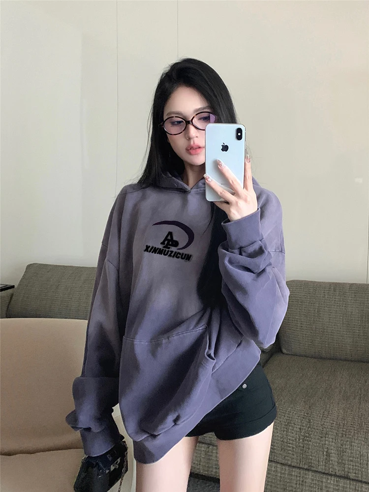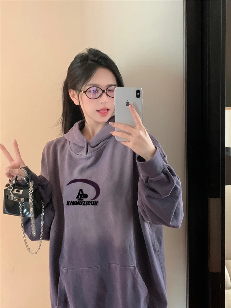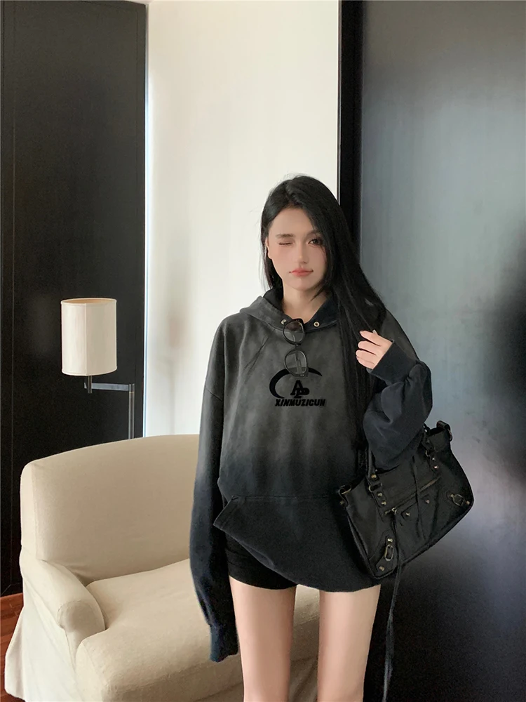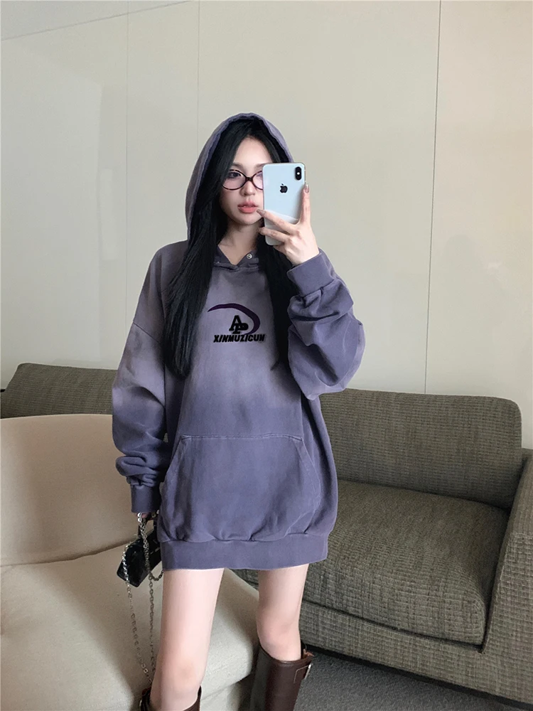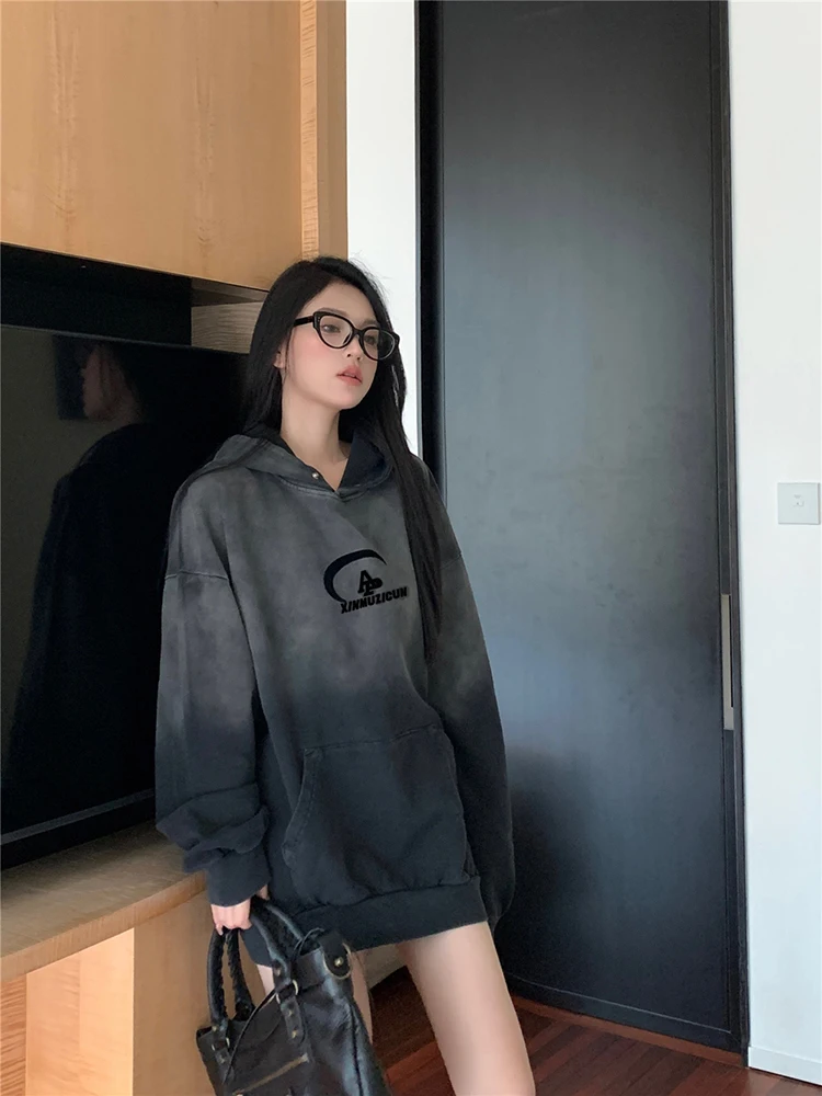DERMEARNE Grey Womens Clothing Vintage Street Sweatshirt Hooded Harajuku Y2K Letter Pullover Long Sleeves Warm Oversize Baggy Ladies Tops