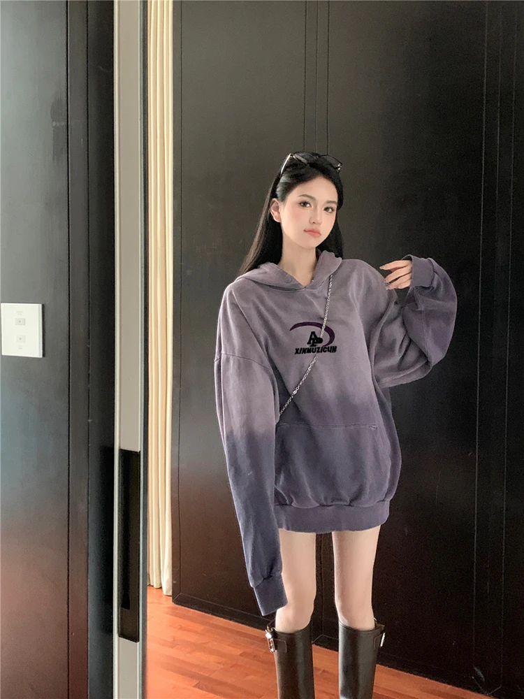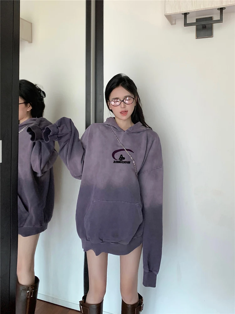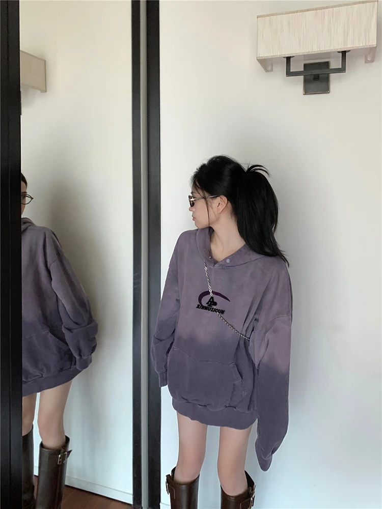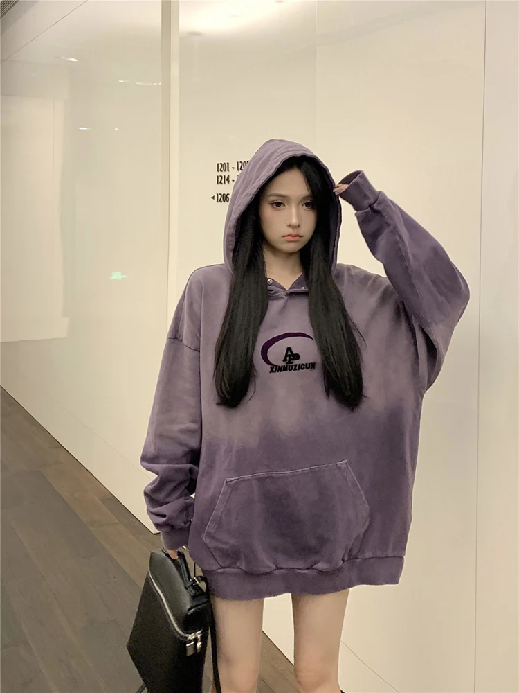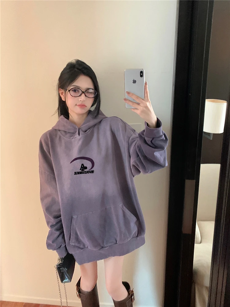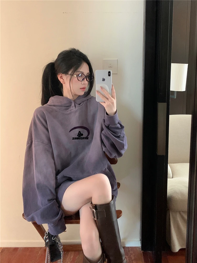 DERMEARNE Grey Womens Clothing Vintage Street Sweatshirt Hooded Harajuku Y2K Letter Pullover Long Sleeves Warm Oversize Baggy Ladies Tops