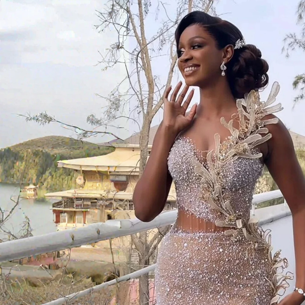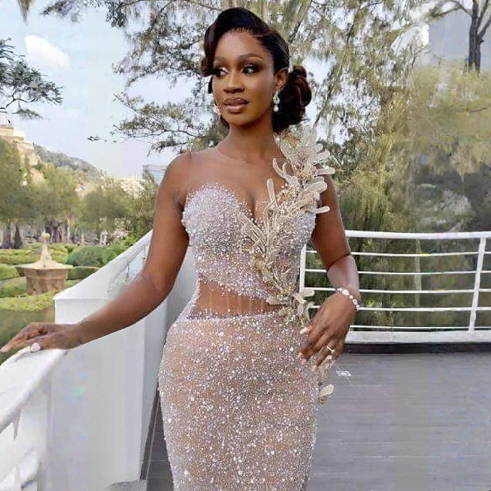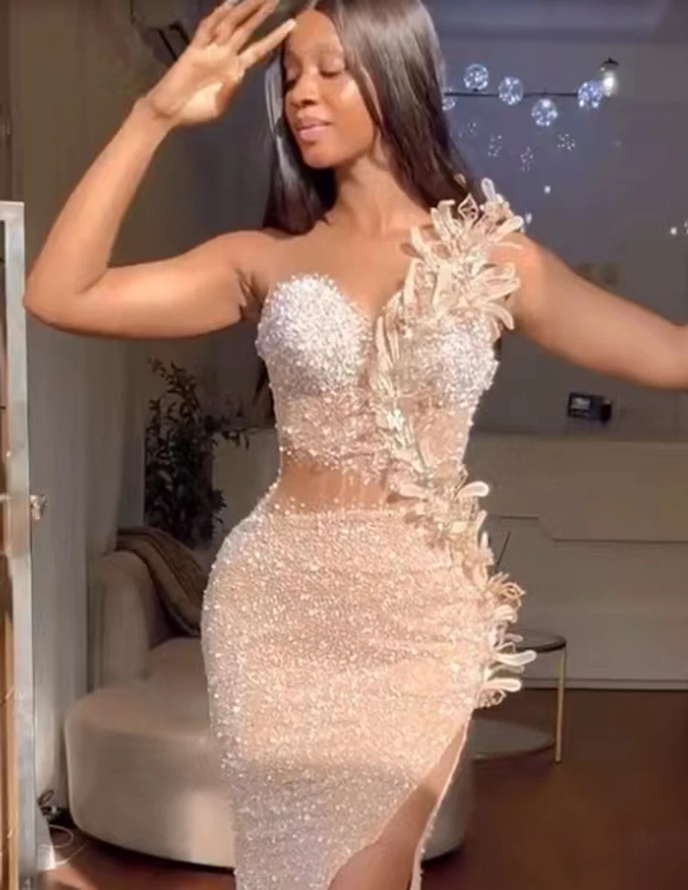 DERMEARNE High Split Sparkly Sequined Mermaid Evening Dresses Beading Pearls Fish Bone Long Formal Party Prom Gowns Vestido De Fiesta