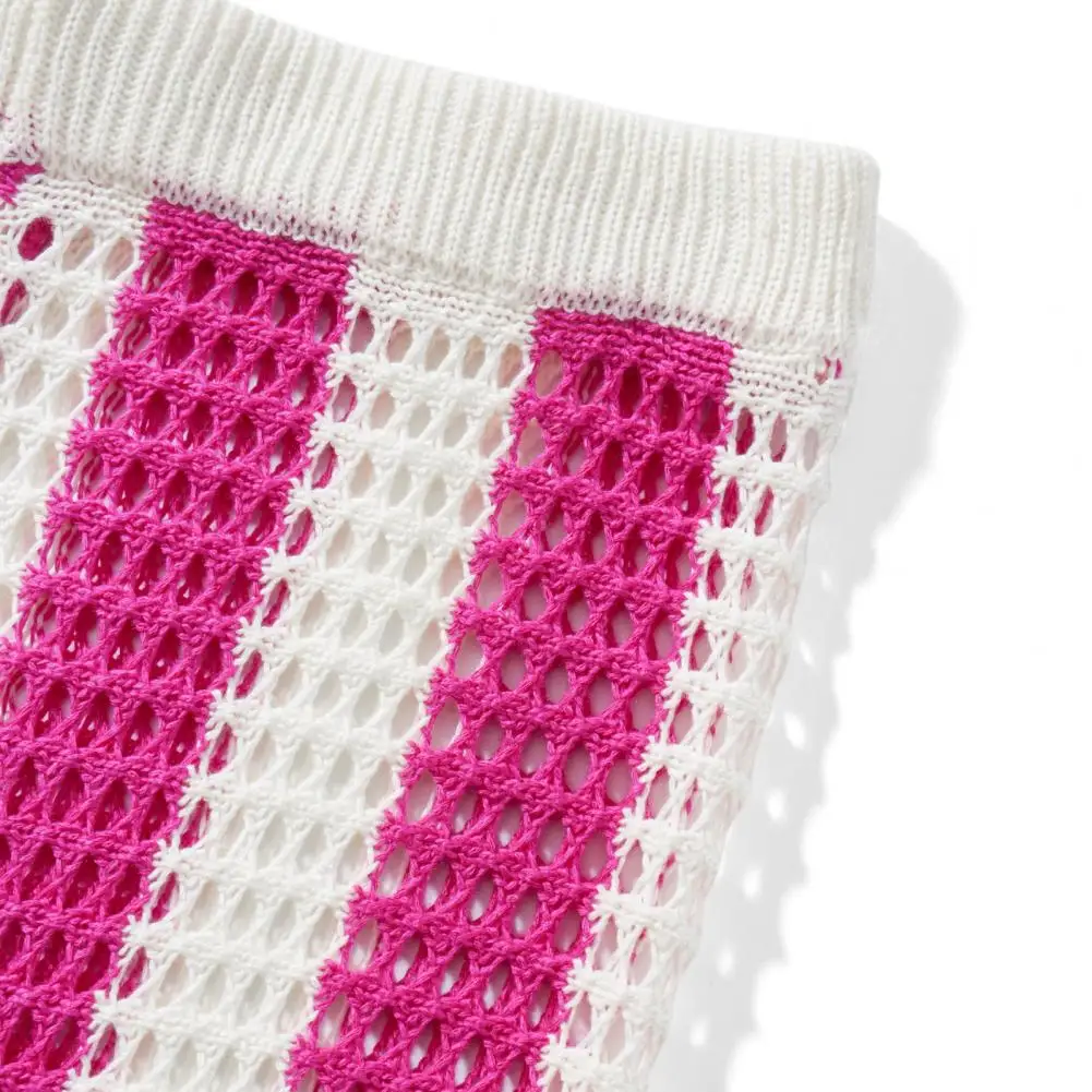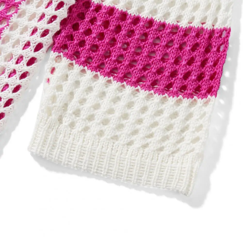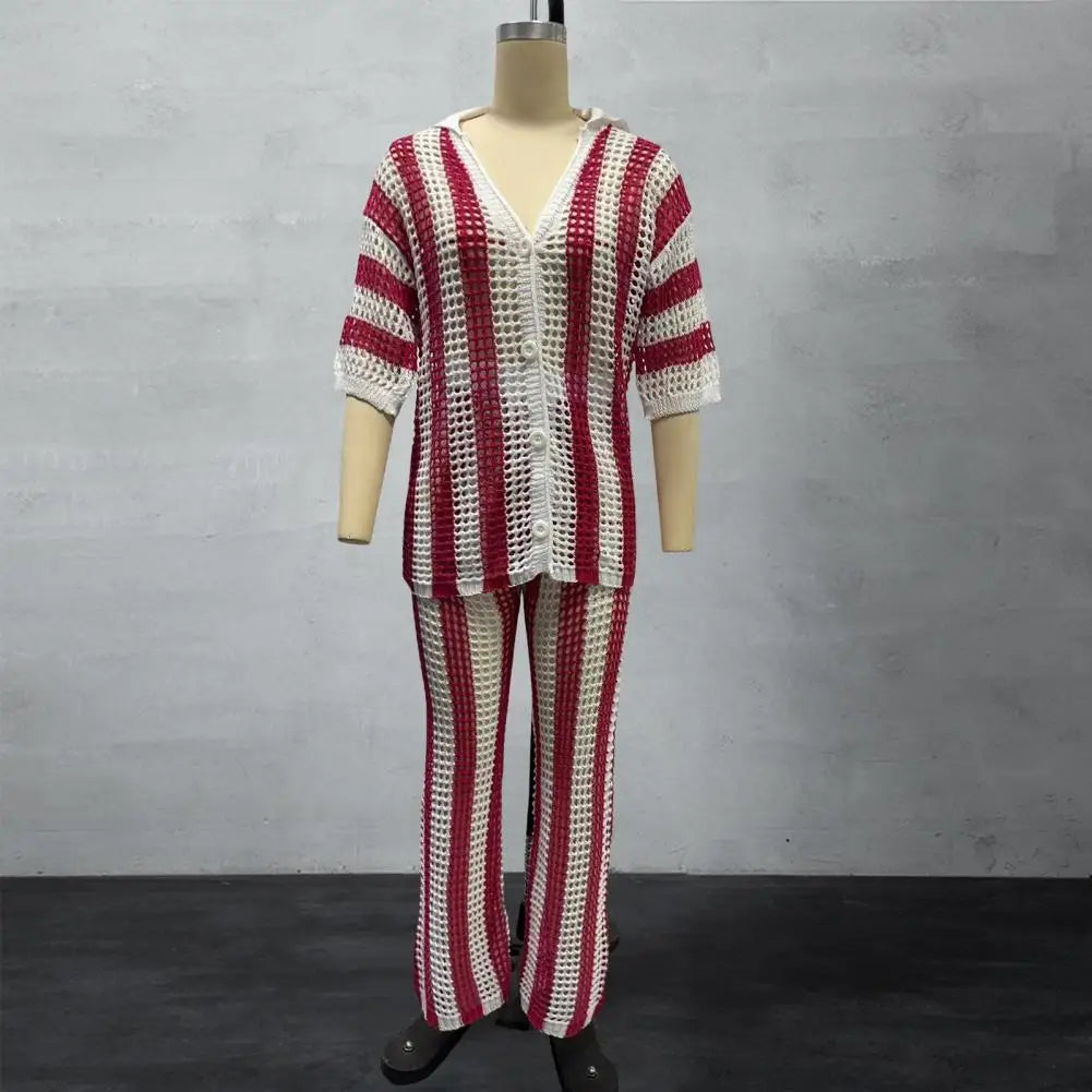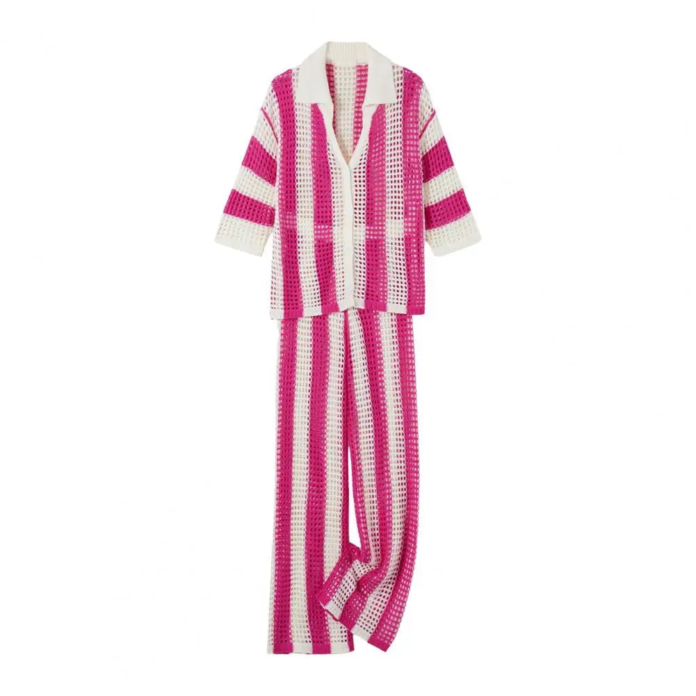 v-neck hollow striped shirt pairs elegantly with loose knitted wide-leg pants.
