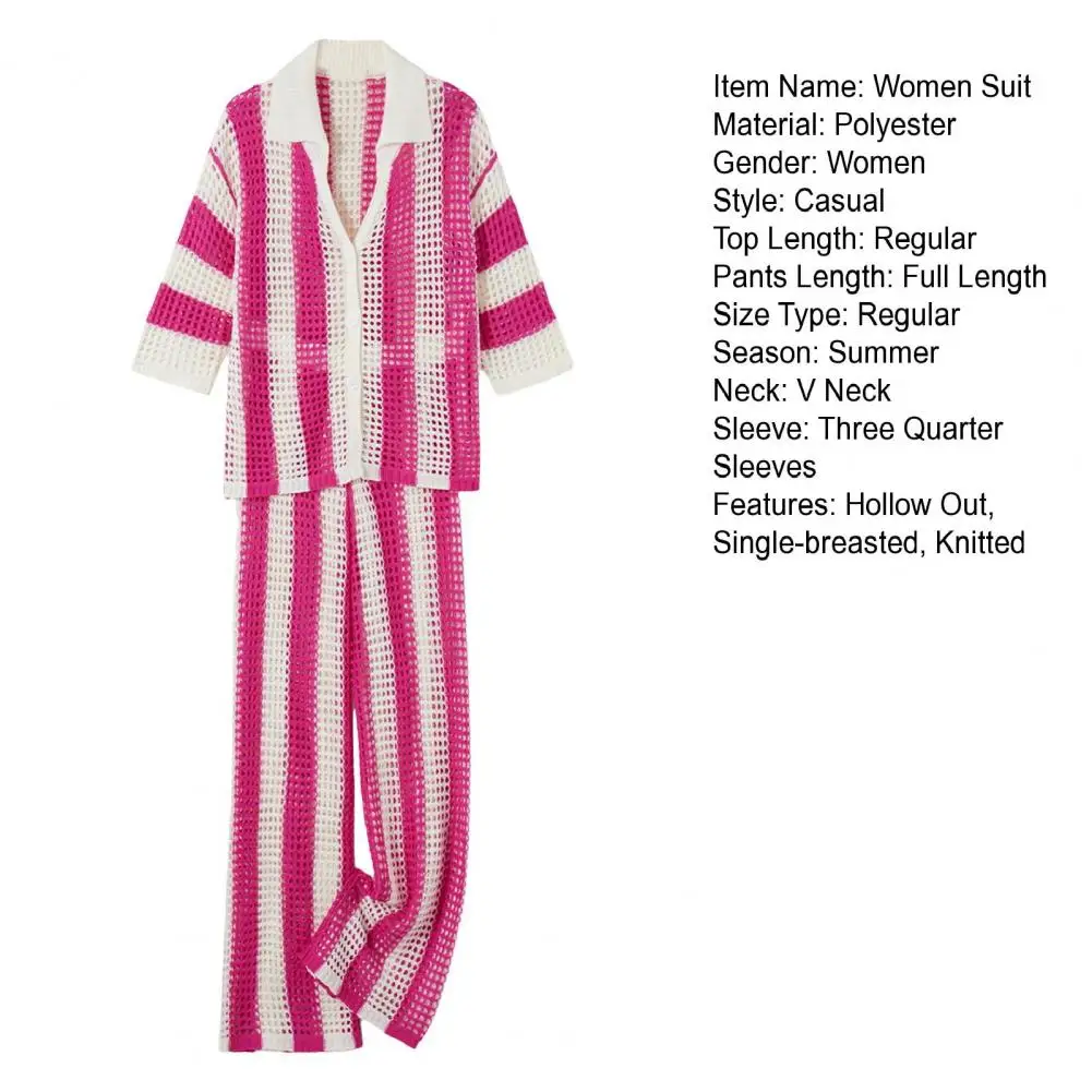 Hollow Knit Clothes Stylish Women's Knitted Shirt Pants Set with Hollow Out V Neck Single-breasted Blouse High Waist for Summer