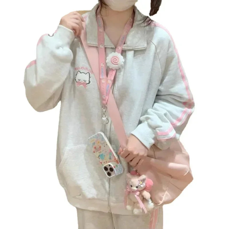 DERMEARNE HOUZHOU Japanese Fashion Kawaii Zipper Hoodie Women Harajuku Cute Pink Cat Embroidery Oversized Hooded Sweatshirt Winter 2024