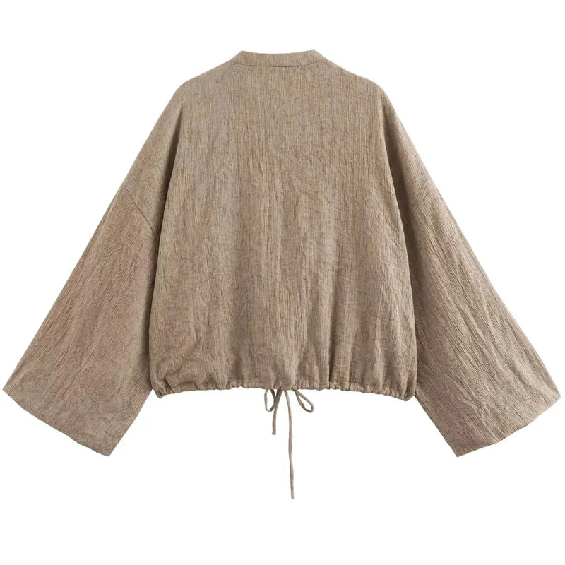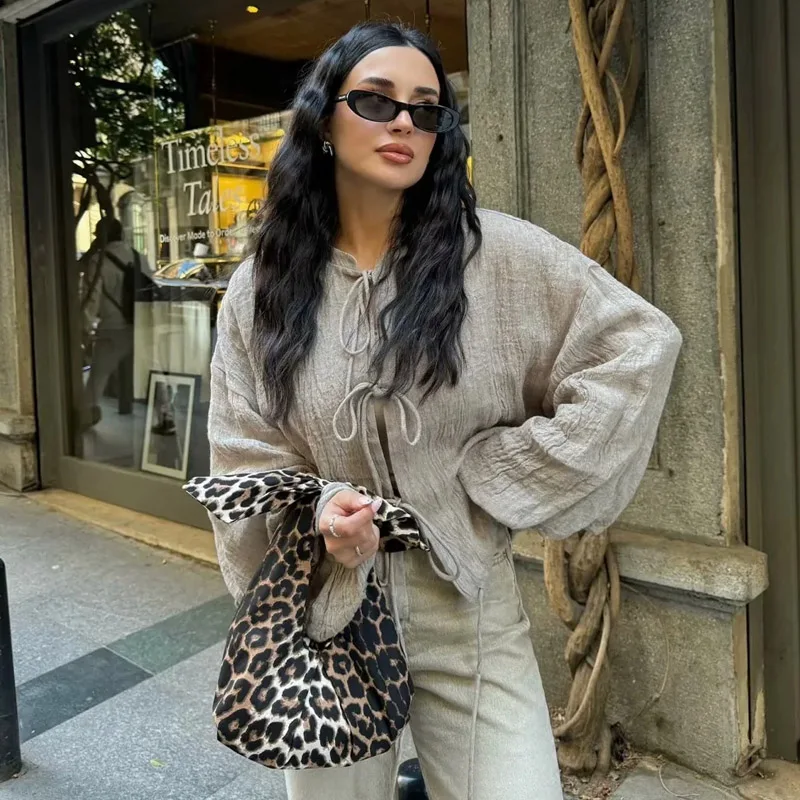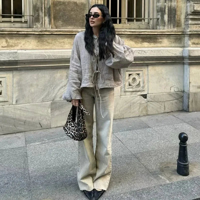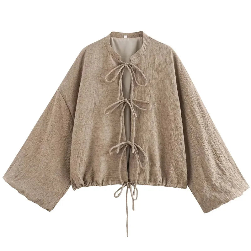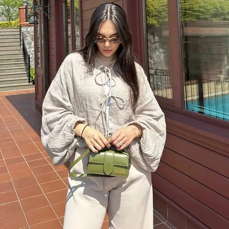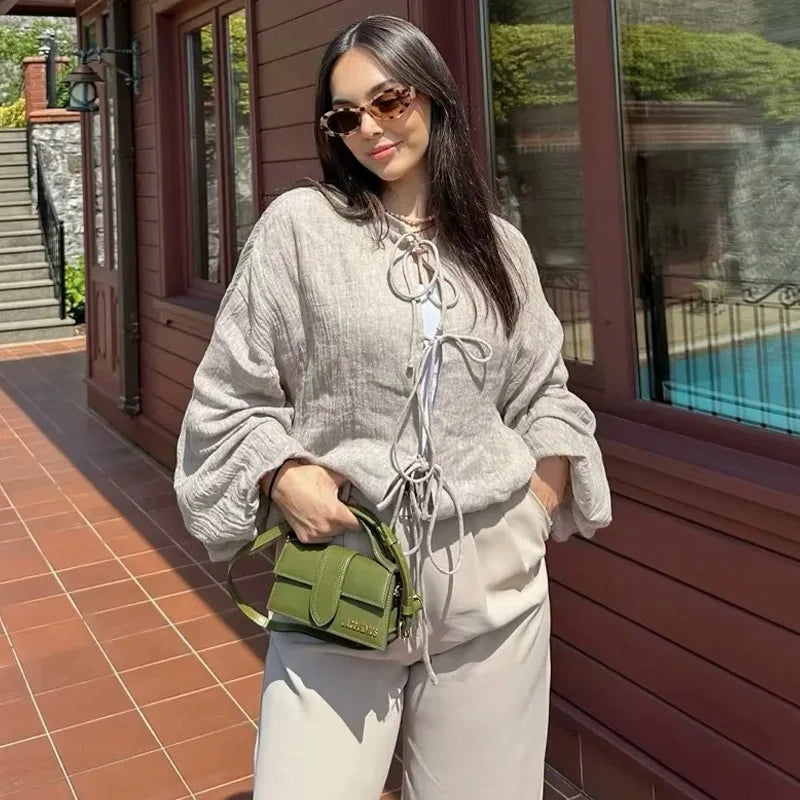 DERMEARNE HXAO Crop Bow Lace-Up Blouse Women's Shirt Summer 2025 O-Neck Long Sleeve Loose Shirt Elegant Fashion All-Match Ladies Blouses