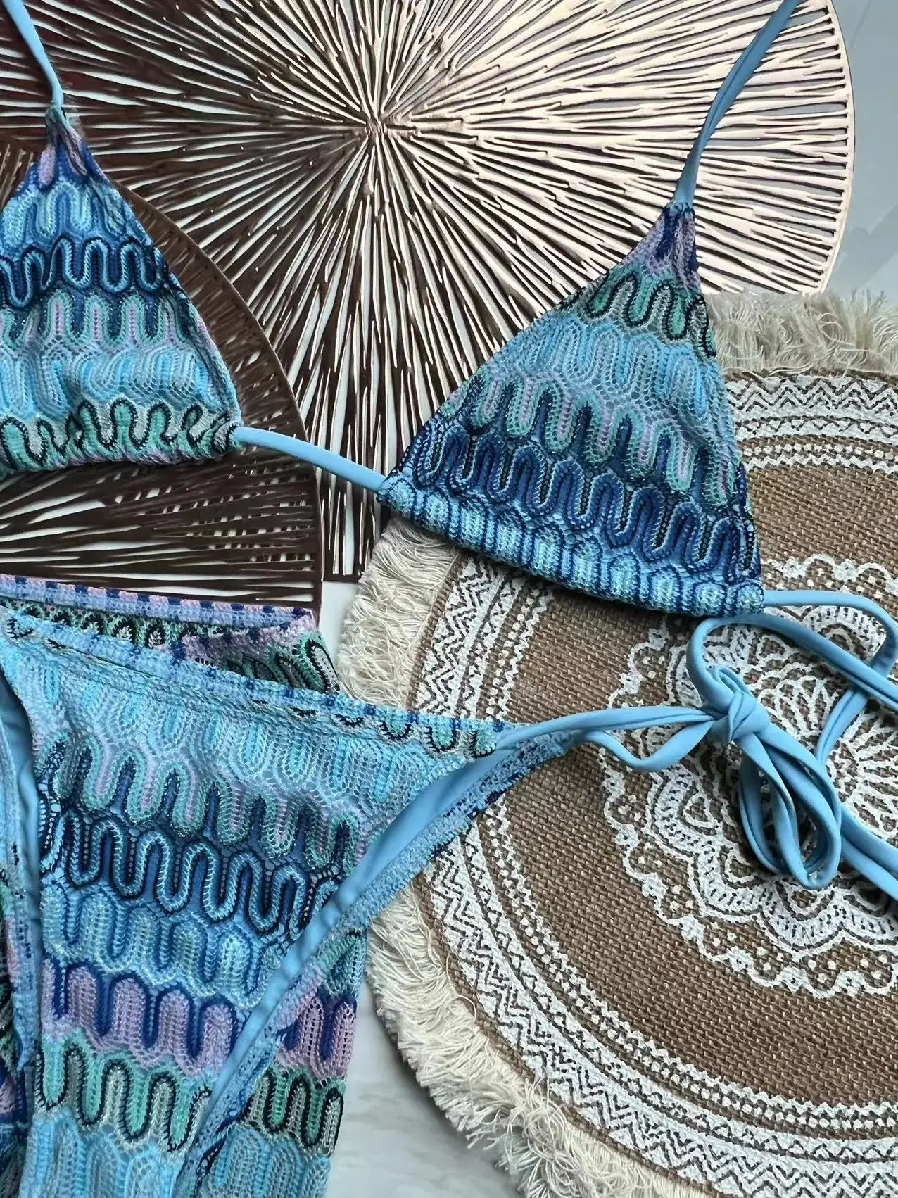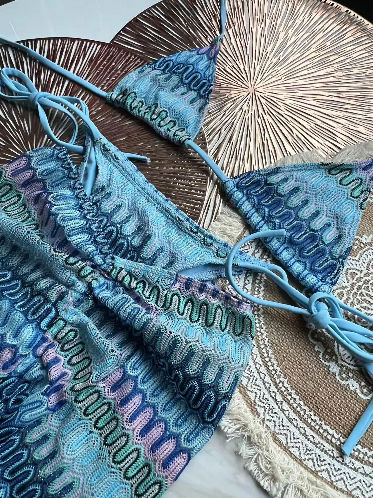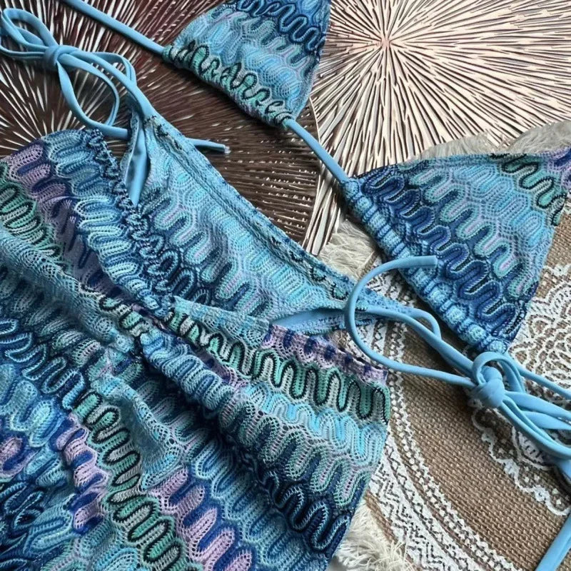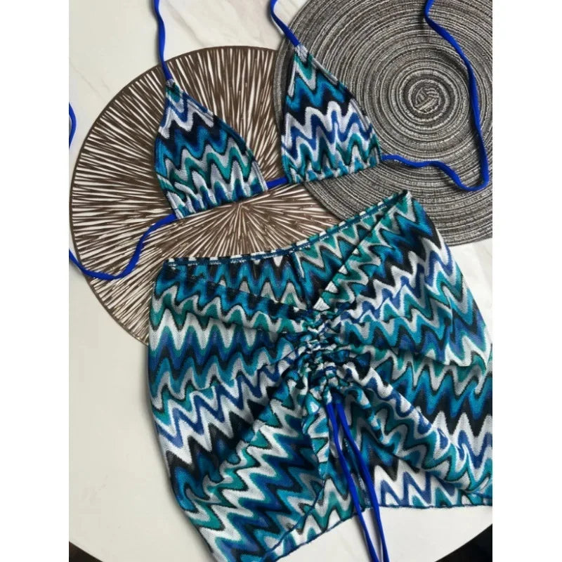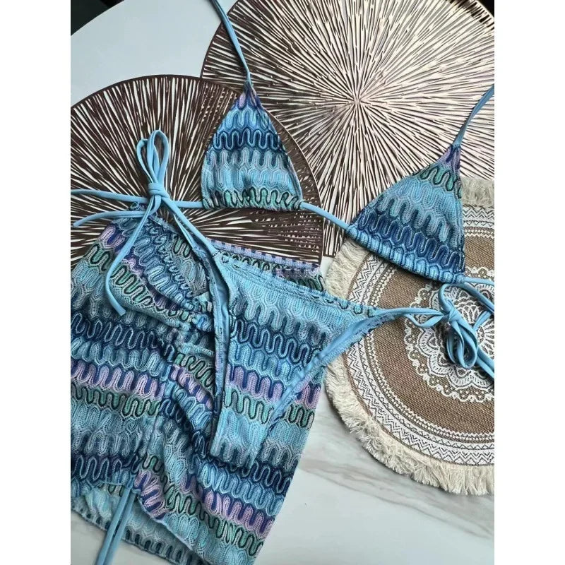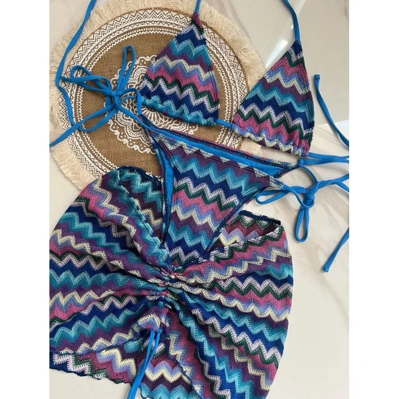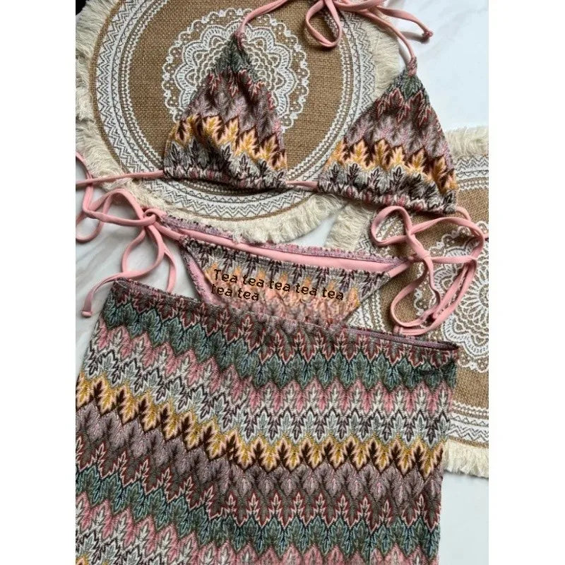 DERMEARNE Knitbikini Set Of Three Sexy Striped Swimwear Middle Age Polyester Fiber Beach Style Printed Knitted Bikini