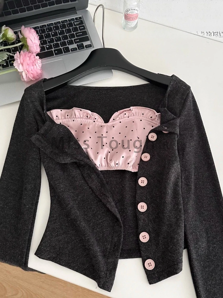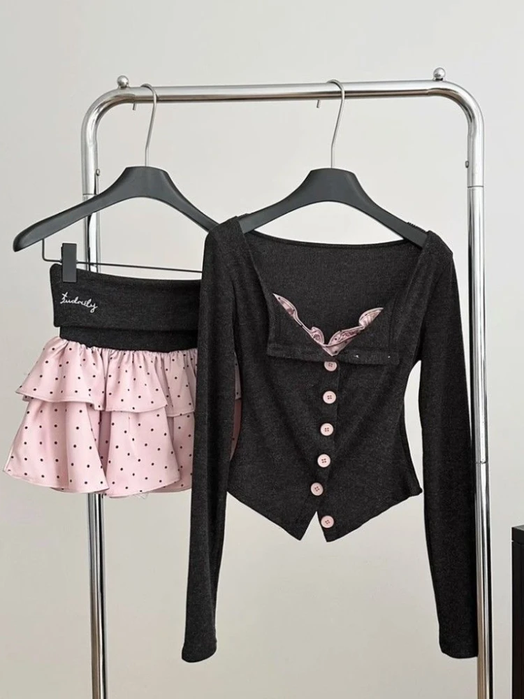 DERMEARNE Korean Fashion Polka Dot 2-piece Set Women Design Sweet Slim Long Sleeve V-neck Tops Female + Elastic Waist Pink Ruffle Skirt