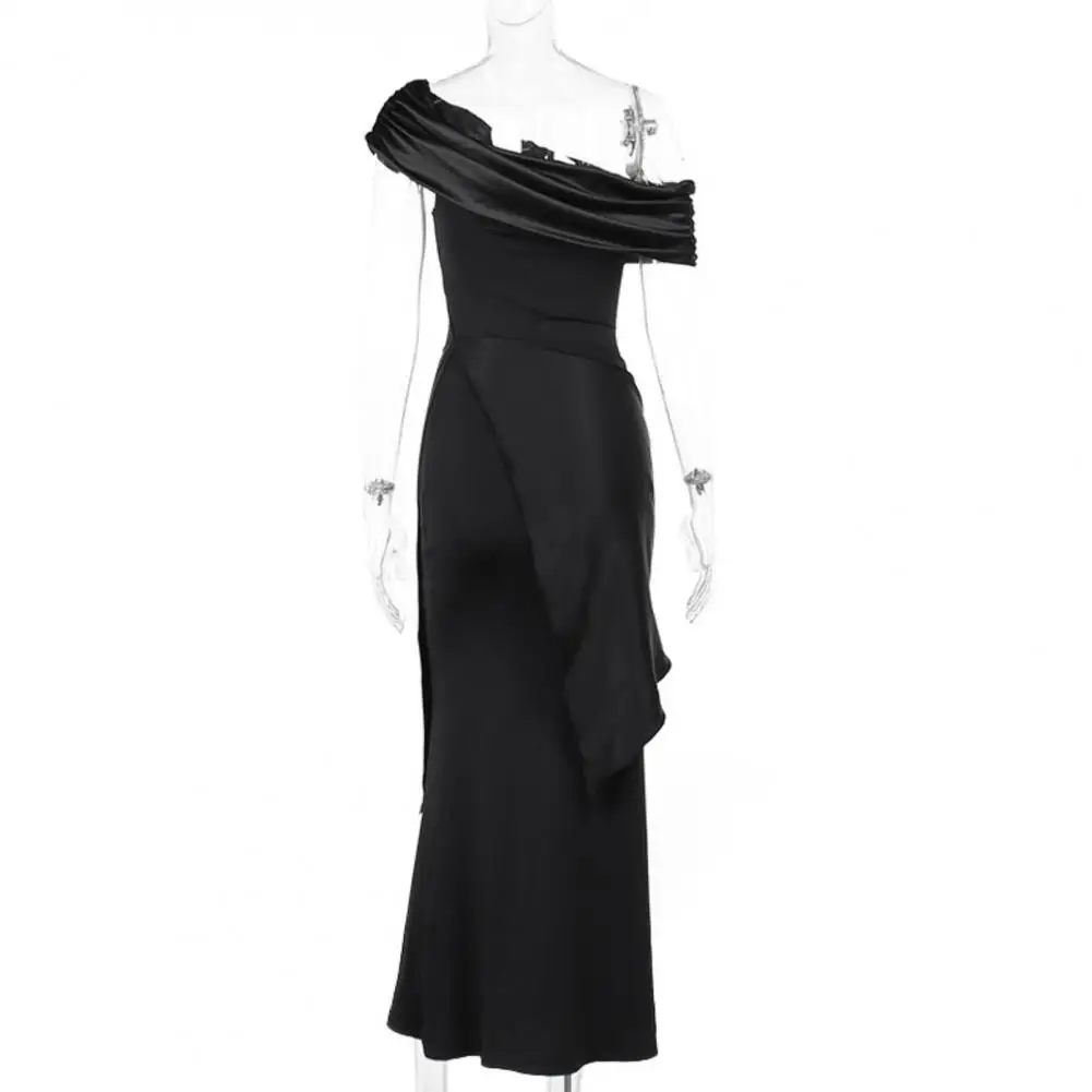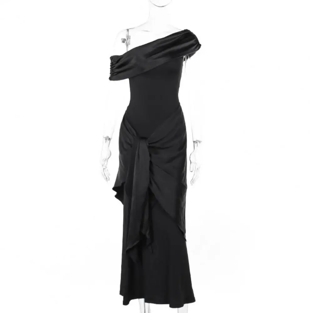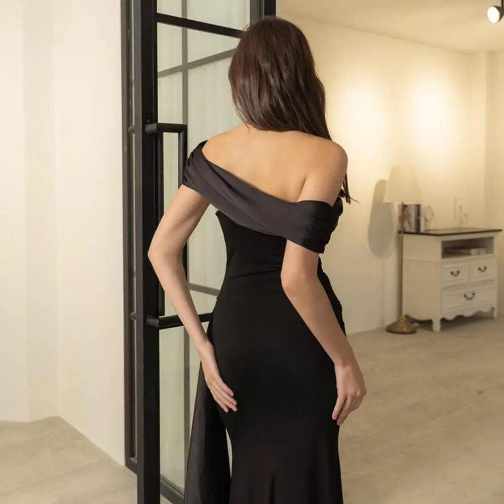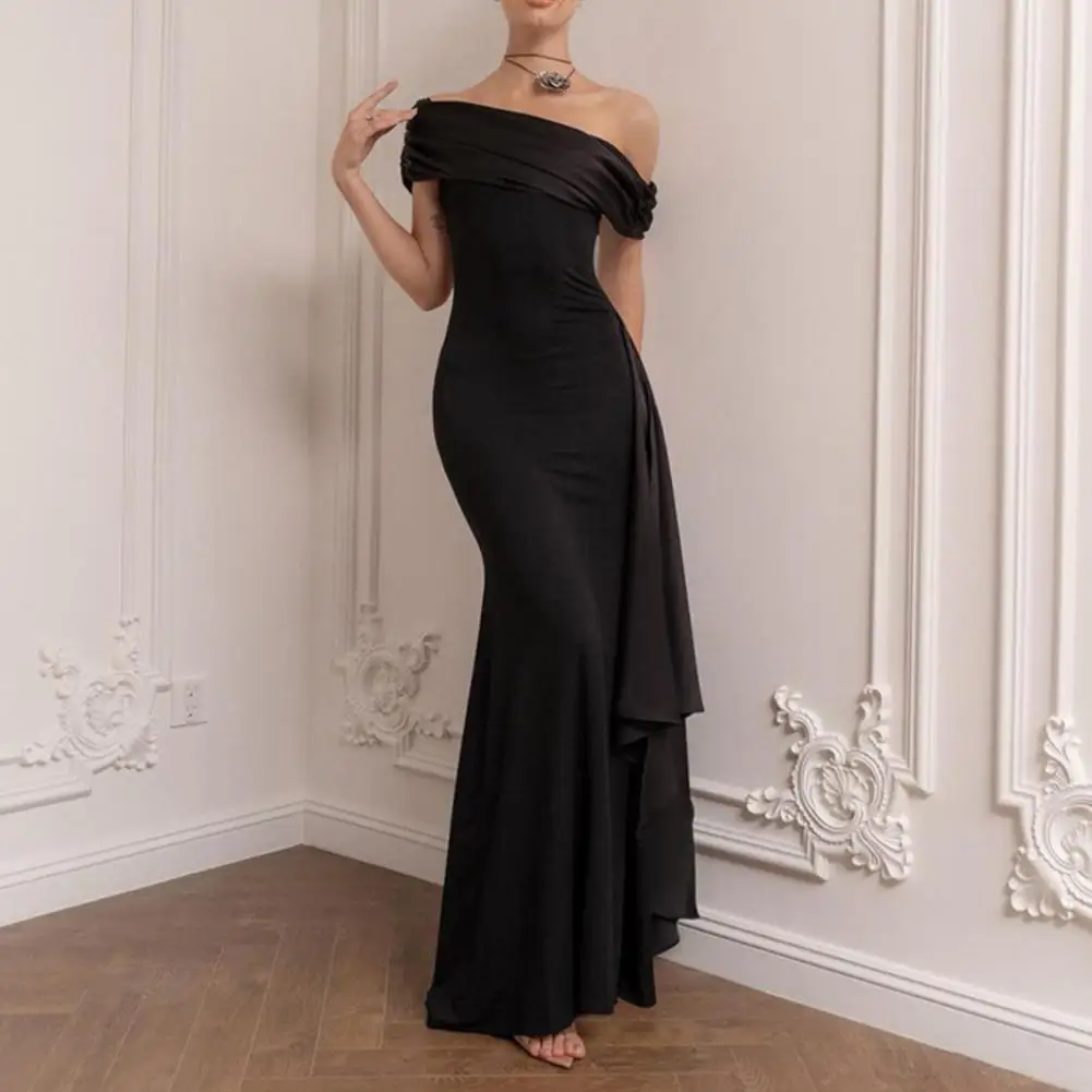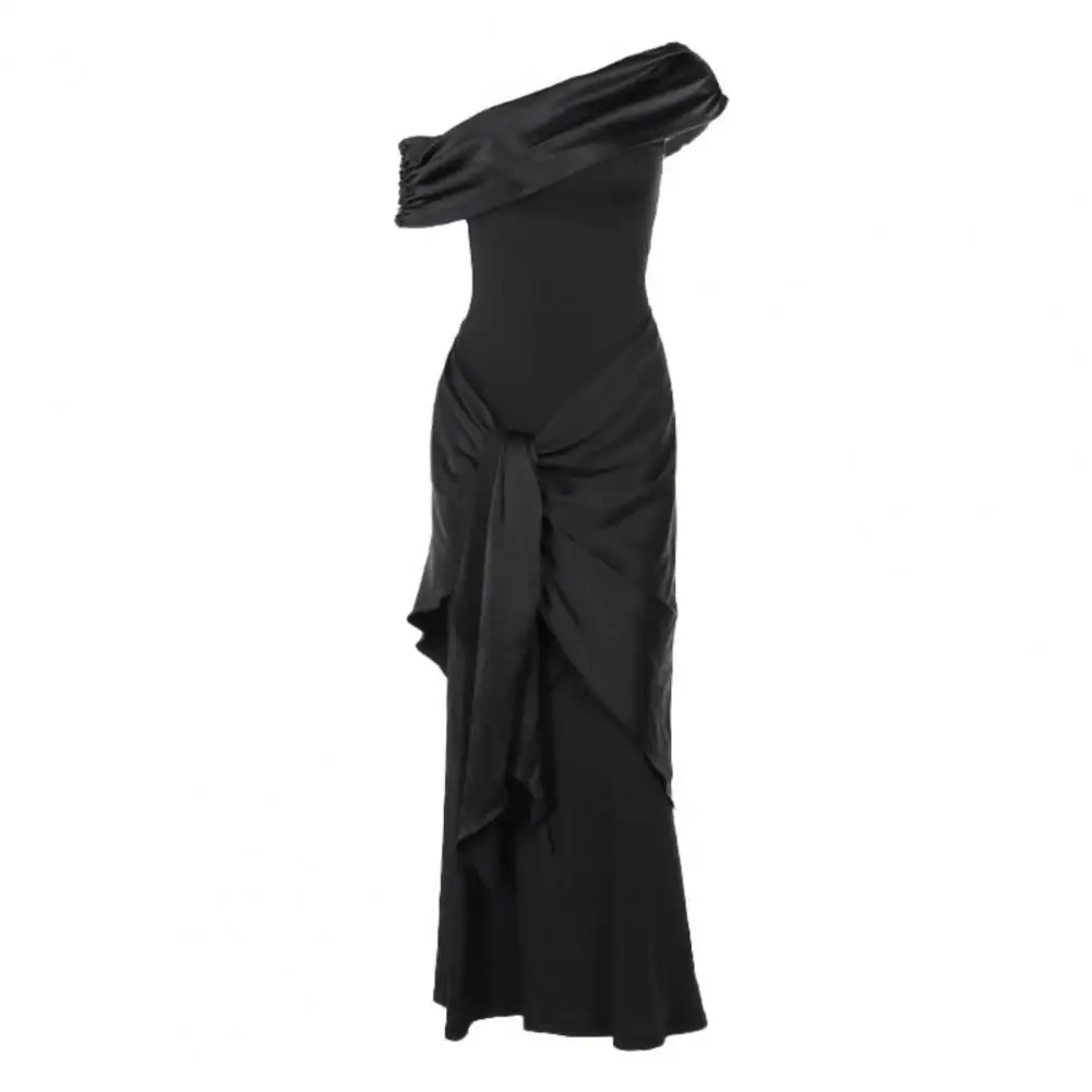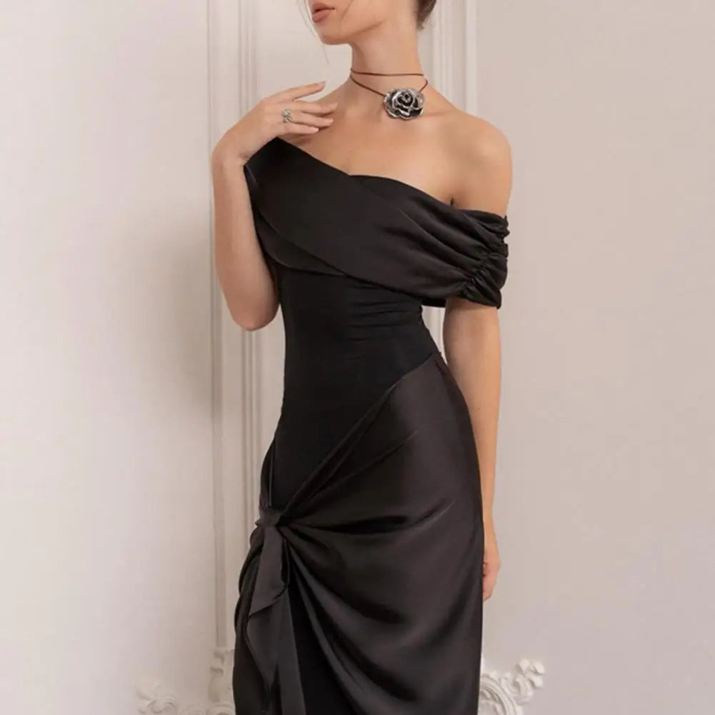 Unique Neckline Design: Stand out with the off neckline and irregular sloped collar design of this dress. Embrace a modern twist on classic elegance with this eye-catching feature.