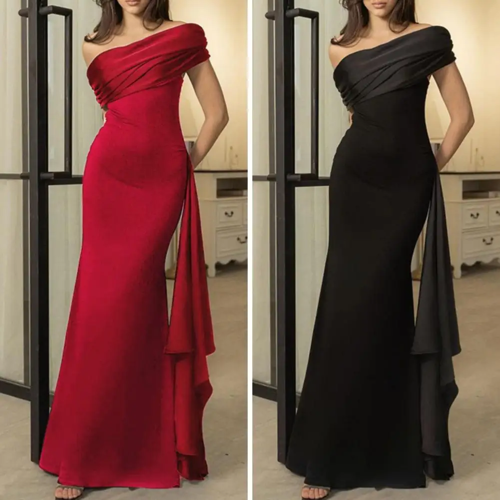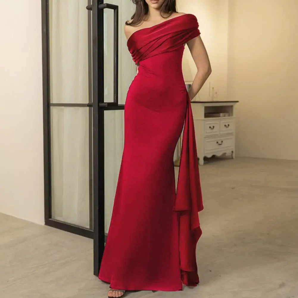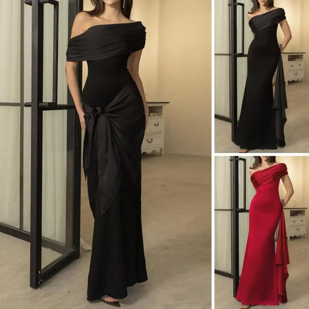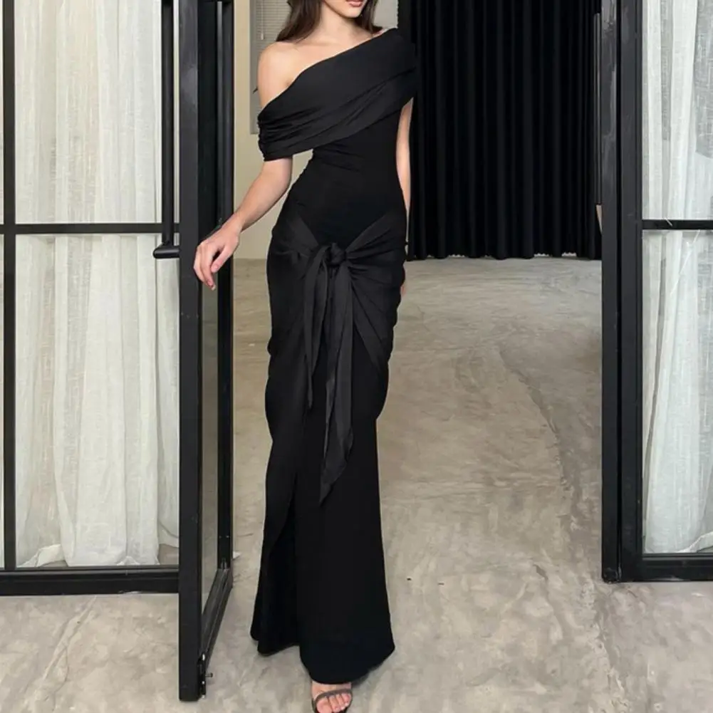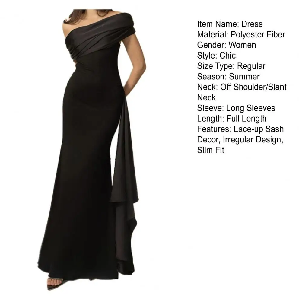 Lady Evening Dress Slant Neck Off Shoulder Sleeveless Pleated Lace-up Sash Decor Irregular Design Slim Fit Prom Party Maxi Dress Summer Dress