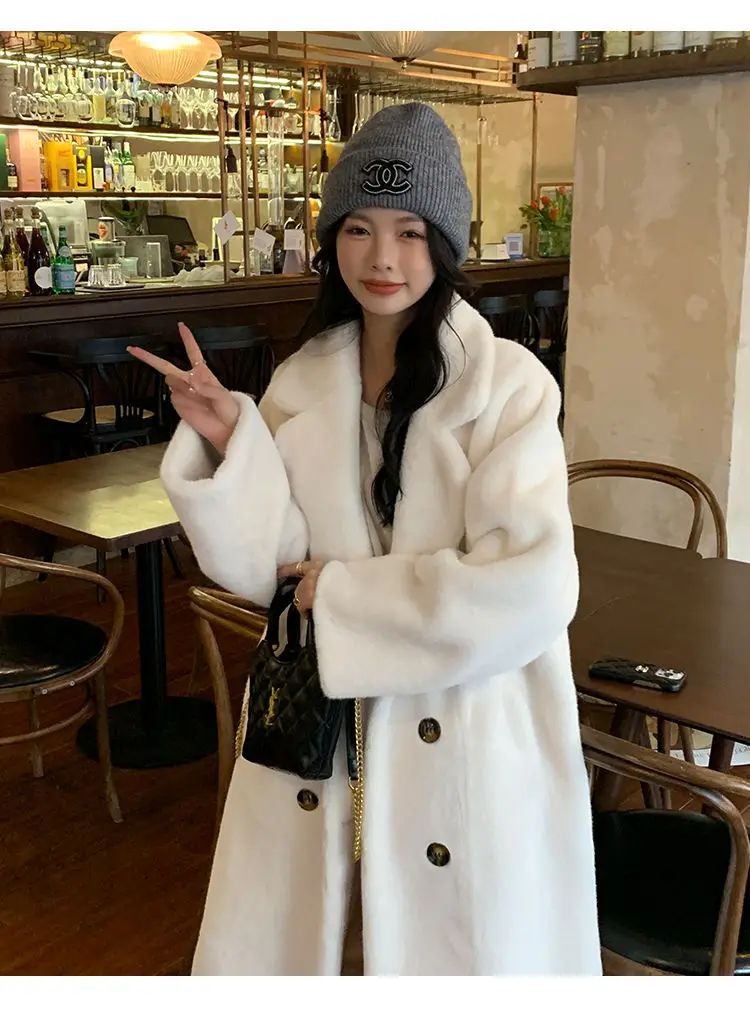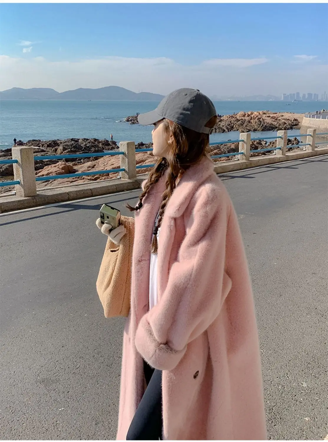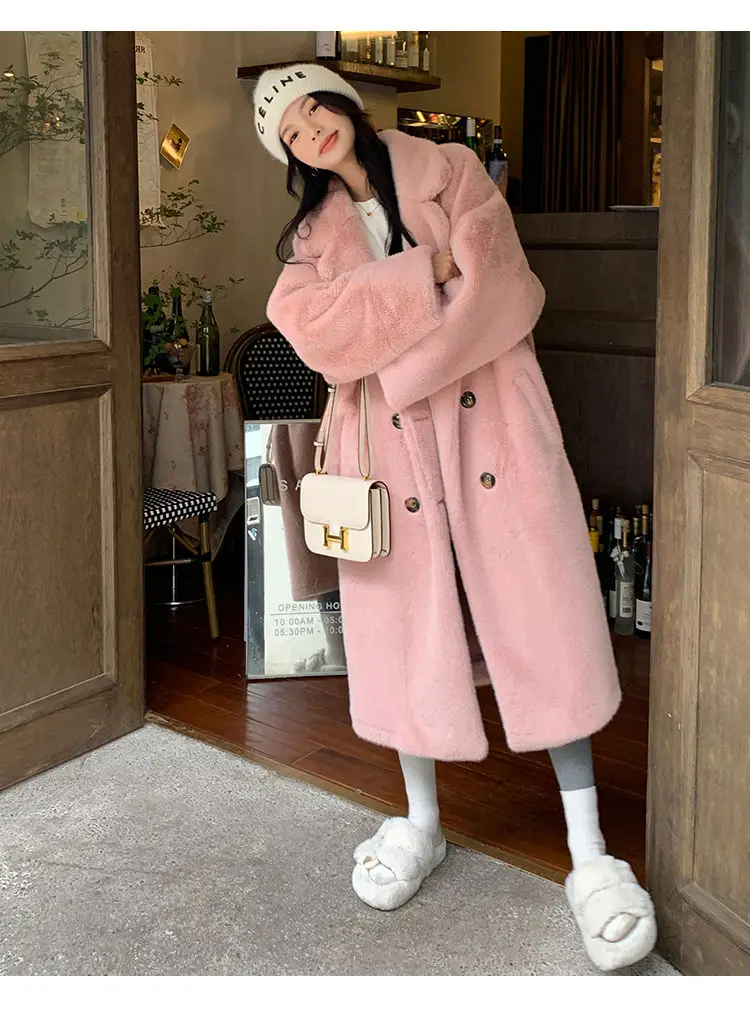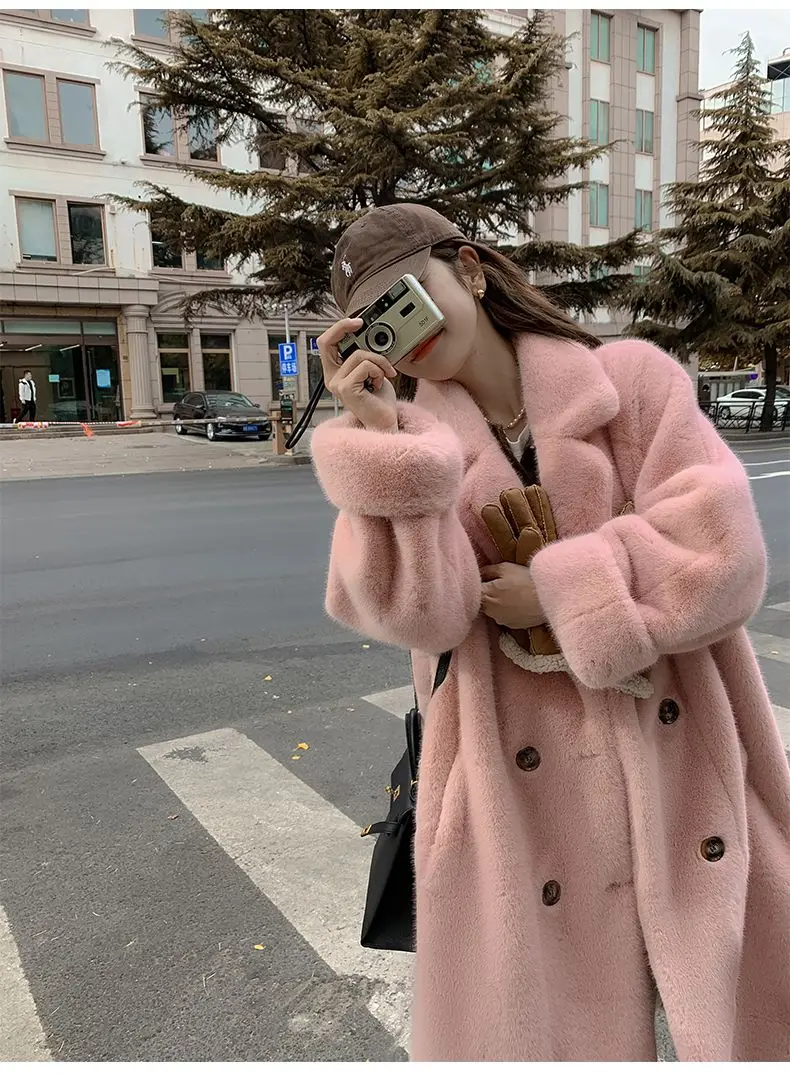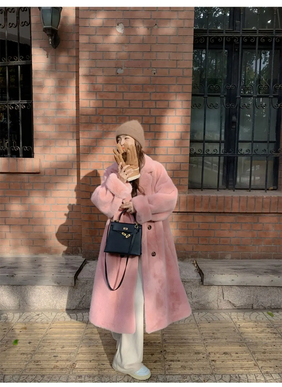 DERMEARNE Long Winter Coat Women Faux Mink Fur Turn Down Collar Fluffy Jackets Double Breasted Fashion Plush Coats Loose Warm Outerwears