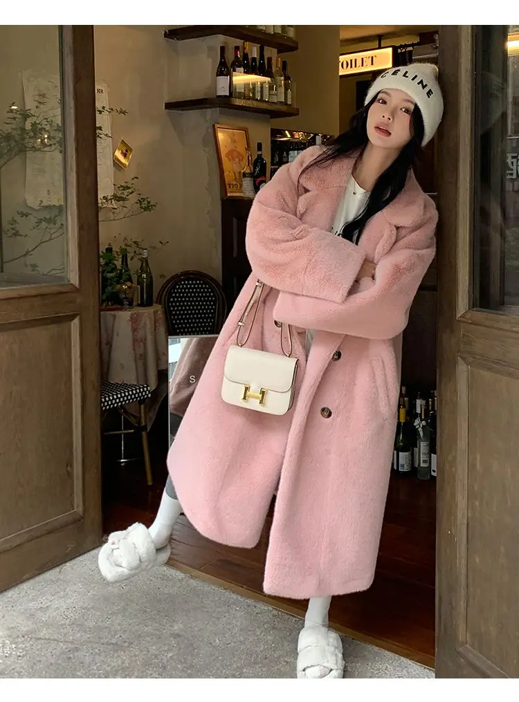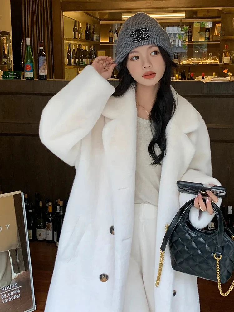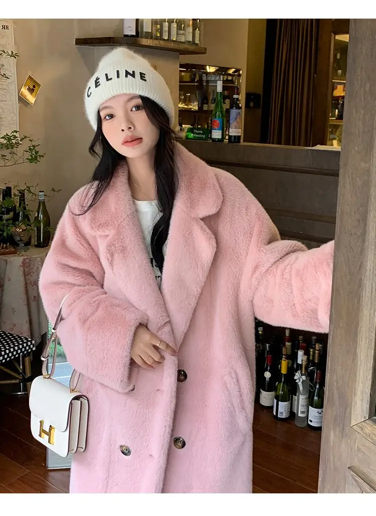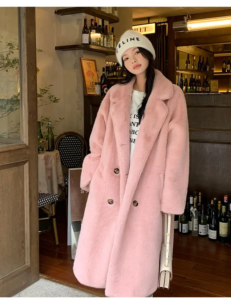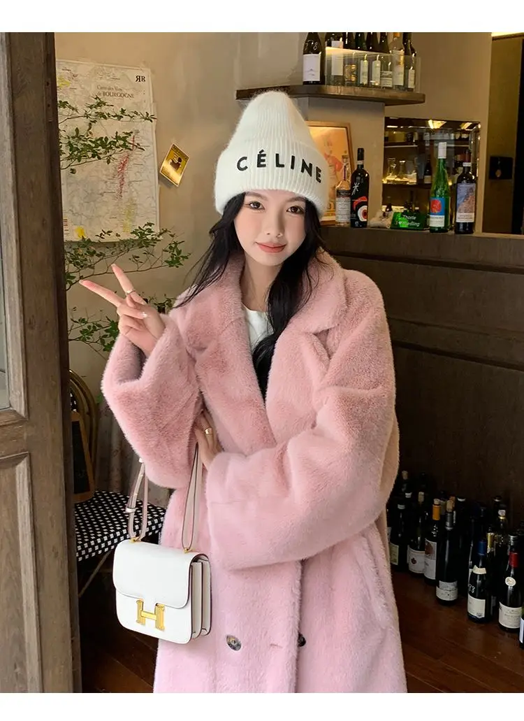 DERMEARNE Long Winter Coat Women Faux Mink Fur Turn Down Collar Fluffy Jackets Double Breasted Fashion Plush Coats Loose Warm Outerwears