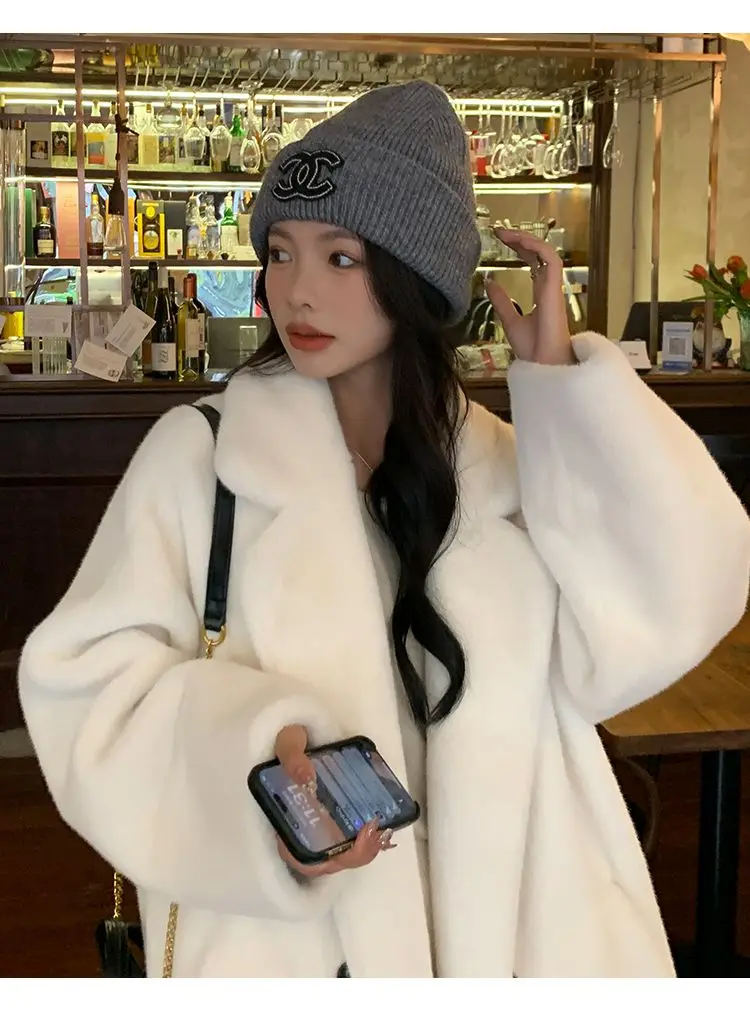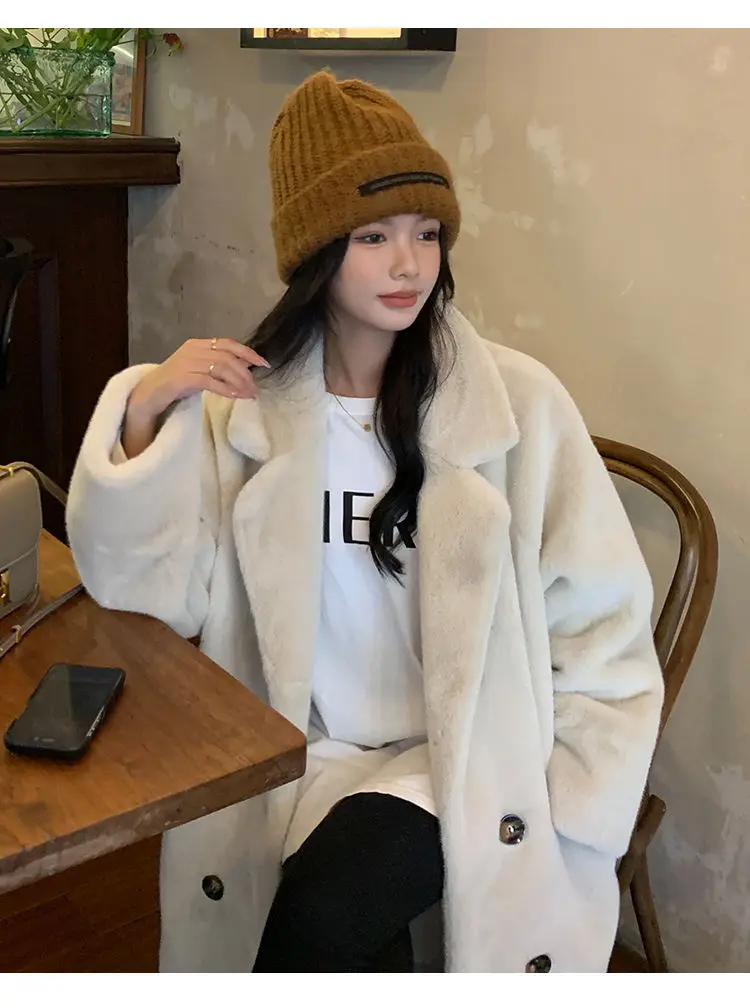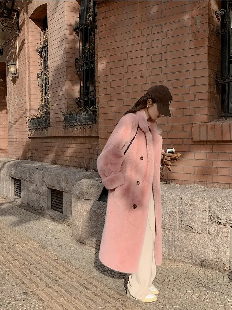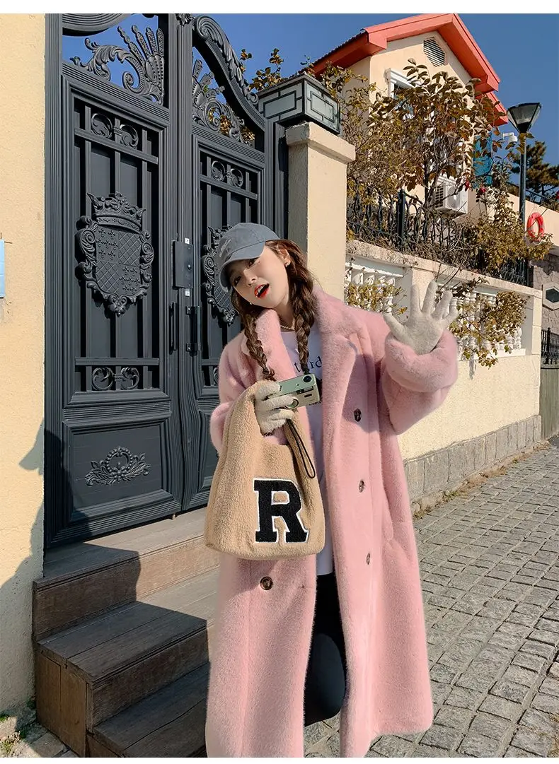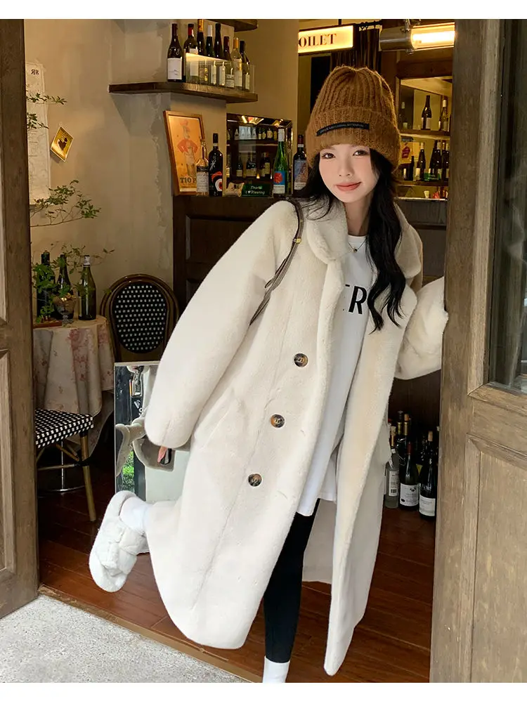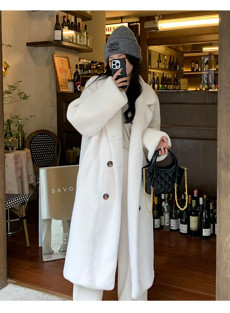 DERMEARNE Long Winter Coat Women Faux Mink Fur Turn Down Collar Fluffy Jackets Double Breasted Fashion Plush Coats Loose Warm Outerwears