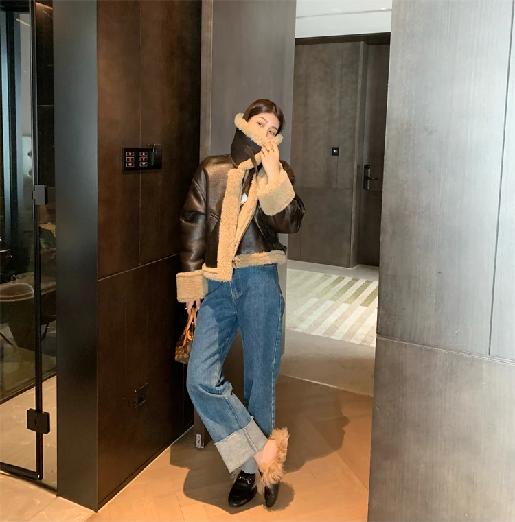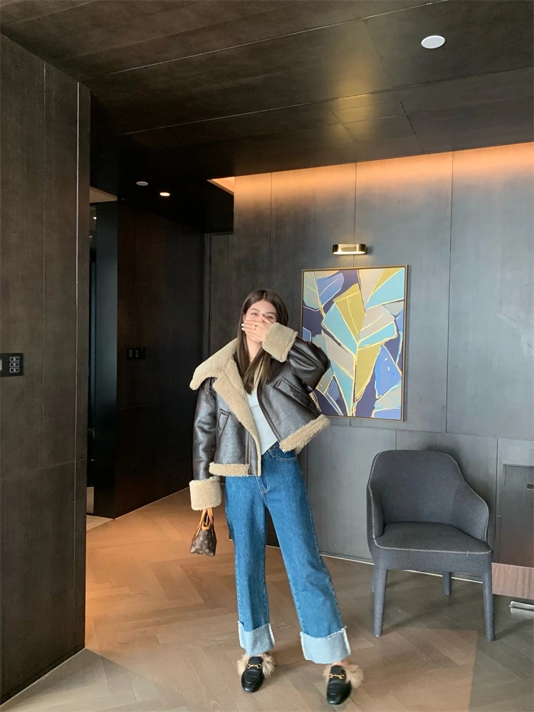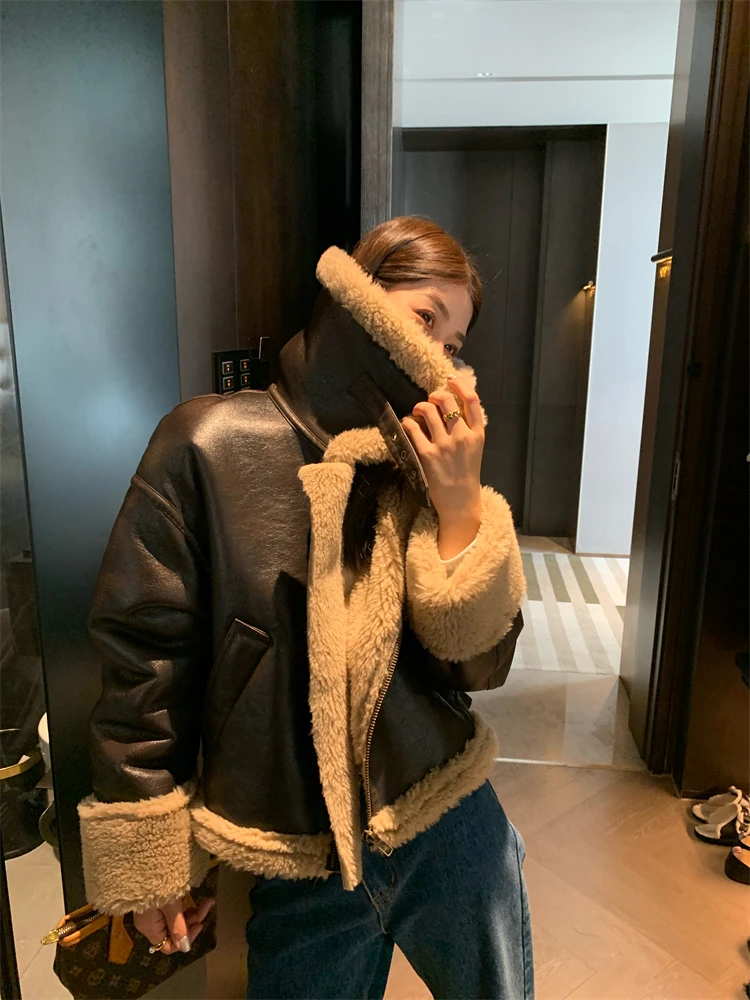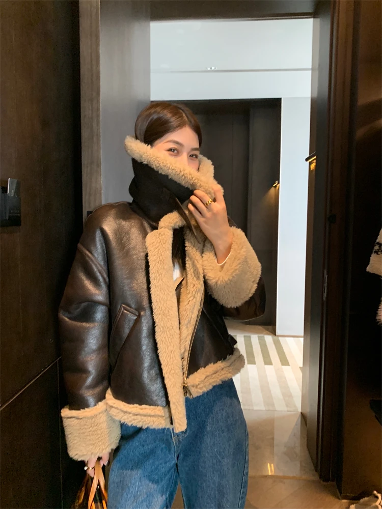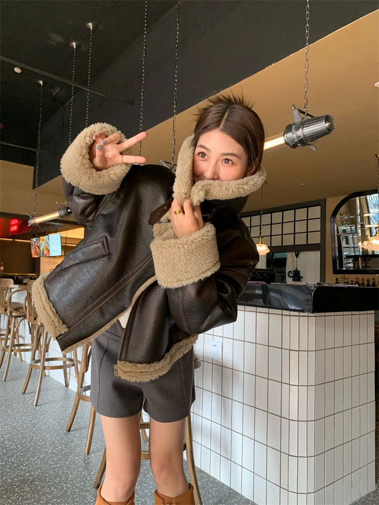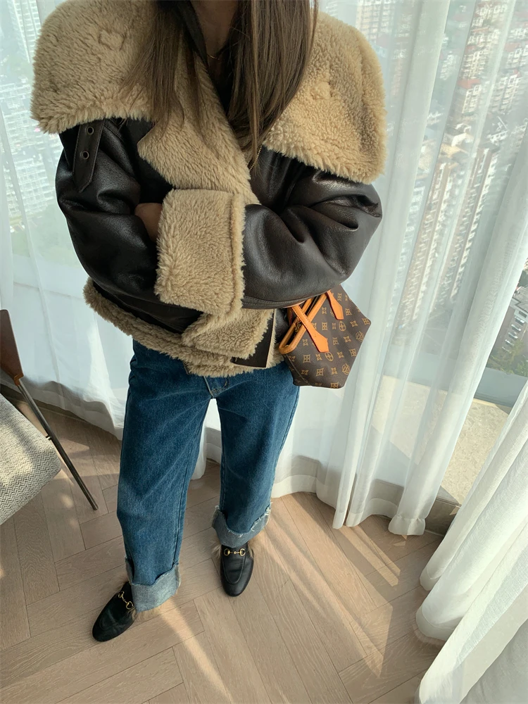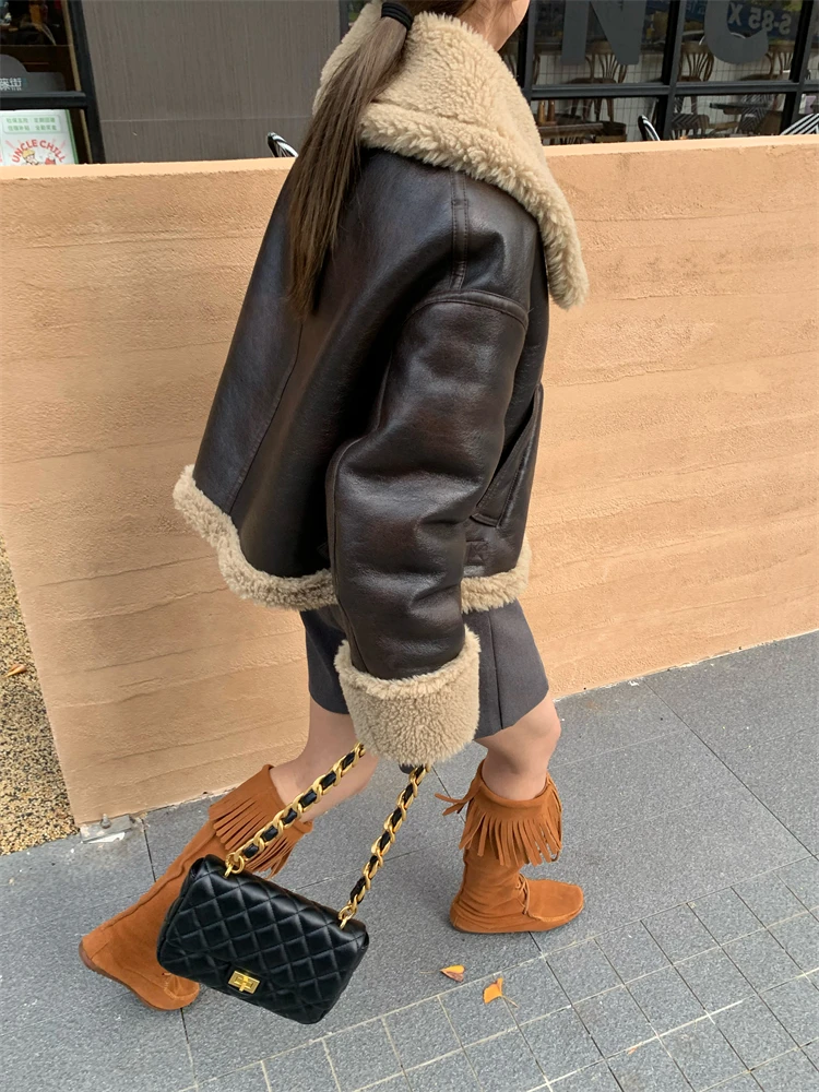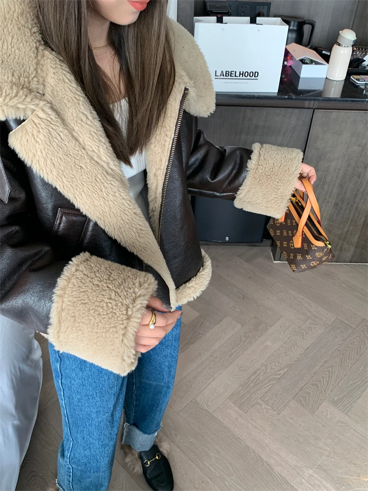 DERMEARNE LY VAREY LIN New Autumn Winter Streetwear Faux Leather Lamb Fur Short Jacket Women Vintage Loose Thick Warm Moto Biker Pu Coat