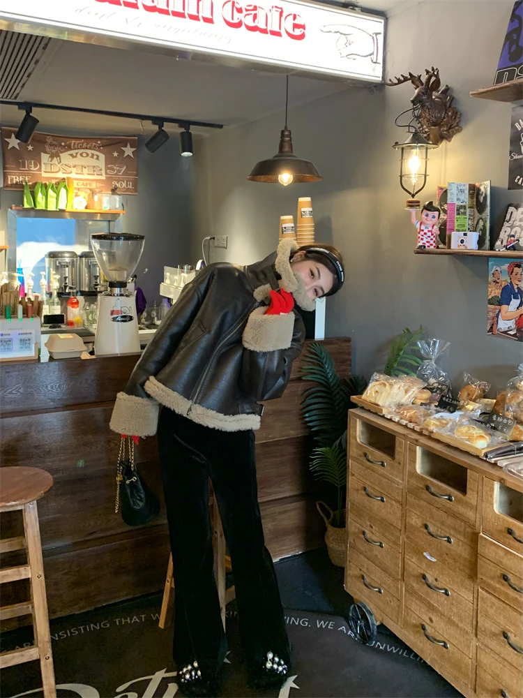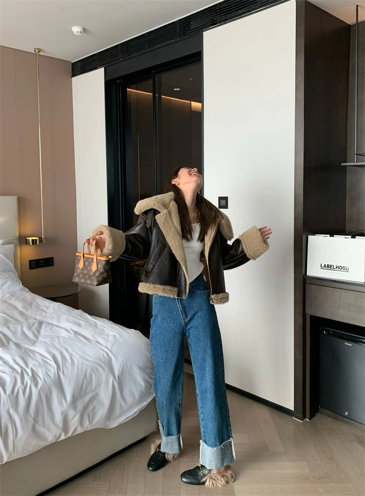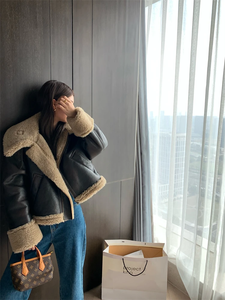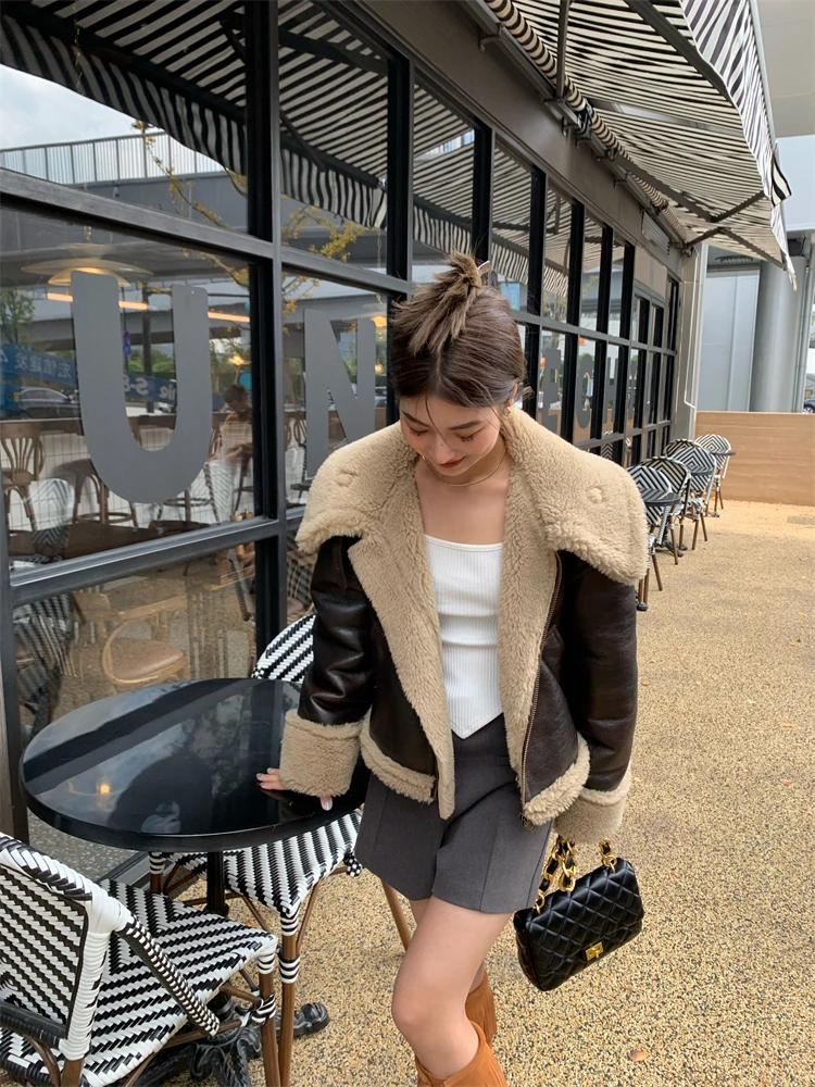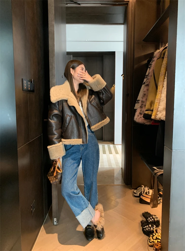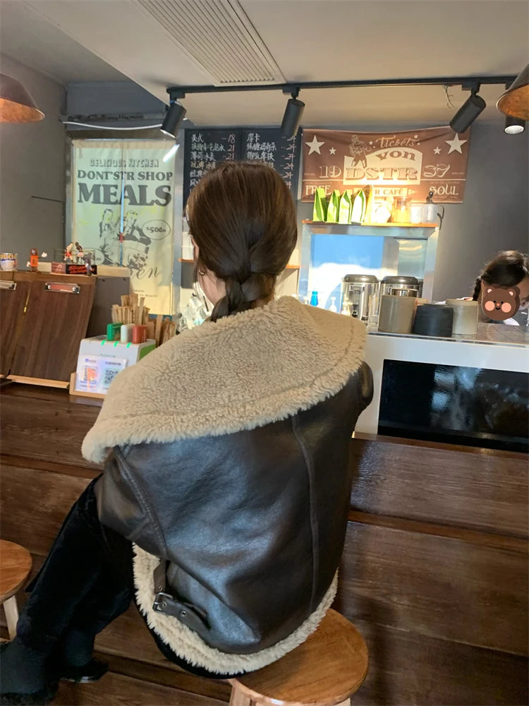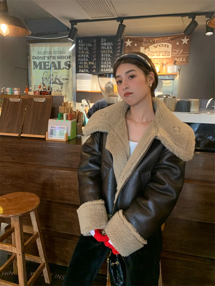 DERMEARNE LY VAREY LIN New Autumn Winter Streetwear Faux Leather Lamb Fur Short Jacket Women Vintage Loose Thick Warm Moto Biker Pu Coat