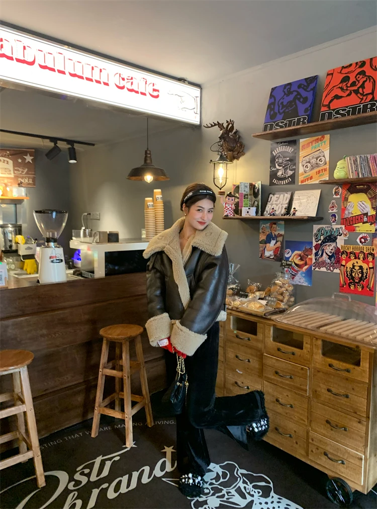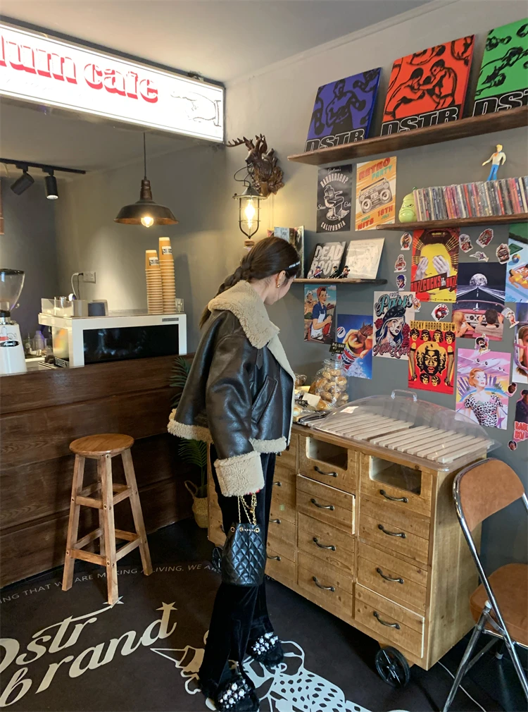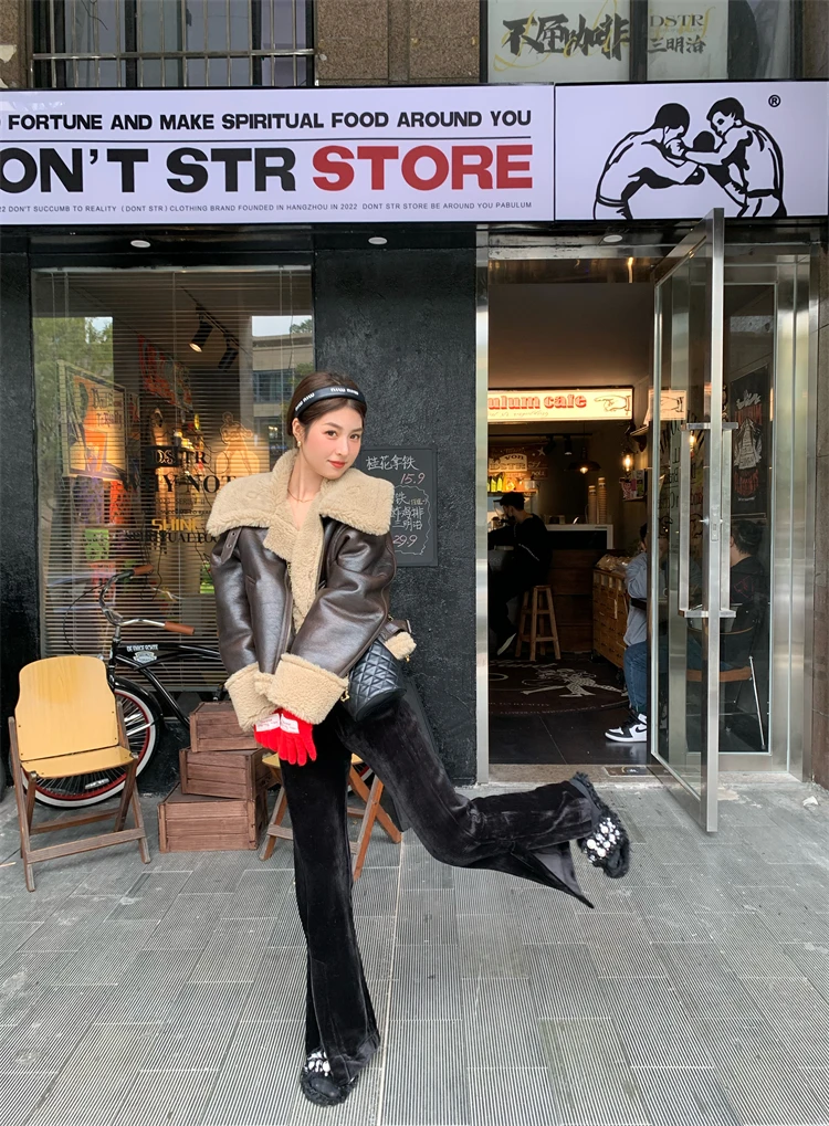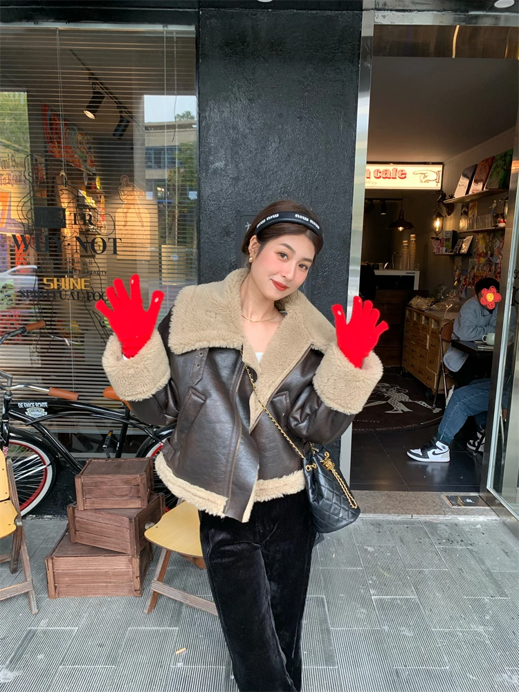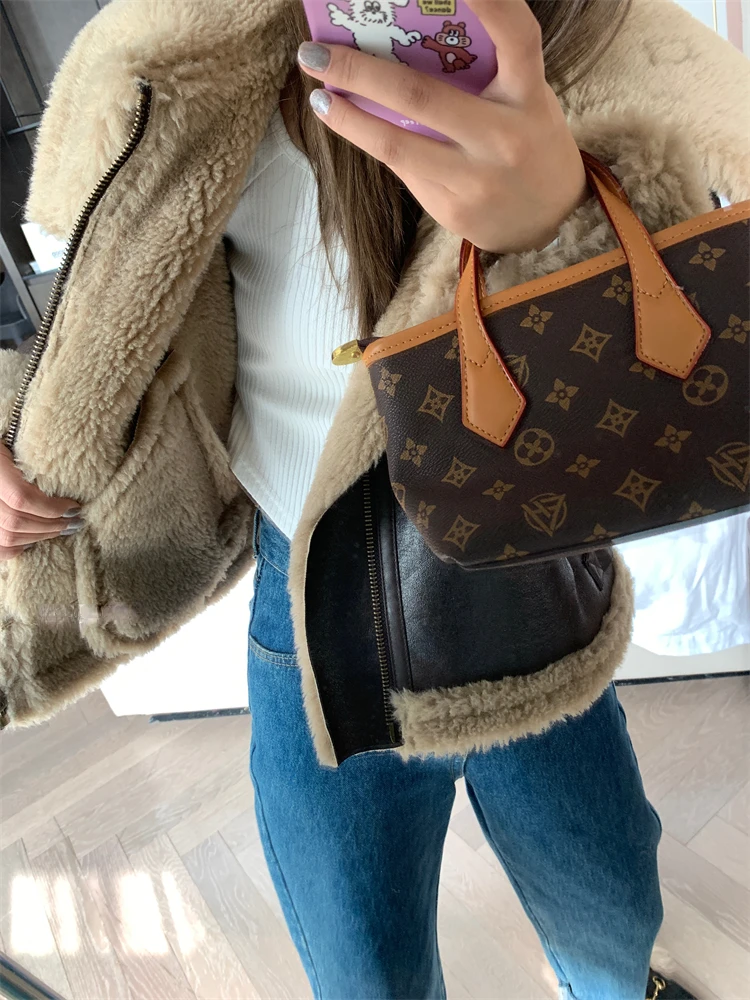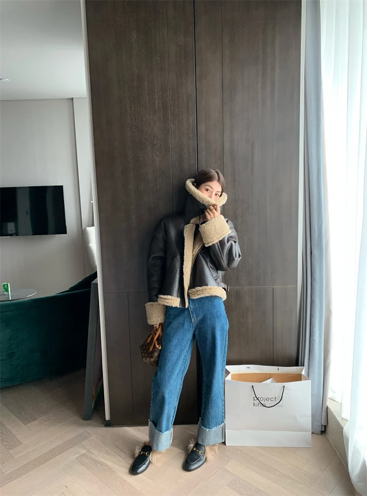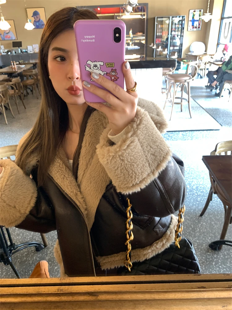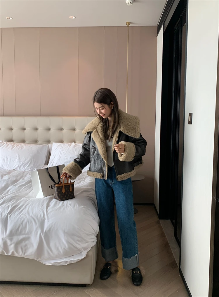 DERMEARNE LY VAREY LIN New Autumn Winter Streetwear Faux Leather Lamb Fur Short Jacket Women Vintage Loose Thick Warm Moto Biker Pu Coat