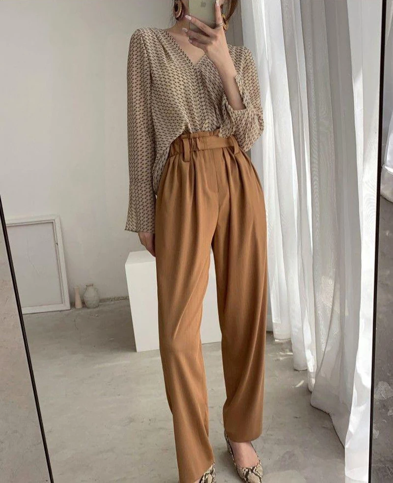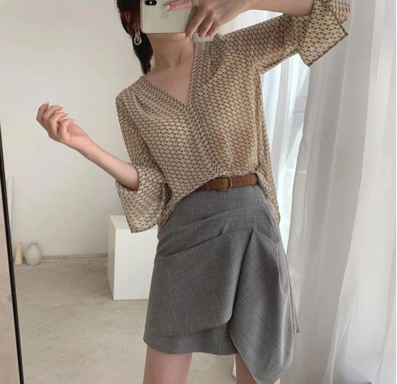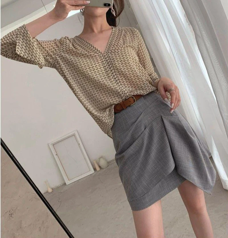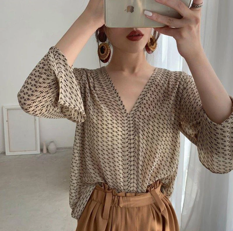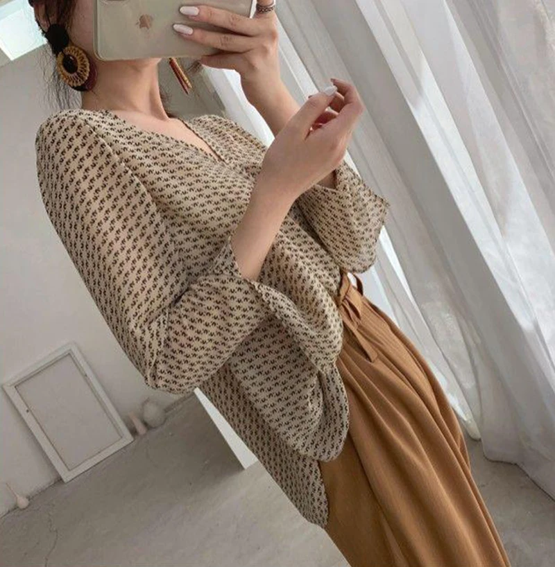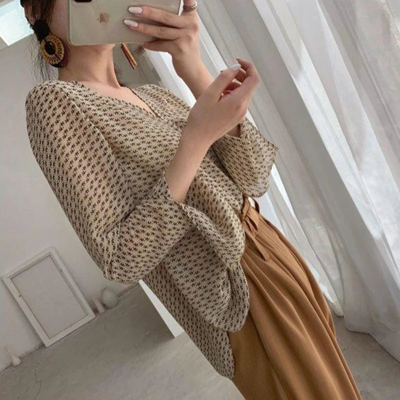 DERMEARNE MEXZT Vintage Blouses Women Elegant V Neck Print Long Sleeve Loose Shirts Office Lady Casual Chiffon Chic Sun Protection Tops
