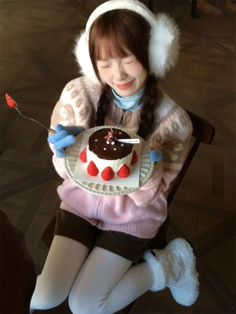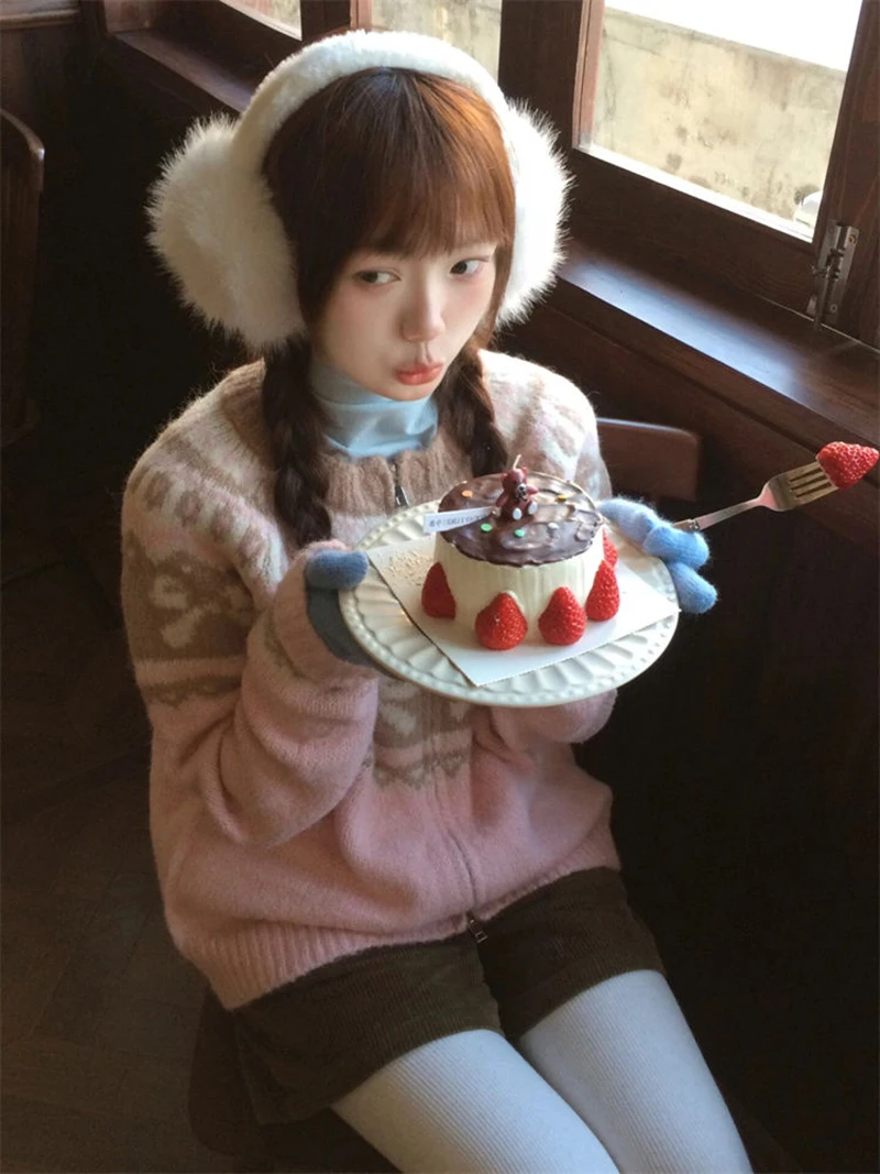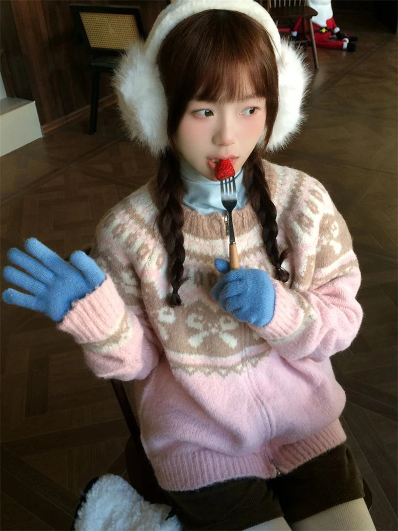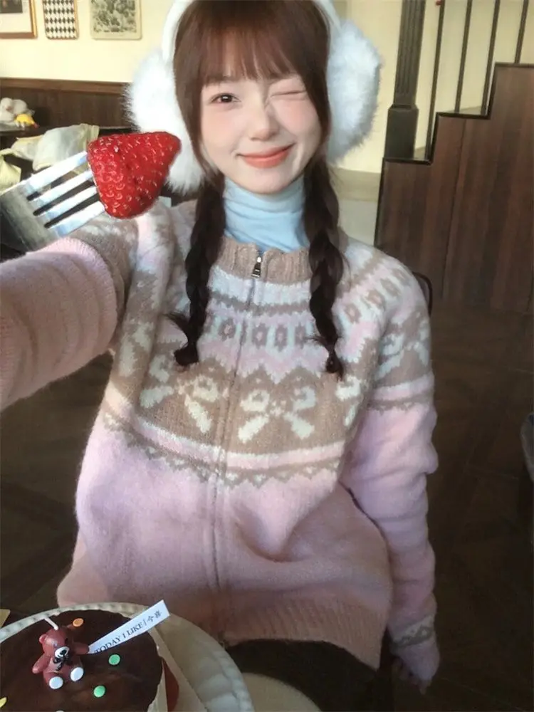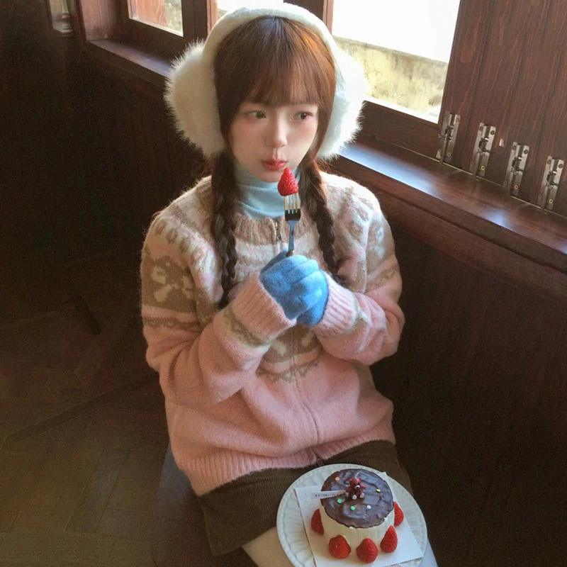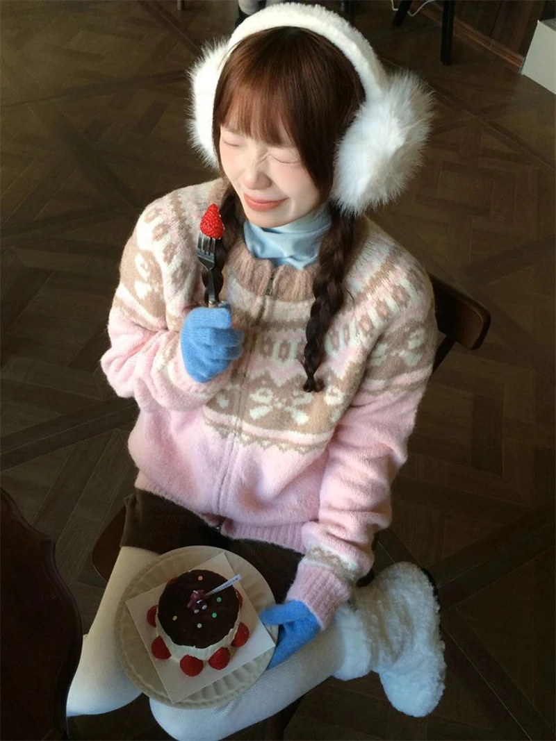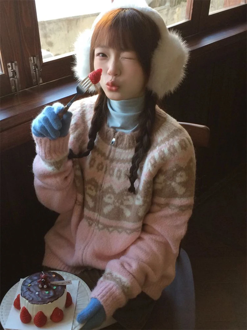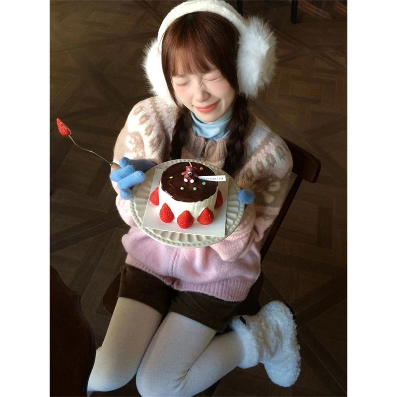 DERMEARNE MEXZT Vintage Print Knitted Cardigan Women Japanese Long Sleeve Sweater Outerwear Winter Aesthetic Pink Knitwear Korean Jumpers