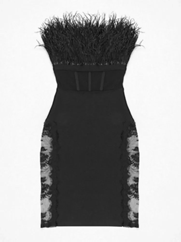 New Arrival Black Color Women Sexy Strapless Feathers Lace Bodycon Mini Dress Rayon Bandage Nightclub Party Dress Vestido