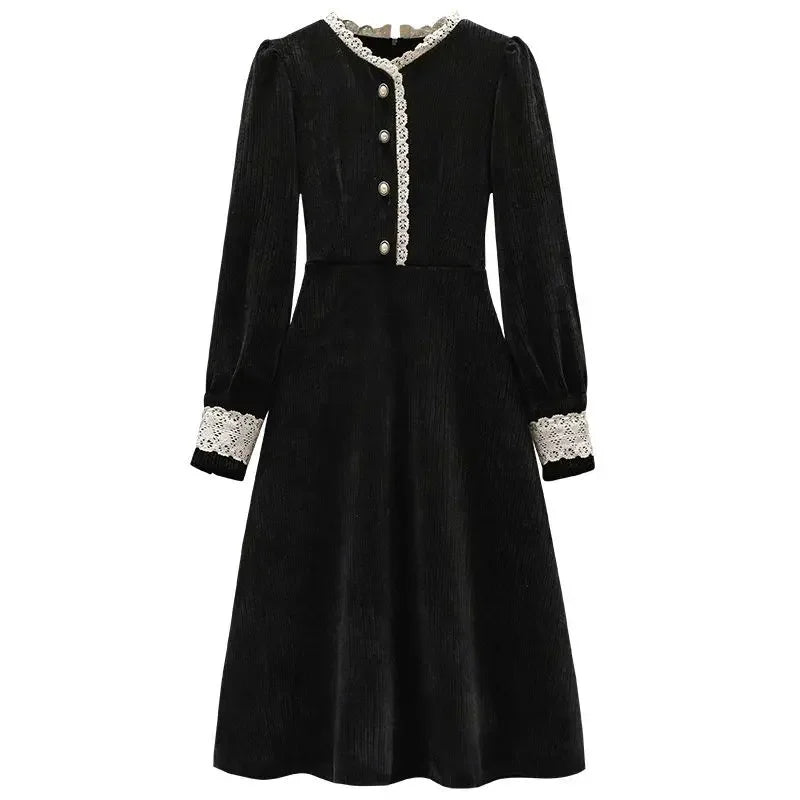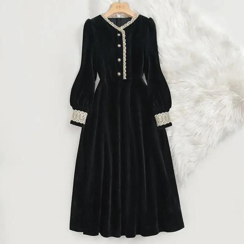 DERMEARNE New Autumn Winter High End Velvet Dress Women French Vintage Slim Lace Patchwork Elegant Dresses Hepburn Style Fashion Vestidos