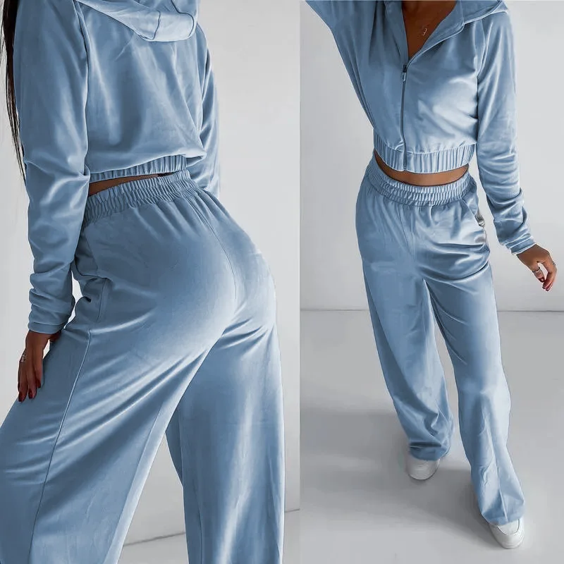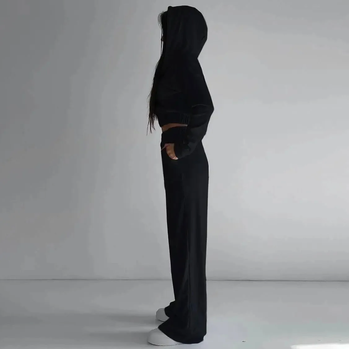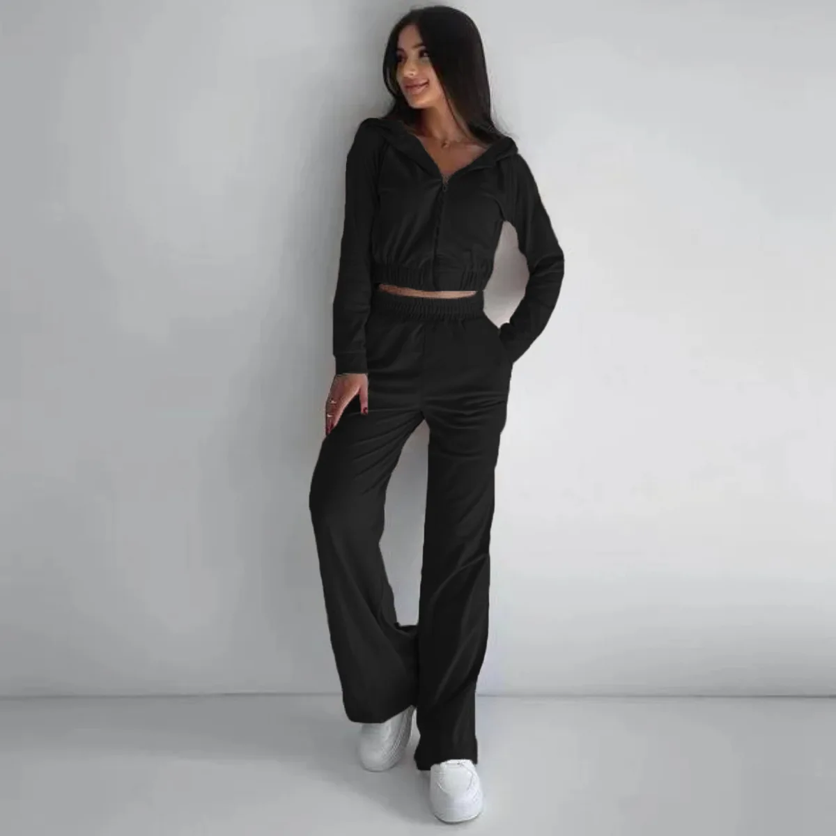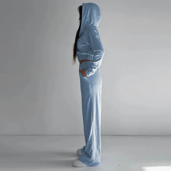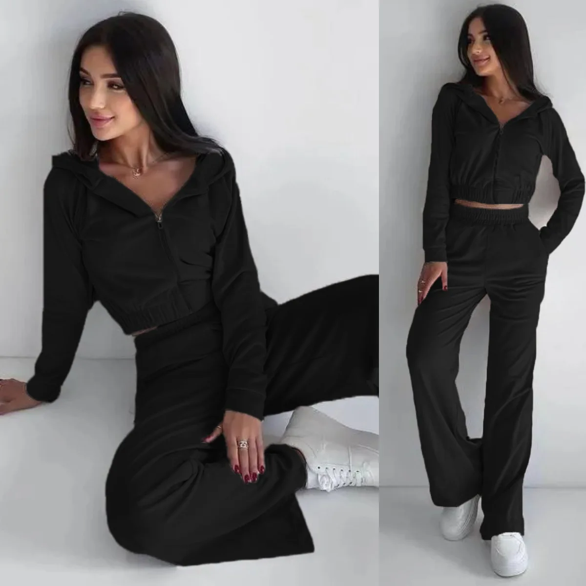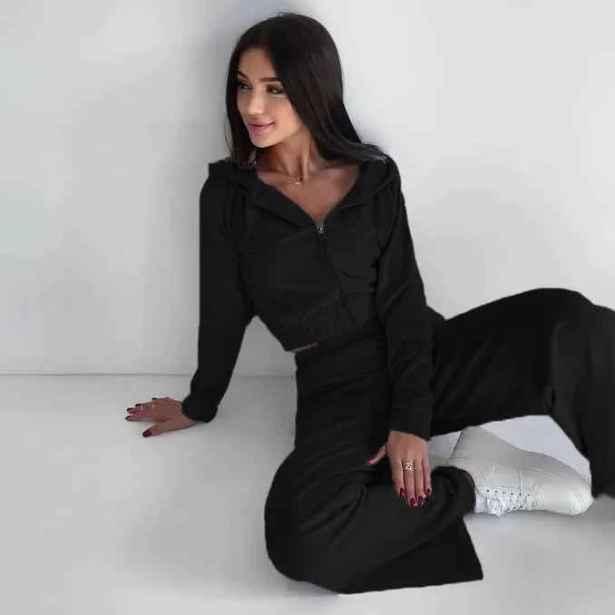 New Women's Suit Hooded Long-Sleeved Short Coat And Wide-Leg Pant Outfits Fall Solid Color Ladies Two-Piece Set