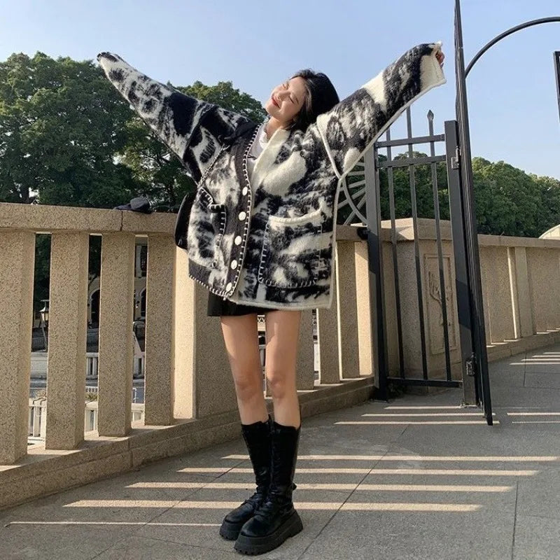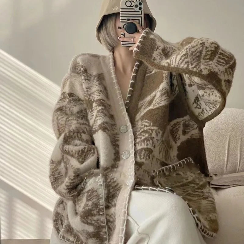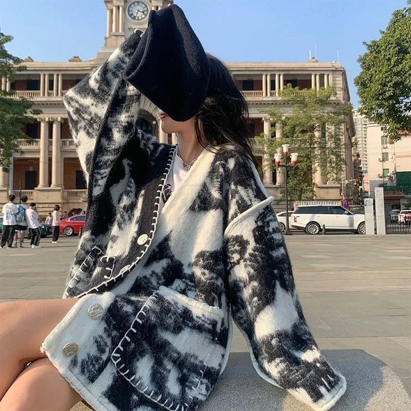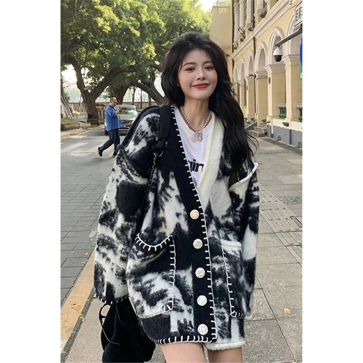 Dermearne Oversized Tie-dye Cardigan Sweater Women's Thickened Retro Casual V-neck Loose Knitted Jacket