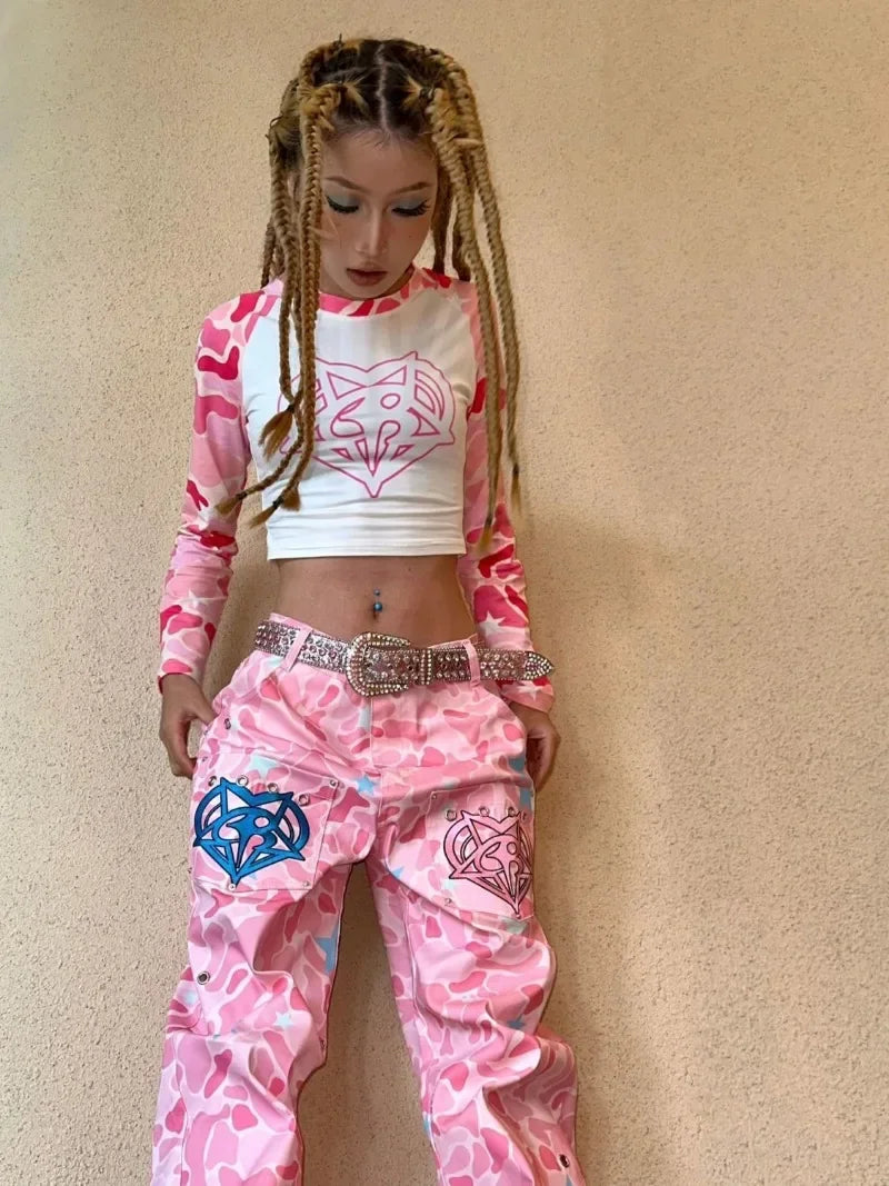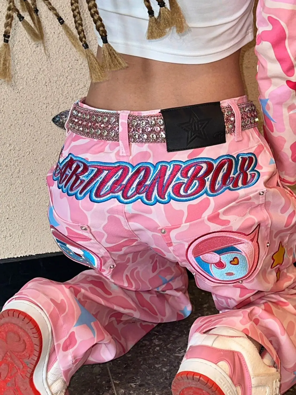 Pink camouflage cartoon pattern straight Y2K jeans womens street hip hop design niche hot girl street wide leg baggy pants 2000s