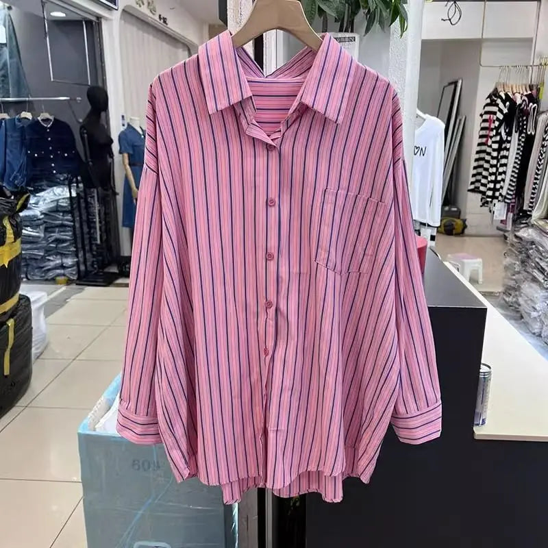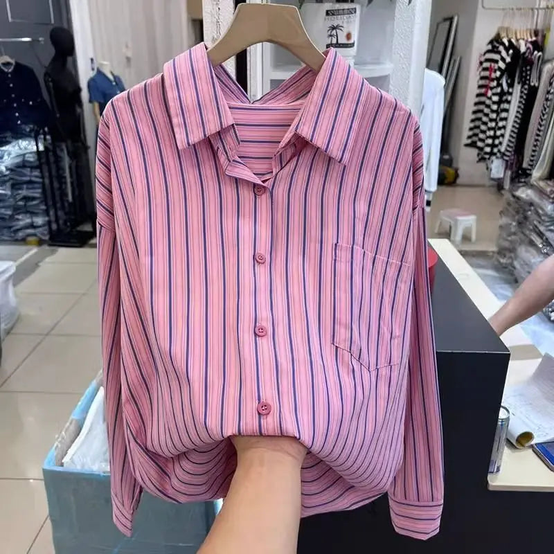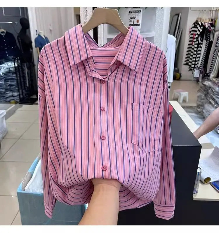 DERMEARNE Pink Striped Long Sleeve Blouse Spring New Polo Neck Korean Loose Youth All-match Trend Shirt Tops Casual Fashion Women Clothing