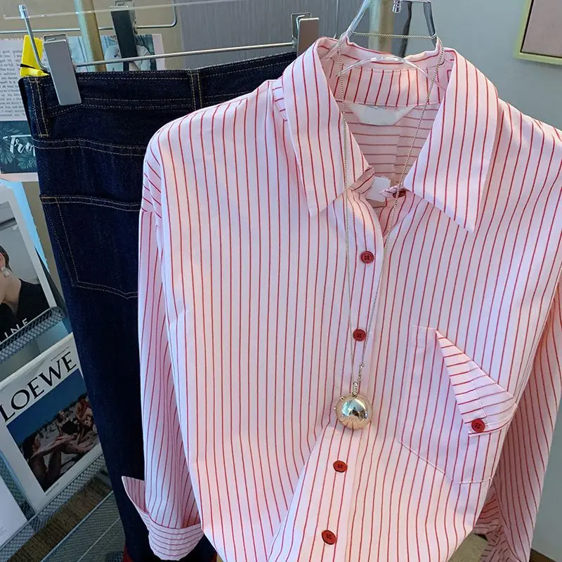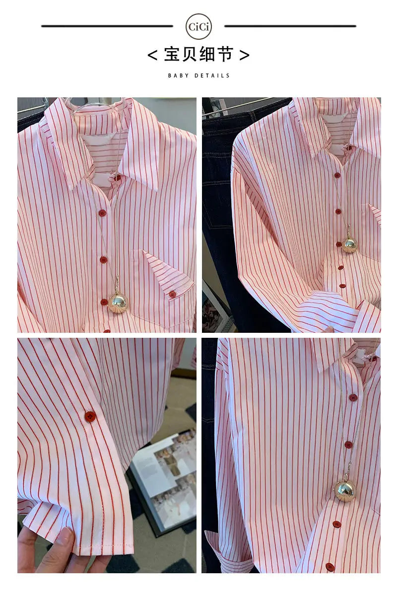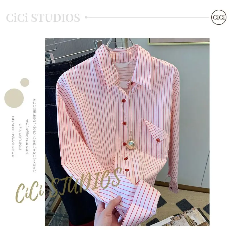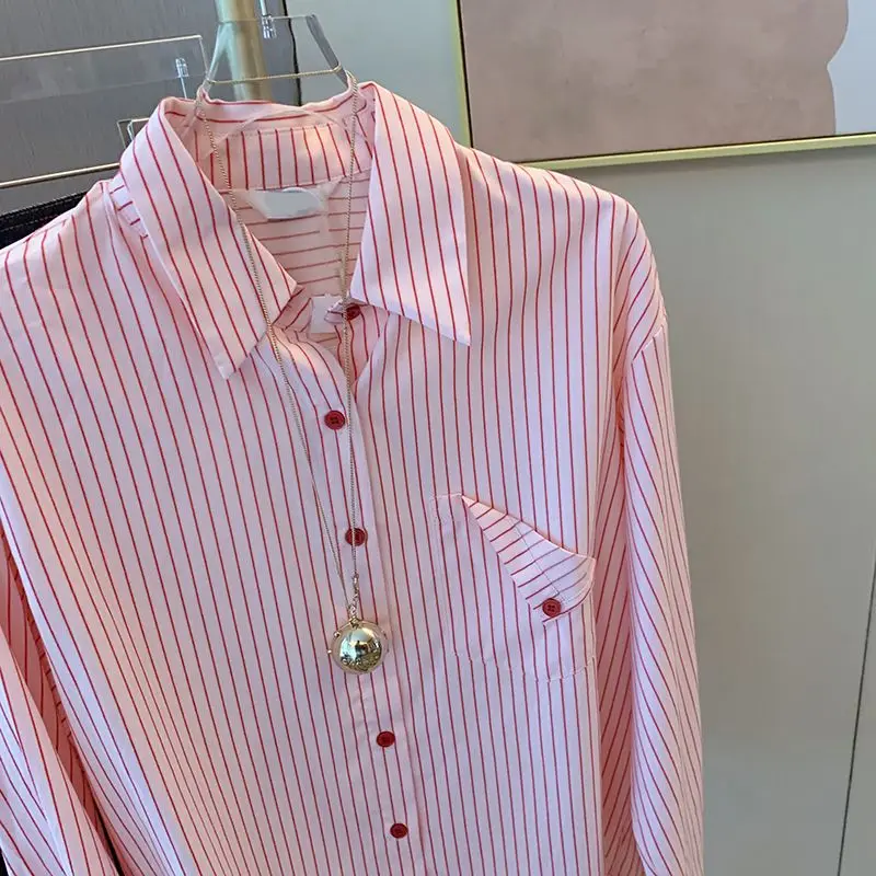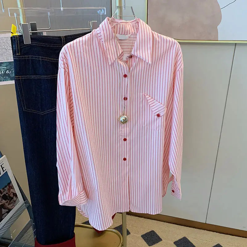DERMEARNE Pink Trend Striped Loose Blouse Spring New Long Sleeve Polo Neck Korean All-match Shirt Tops Fashion High Street Women Clothing