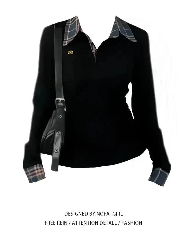 DERMEARNE Polo Neck Plaid Patchwork Embroidery T Shirts Spring Autumn Fake Two-piece Slim High Street Tops Fashion Casual Women Clothing