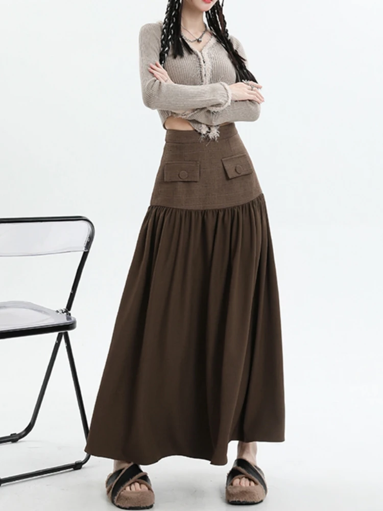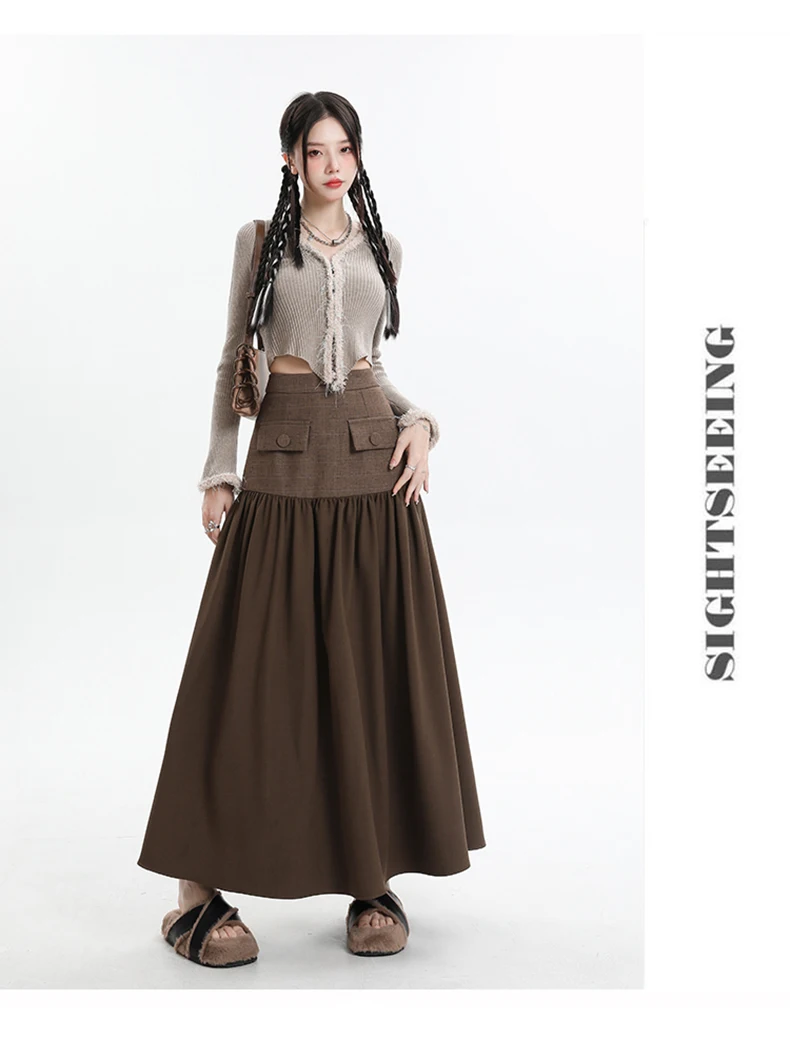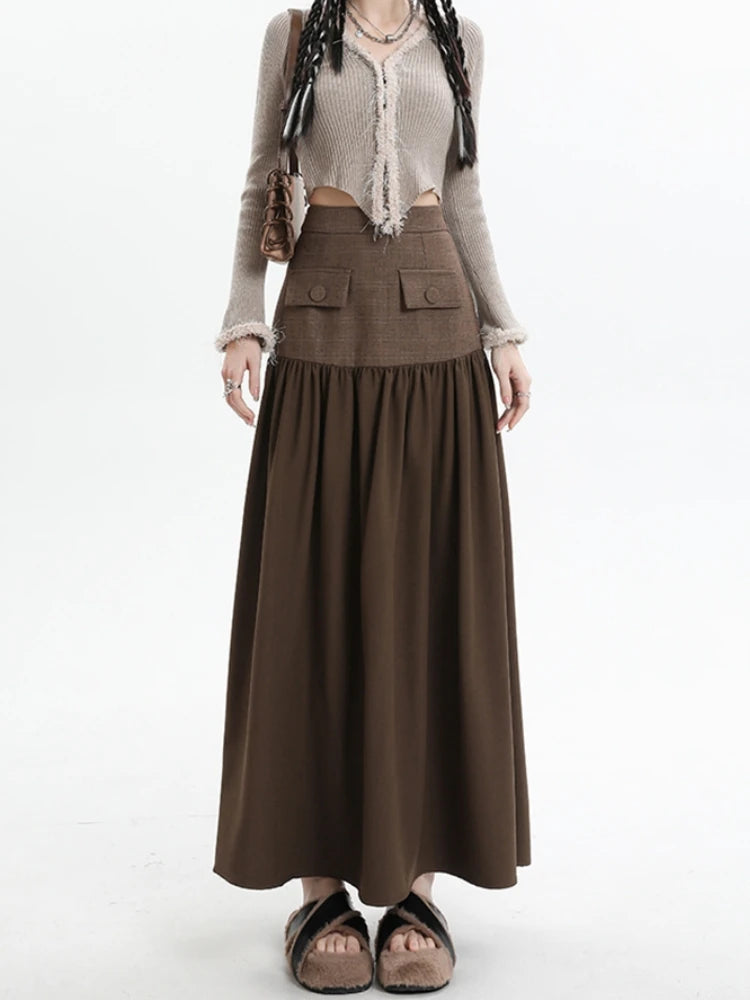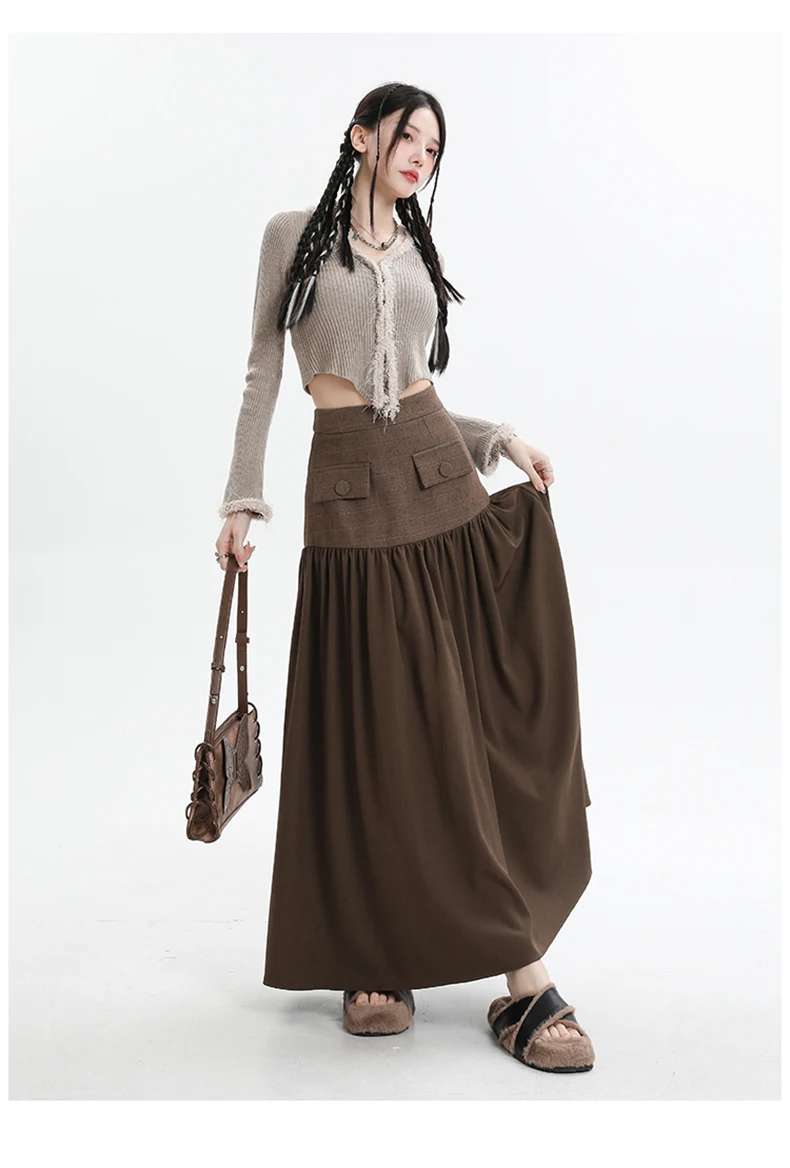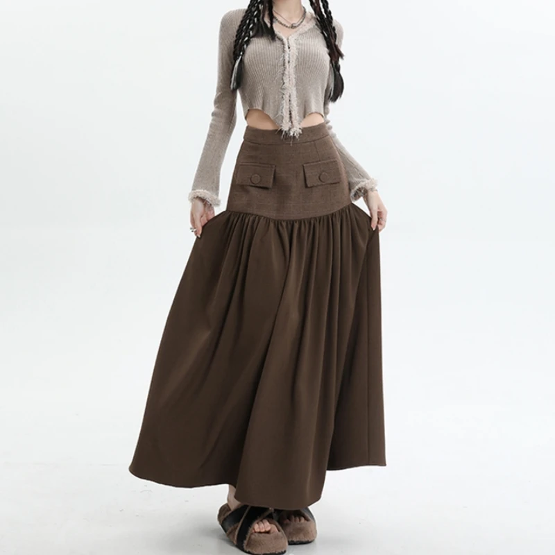 DERMEARNE 2025 Autumn Winter Long Skirt Women Maxi Skirt Goth Vintage High Waisted Patchwork Ruffle Pleated Skirt Black Khaki