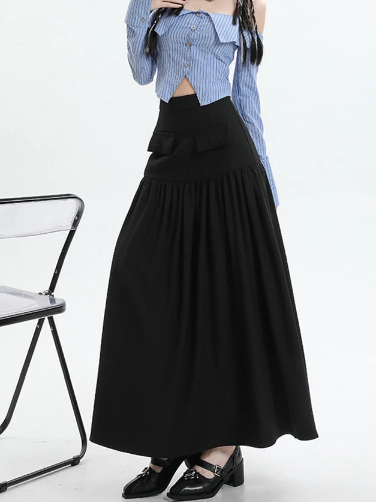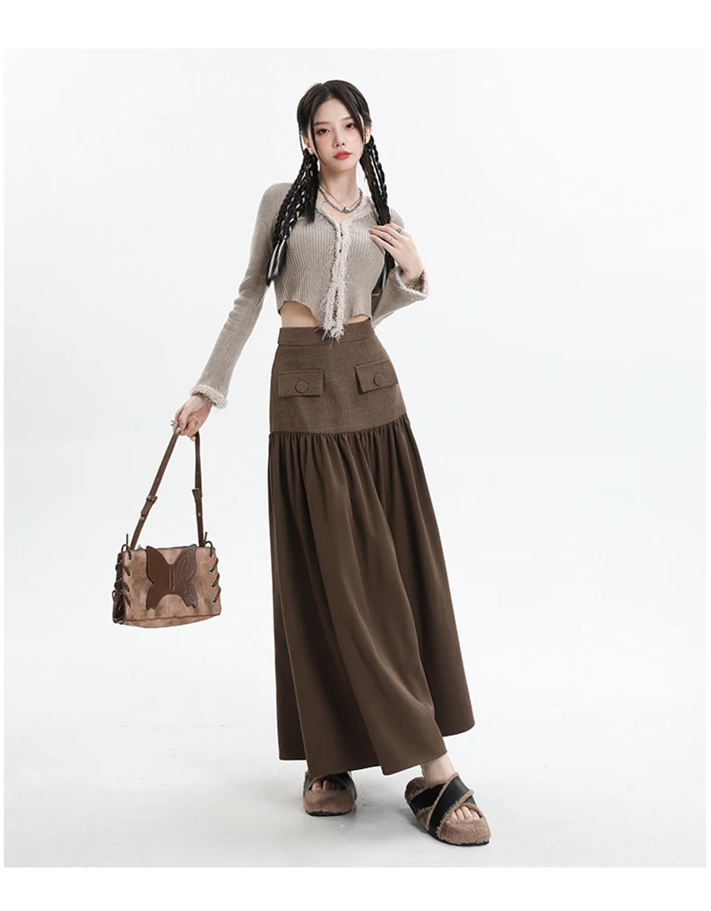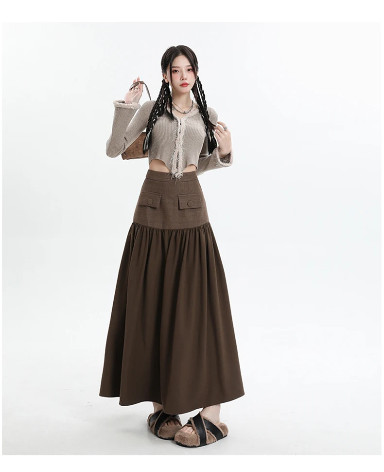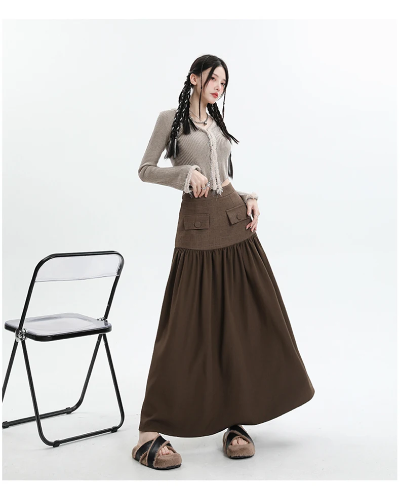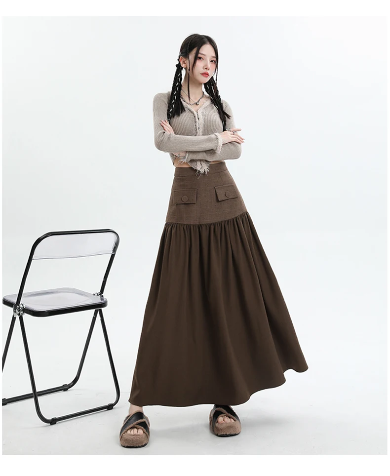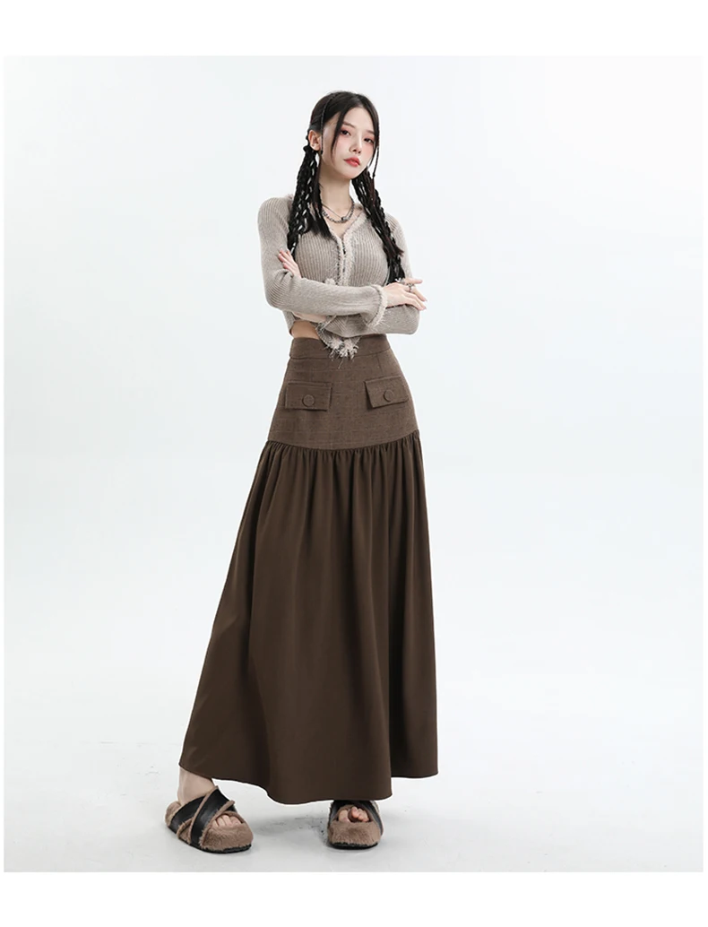 DERMEARNE 2025 Autumn Winter Long Skirt Women Maxi Skirt Goth Vintage High Waisted Patchwork Ruffle Pleated Skirt Black Khaki