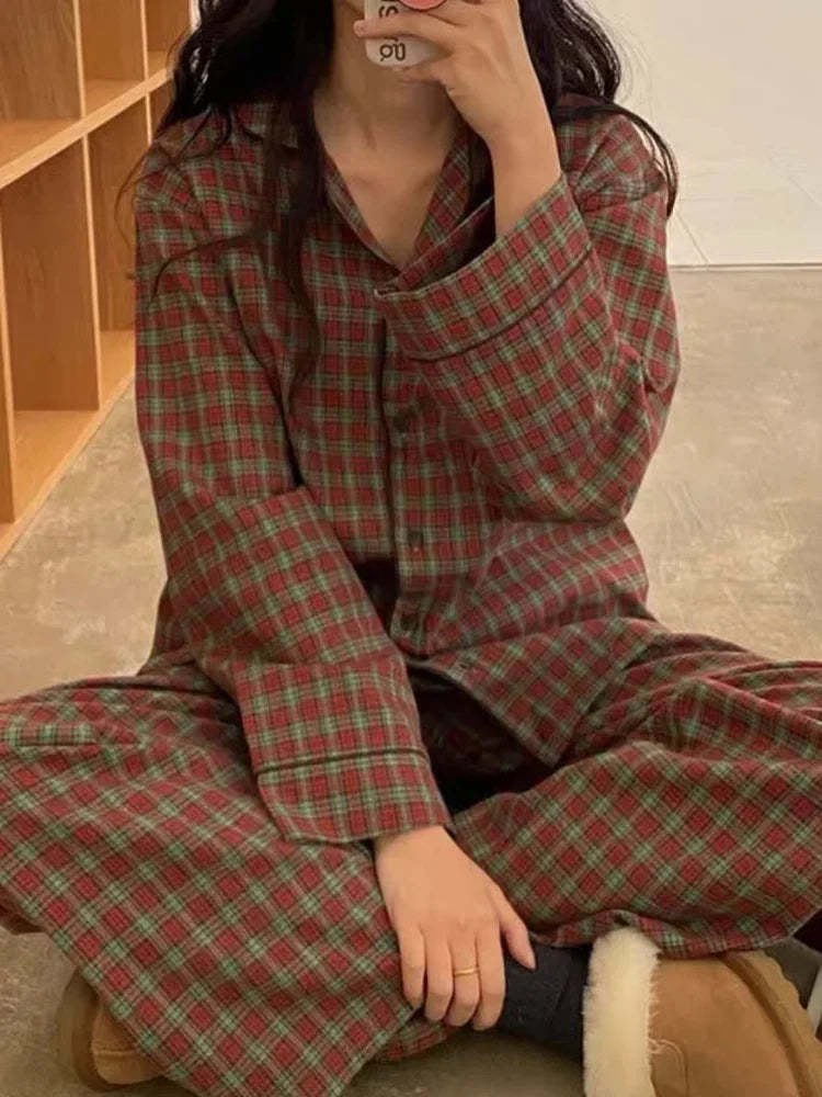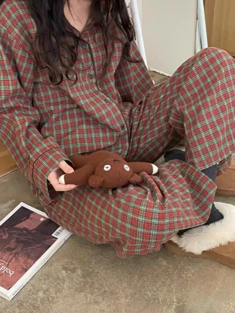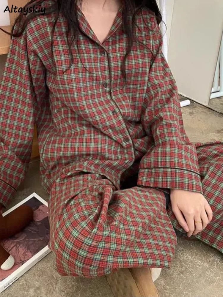 DERMEARNE Red Plaid Pajama Sets Women Vintage Loose Panelled Fashion Chic Casual Sleepwear Spring Korean Style College Girls Popular Soft