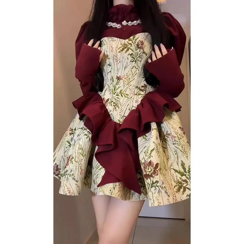 DERMEARNE Red Suit Women Dress Vintage Fairy Princess Long Sleeve Christmas New Year Dresses One-Piece Evening Party New Korean Chic Robes