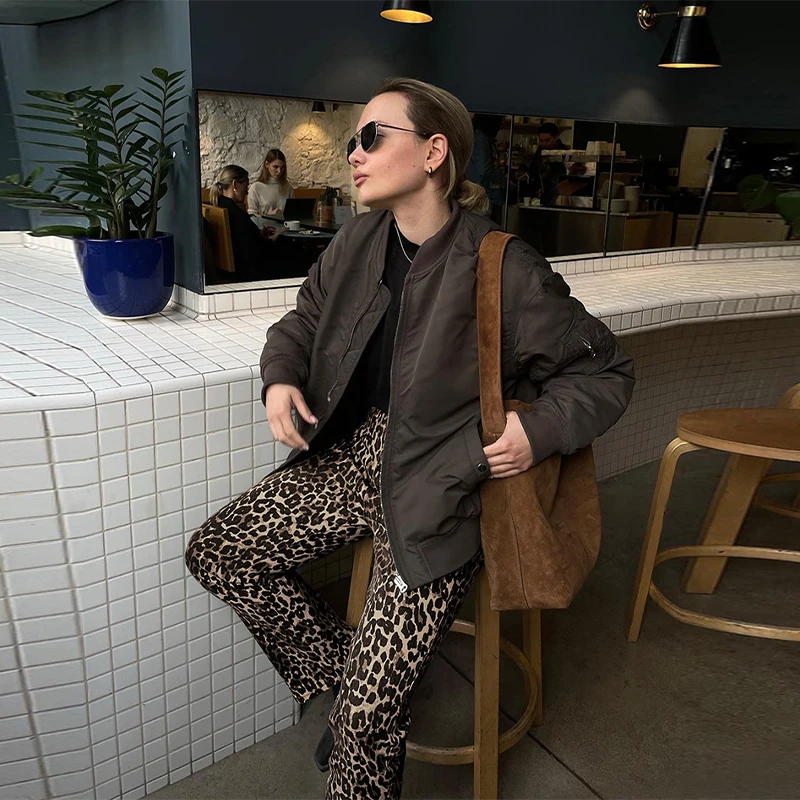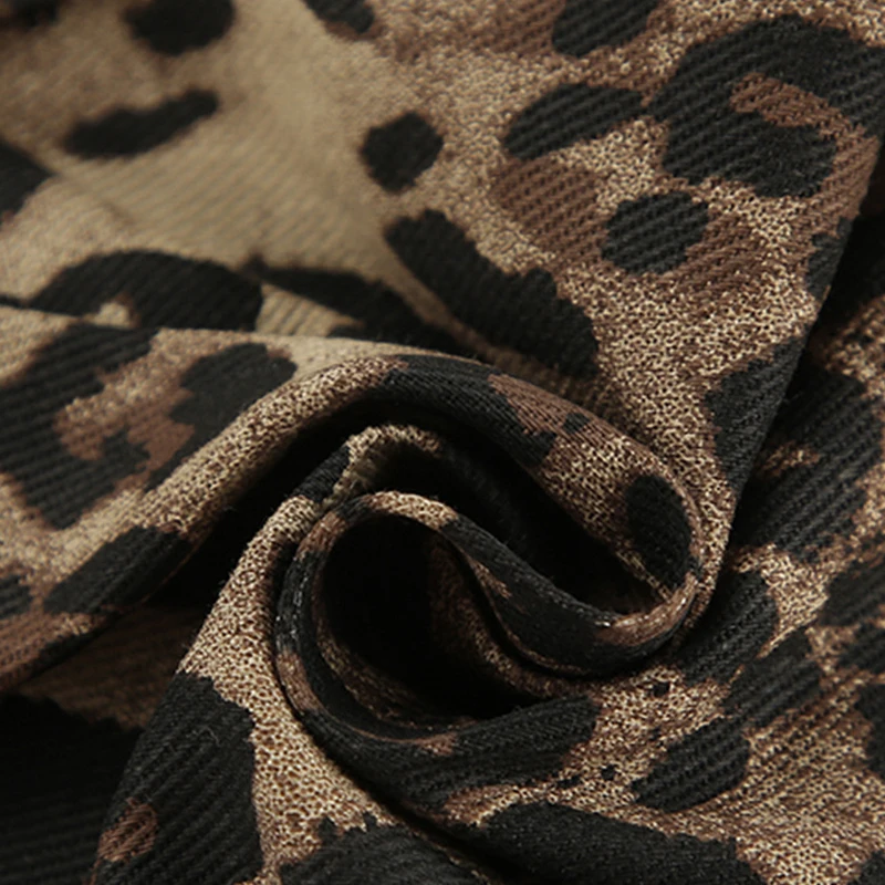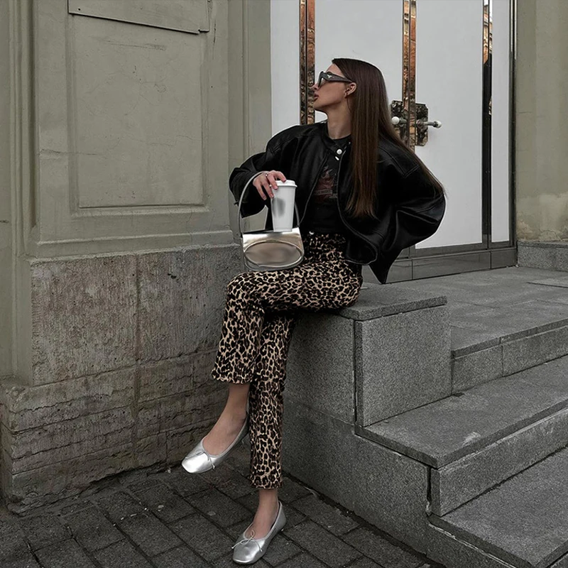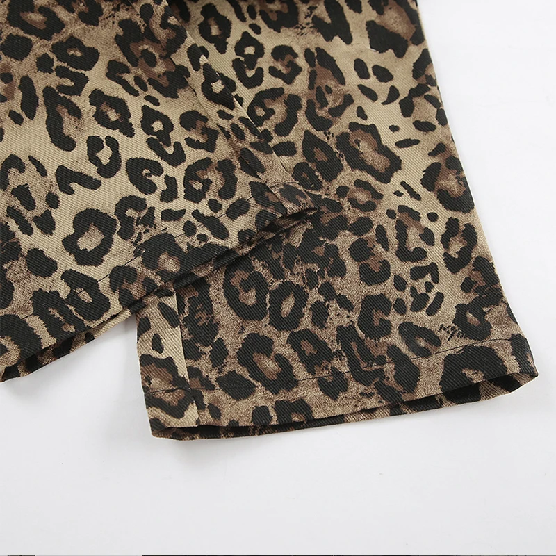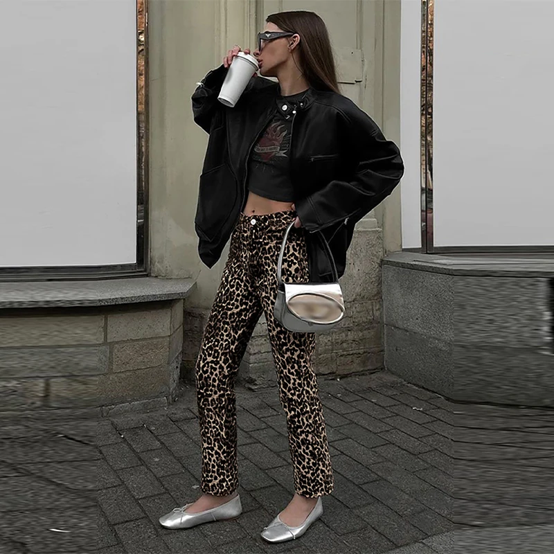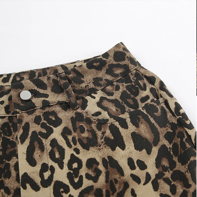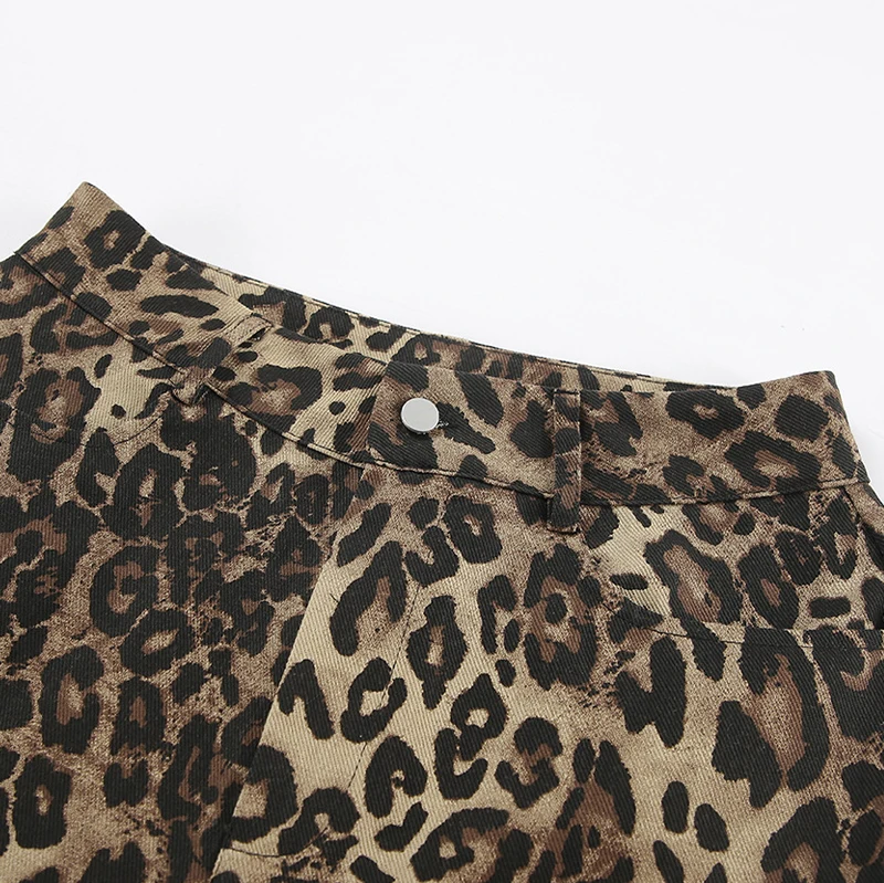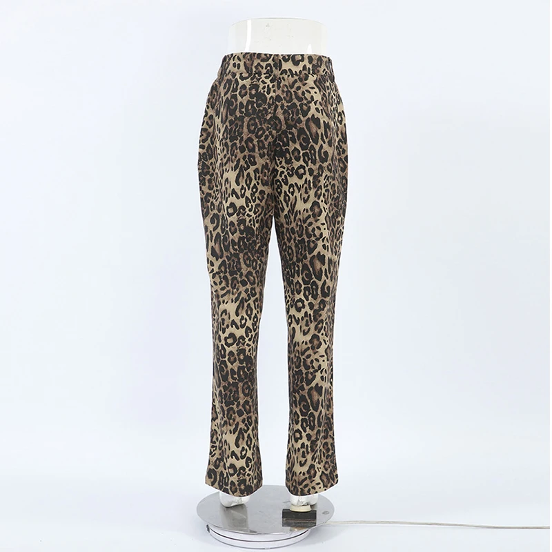 DERMEARNE Retro Leopard Print Women Straight Leg Pants Casual Slim High Waisted Pocket Pencil Trousers Female Fashion Streetwear