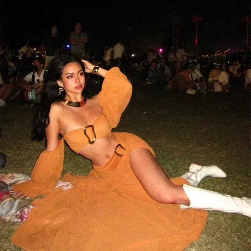 DERMEARNE Sexy Bikini Top Skirt Set Women Long Lantern Sleeve Off Shoulder Cropped Tops Pleated Split Skirts 2025 Summer Lady Beach Outfit