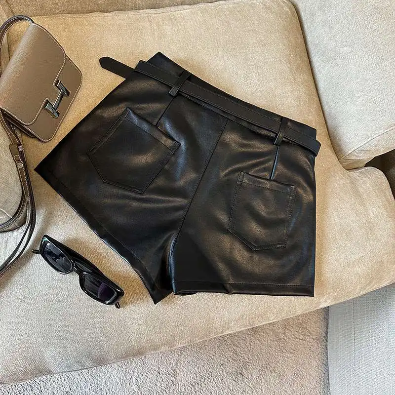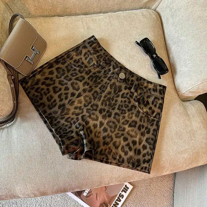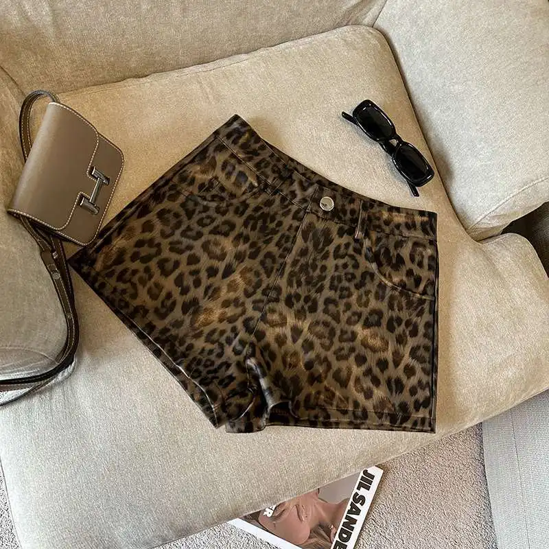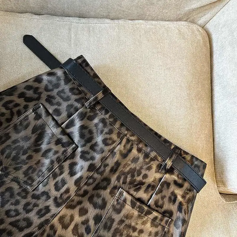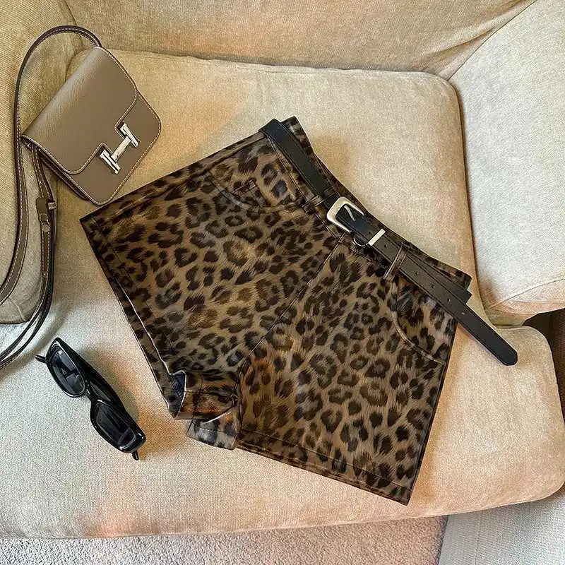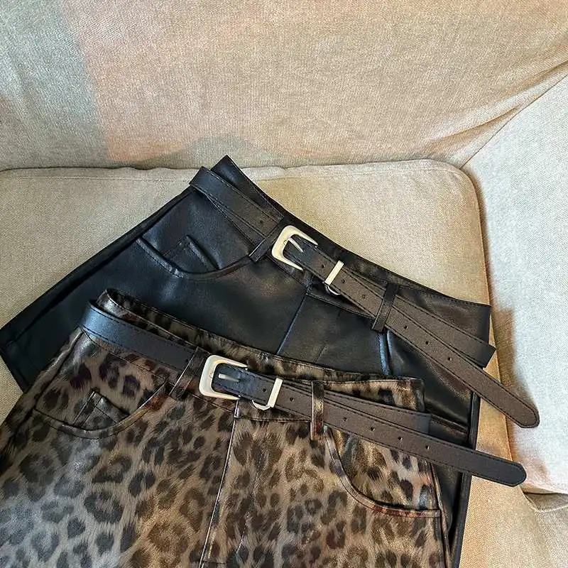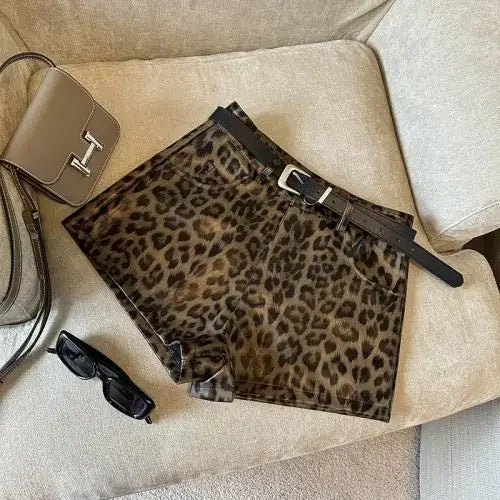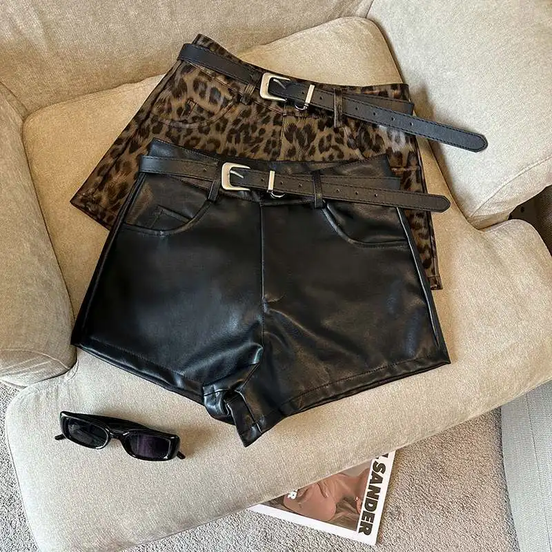 DERMEARNE Sexy Leopard Print PU Leather Shorts Women Black High Waist Leather Shorts with Belt