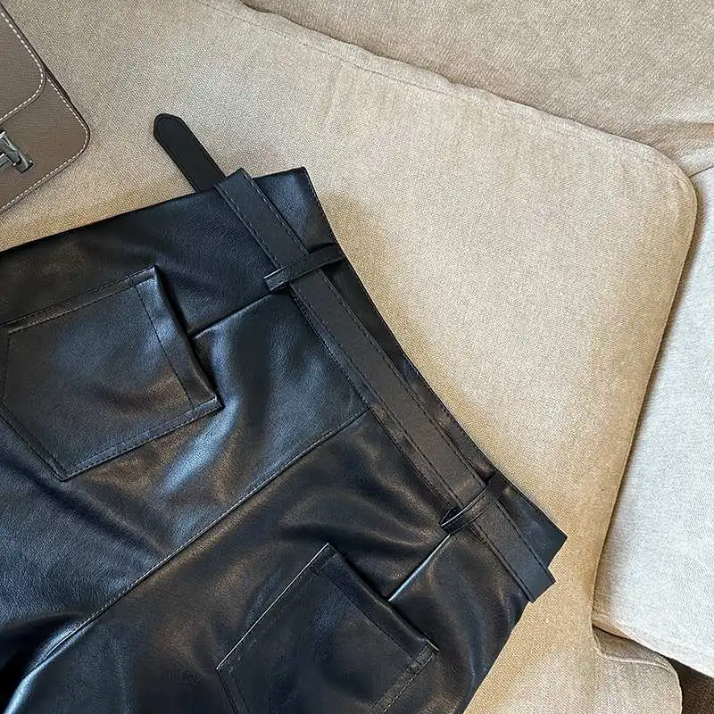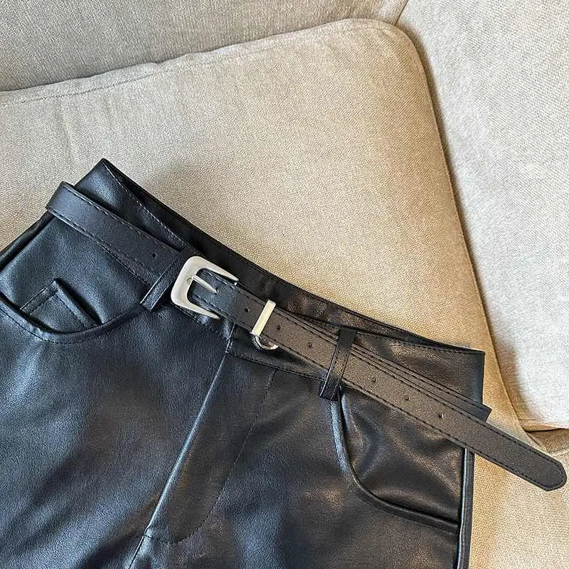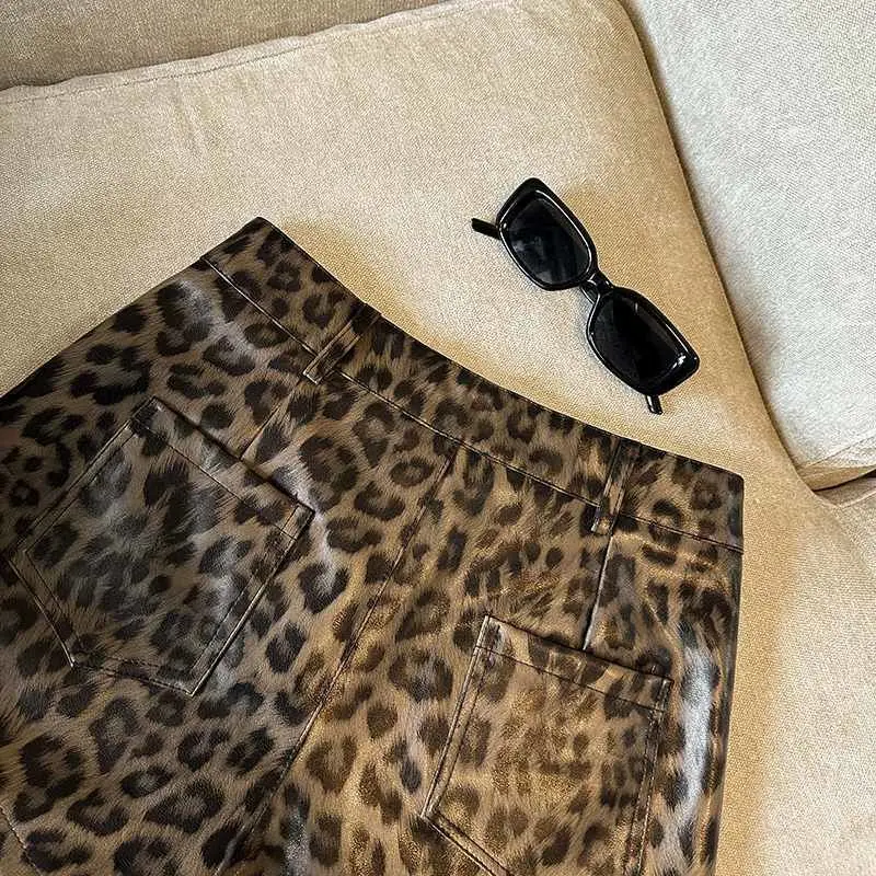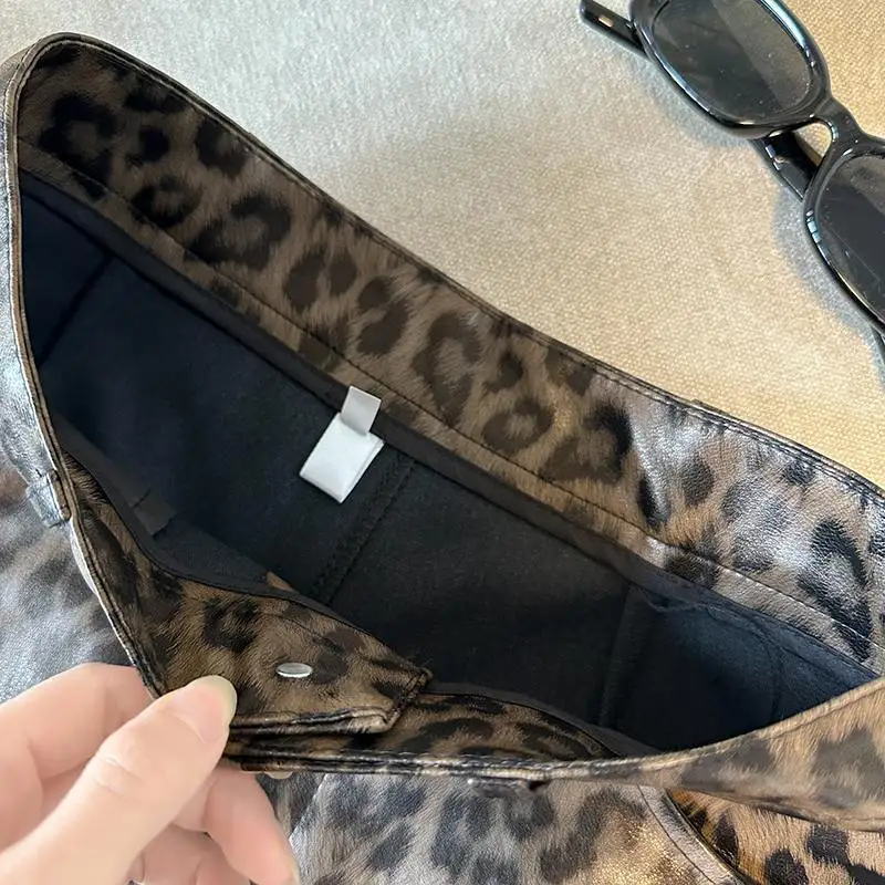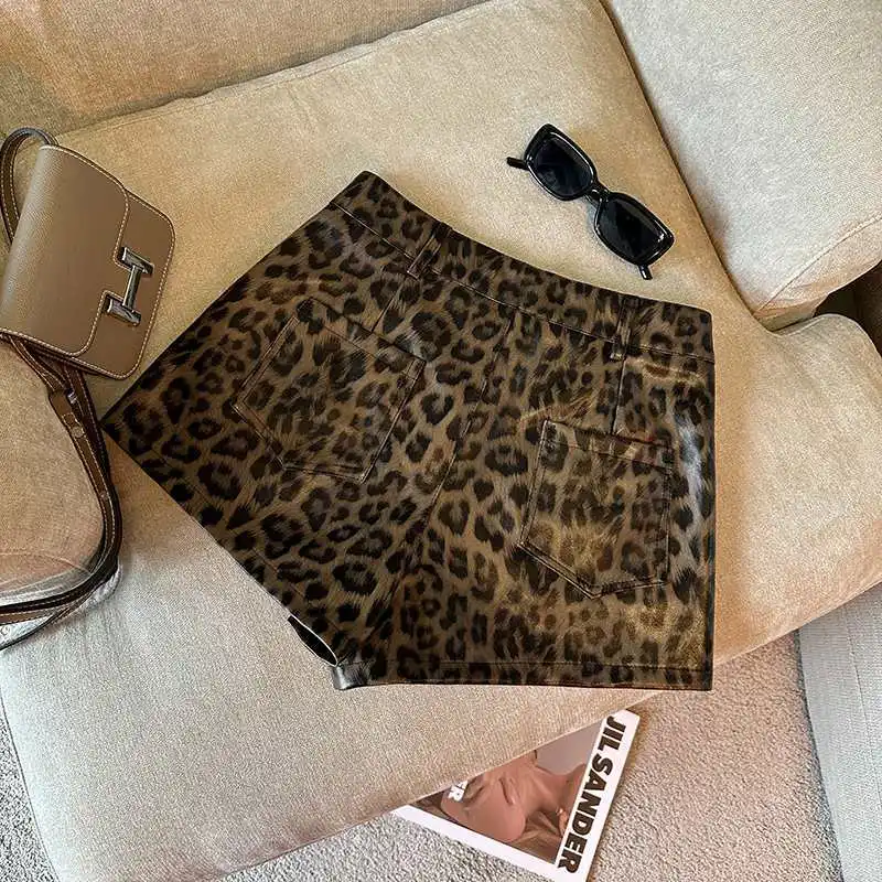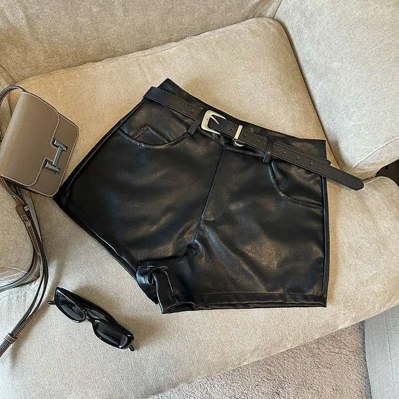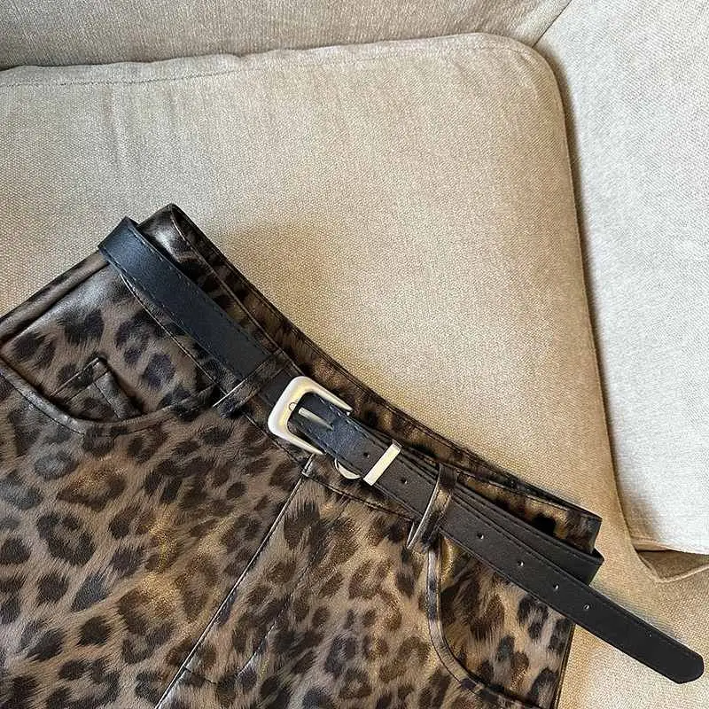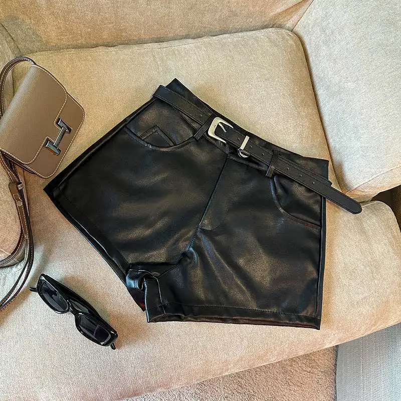 DERMEARNE Sexy Leopard Print PU Leather Shorts Women Black High Waist Leather Shorts with Belt