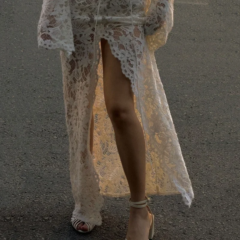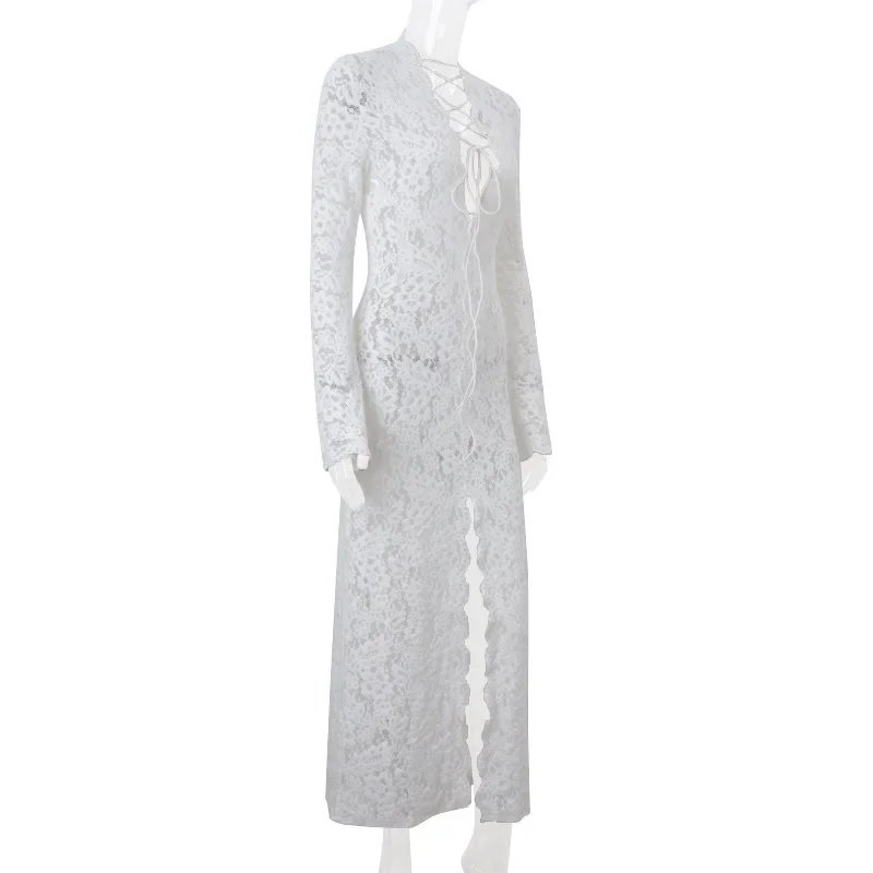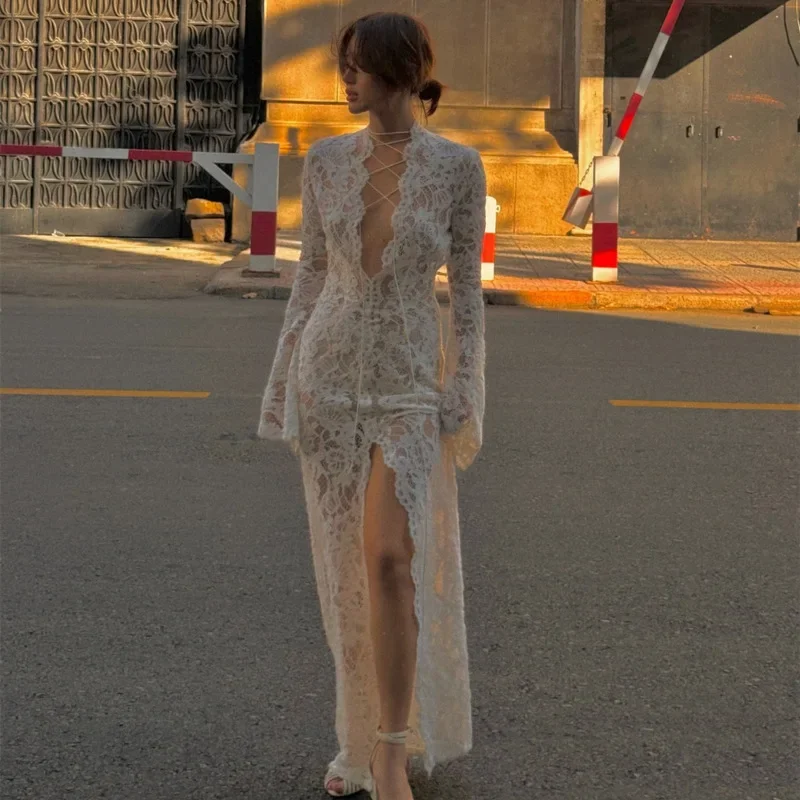DERMEARNE Sexy White Lace Printed Maxi Dress For Women See-Through Hollow Out Full Sleeve V Neck Slit Slim Long Dress Party Club Outfit