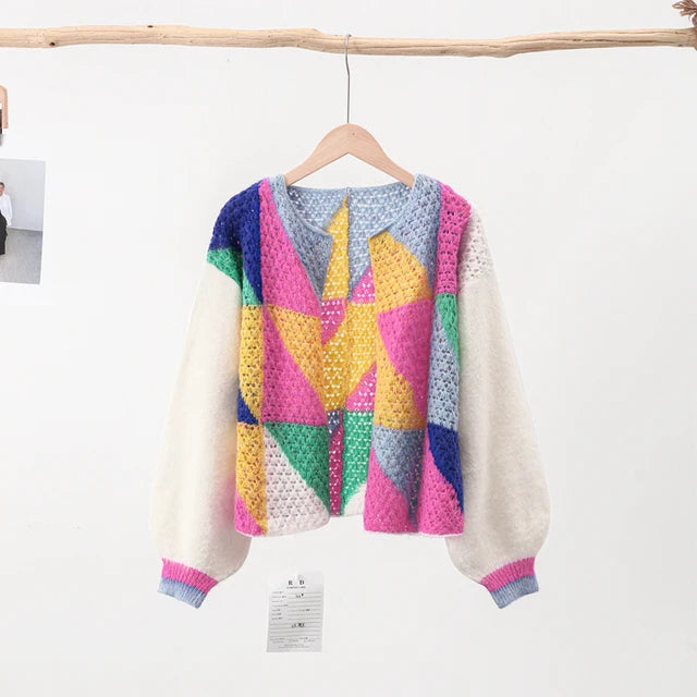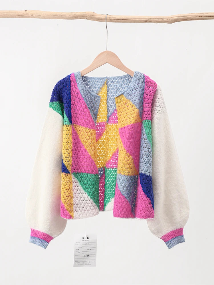 DERMEARNE Sleeve Patchwork Female Sweaters 2024 Elegant Casual Lady Top Hollow Out Colorful Kint Cardigan Women Sweater Autumn Long Puff