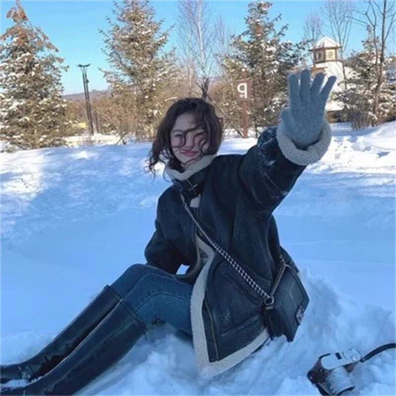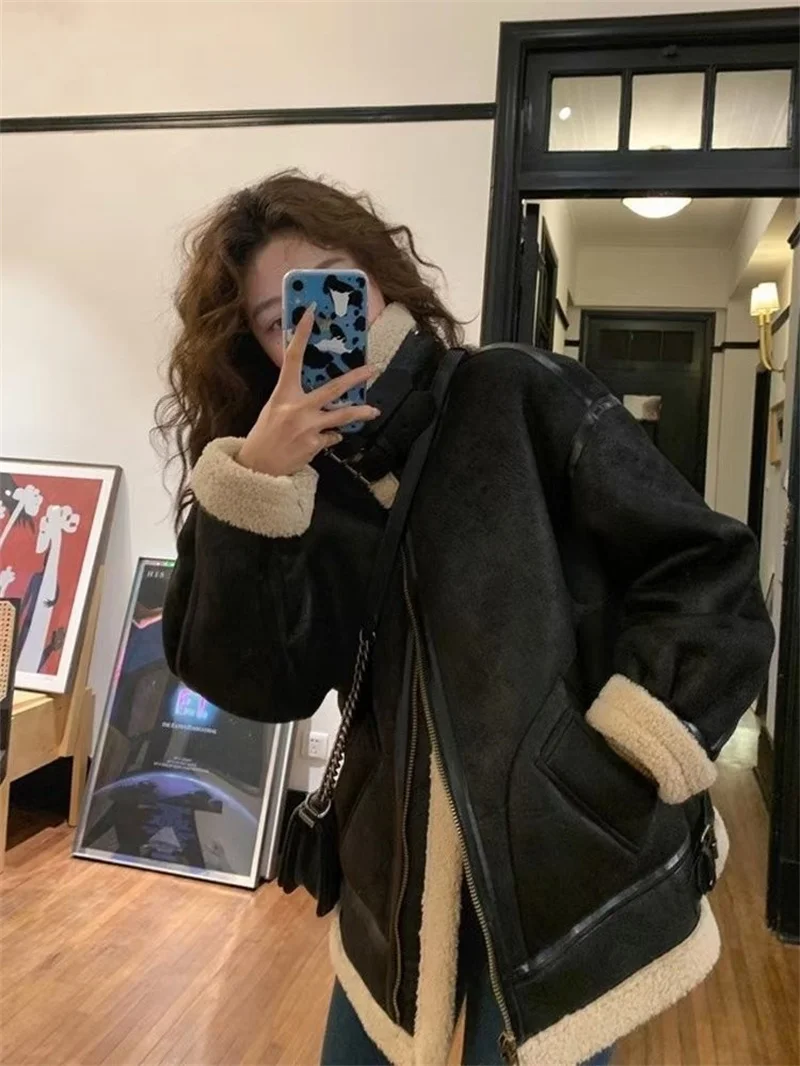 DERMEARNE Splicing Lamb Fur Coat For Women Autumn Winter 2025 New Loose Korean Motorcycle Jacket Thickened Jacket And Coat For Women Coat