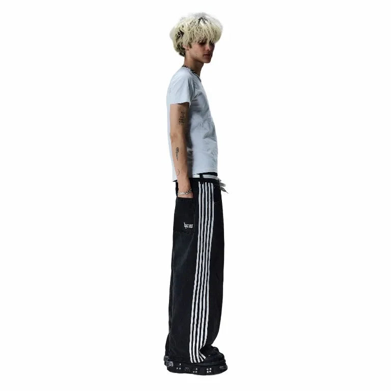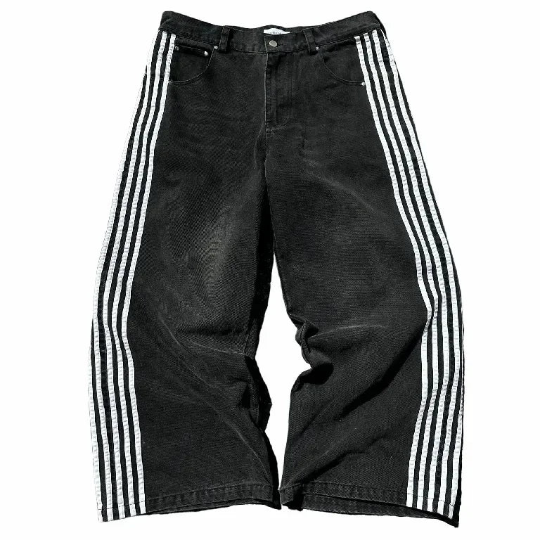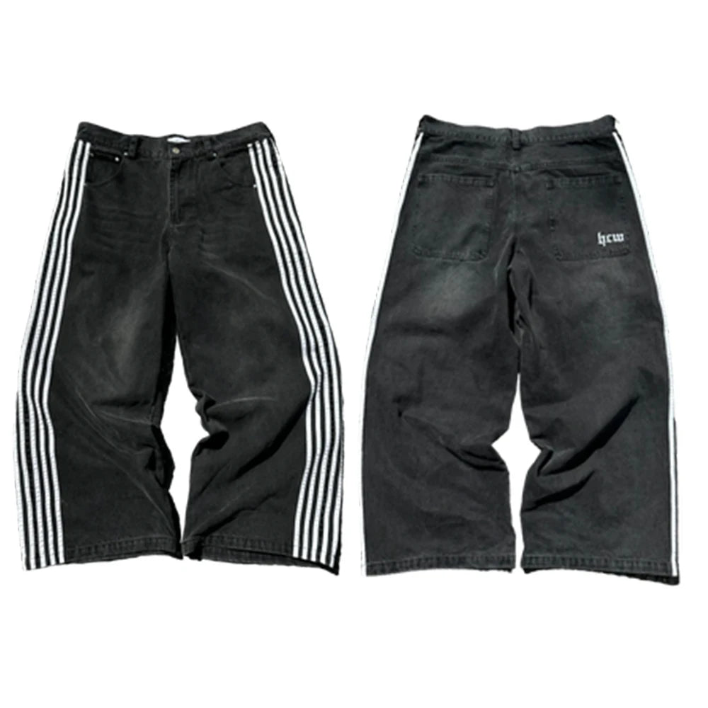 DERMEARNE Streetwear Hwc Jeans Y2K Harajuku Hip Hop Striped Baggy Jeans Black Pants Mens Womens New High Waisted Wide Leg Trousers Clothes