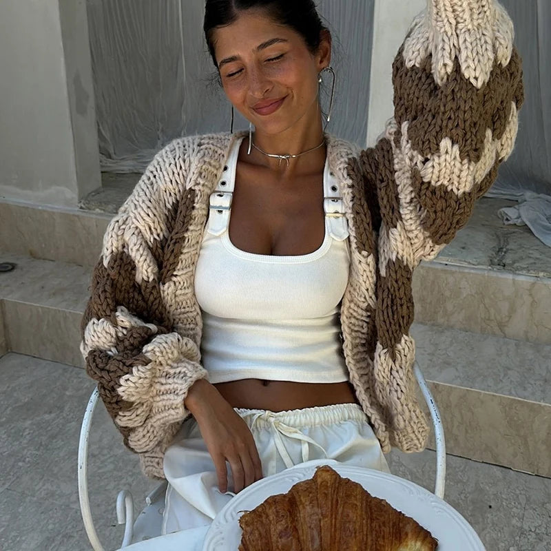DERMEARNE Stripe Pattern Cropped Cardigans Vintage Lantern Sleeves Knitted Sweater Aesthetic Y2k Knitwear Coat Women Autumn Outwear Street