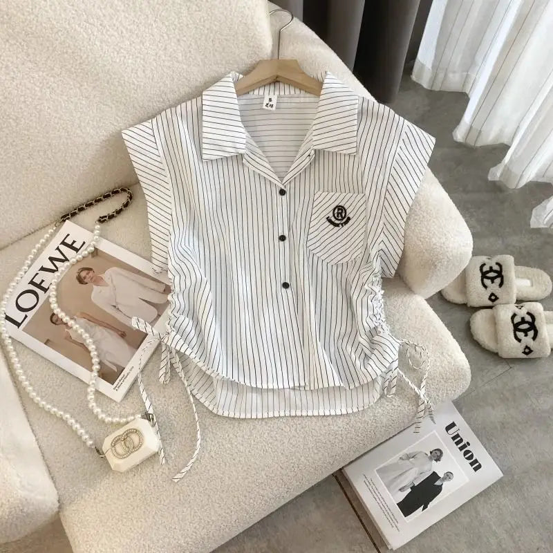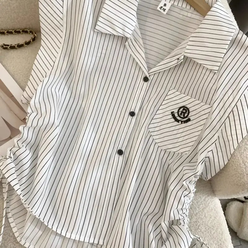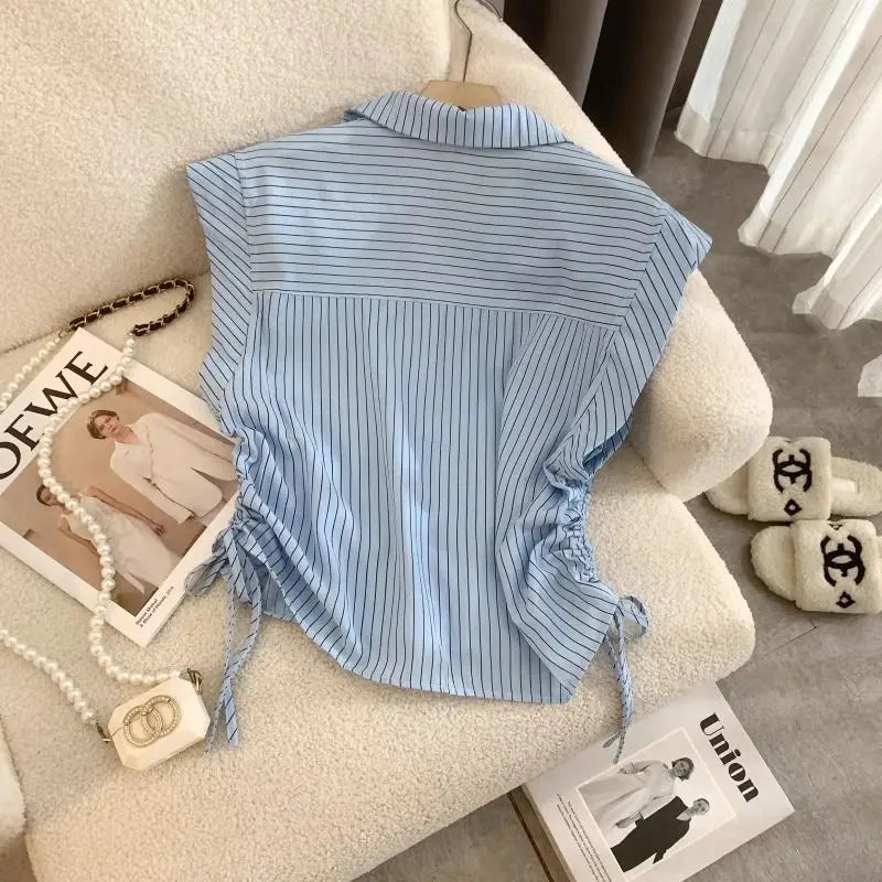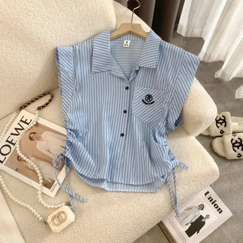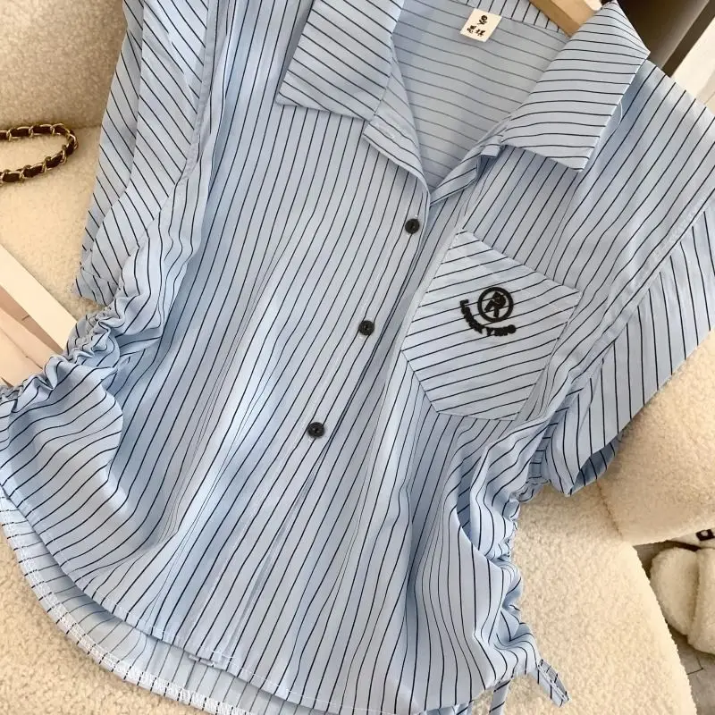 DERMEARNE Summer New Preppy Style Short Blouse Polo Neck Drawstring Lacing Striped Youth Sweet Shirt Tops Fashion Casual Women Clothing