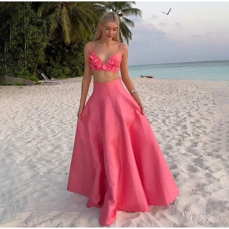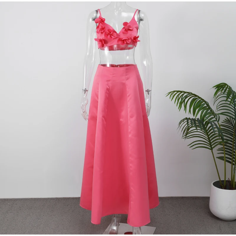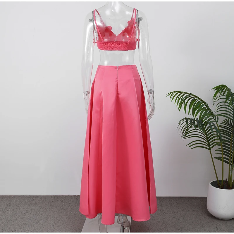 DERMEARNE Summer Sexy Sleeveless Vest Maxi Skirt Two Pieces Set Women Elegant Flower Decor Crop Tops Skirts Suits Lady Vacation Party Gown
