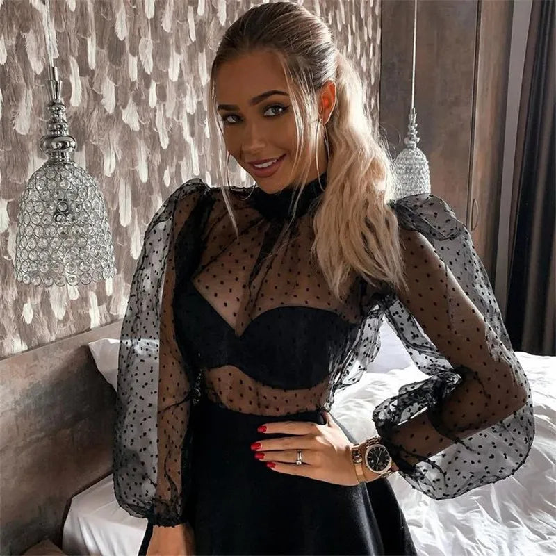 DERMEARNE Summer Sexy Thin Mesh Women Polka Dot Sheer See-through Tops Bikini Cover-Ups Puff Long Sleeve Blouse Shirts Beachwear Loose Top