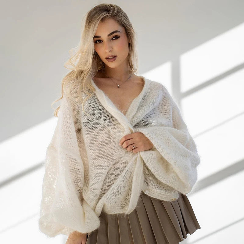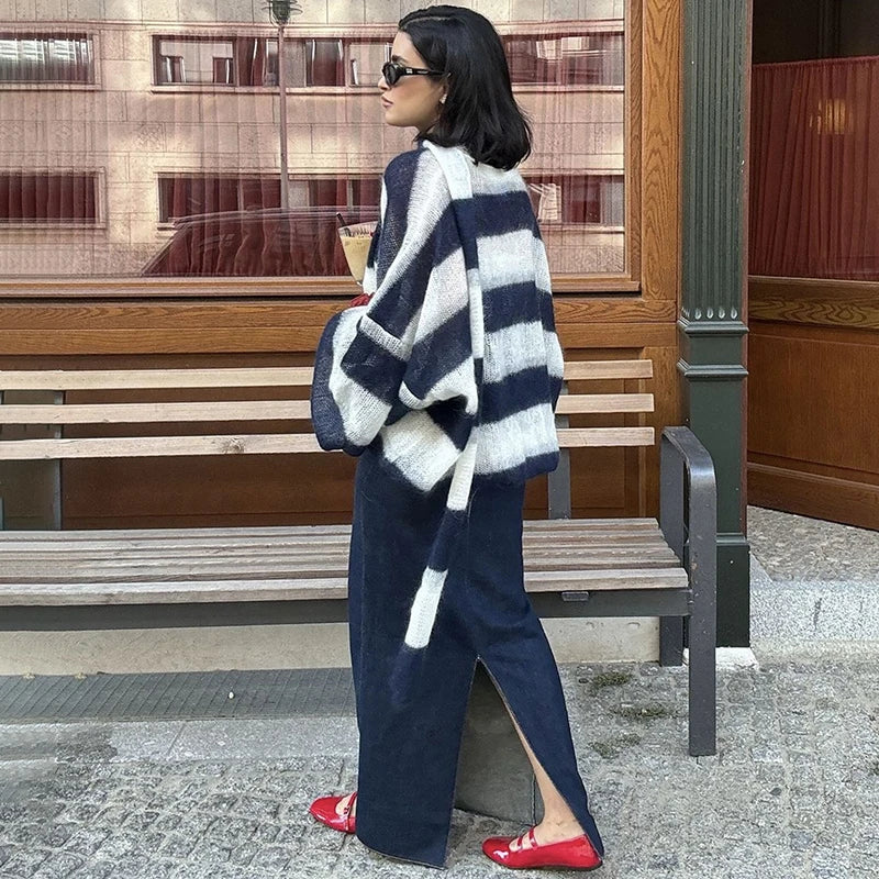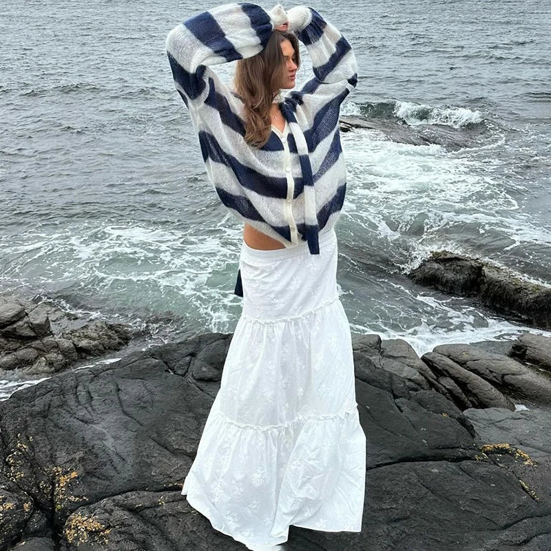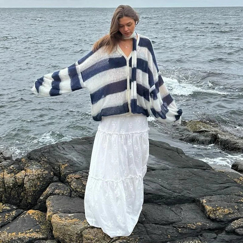DERMEARNE TARUXY Fashion Striped Sweater Cardigan With Scarf Female Loose Thin Hollow Knitted Top Lantern Sleeve Contrast Color Retro Top