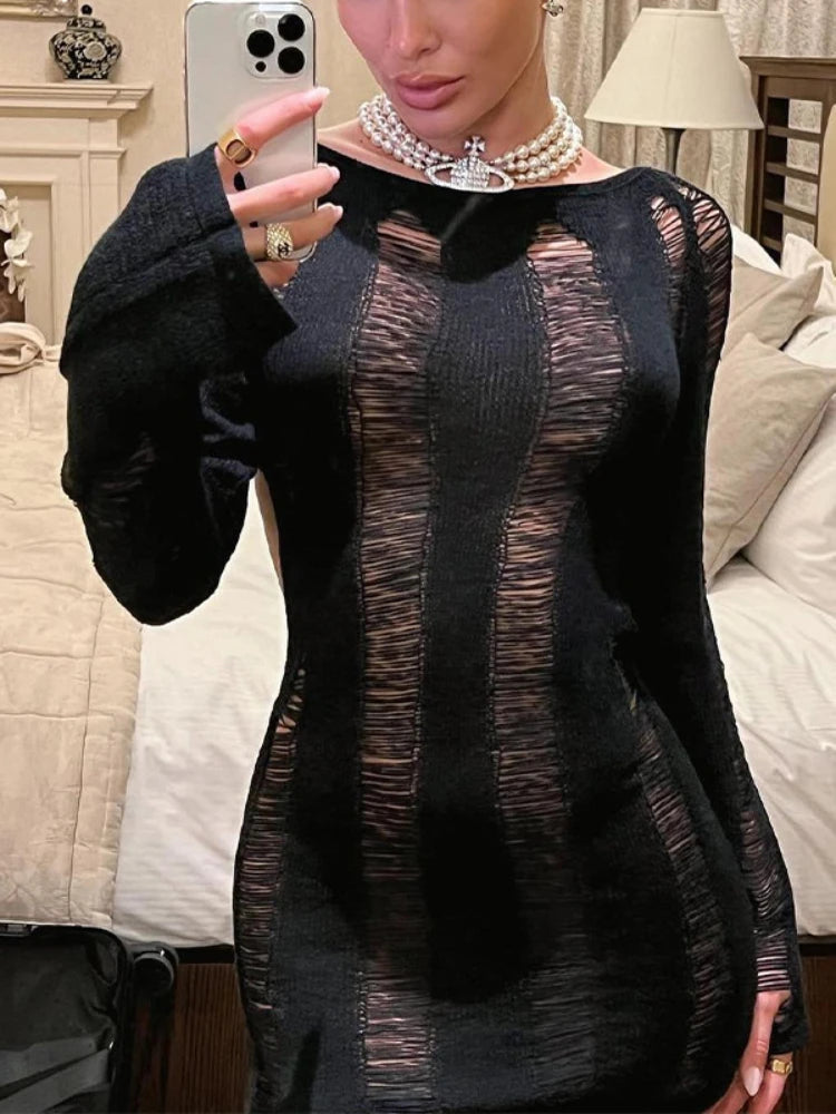 DERMEARNE TARUXY Sexy Sheer Knitted Dress Women Bodycon Long Sleeve Hollow Out Mini Dresses Femme Club Sexy Backless Knitwear Dress Womens