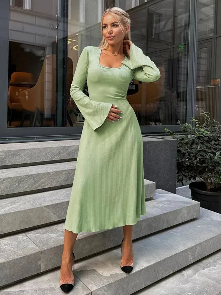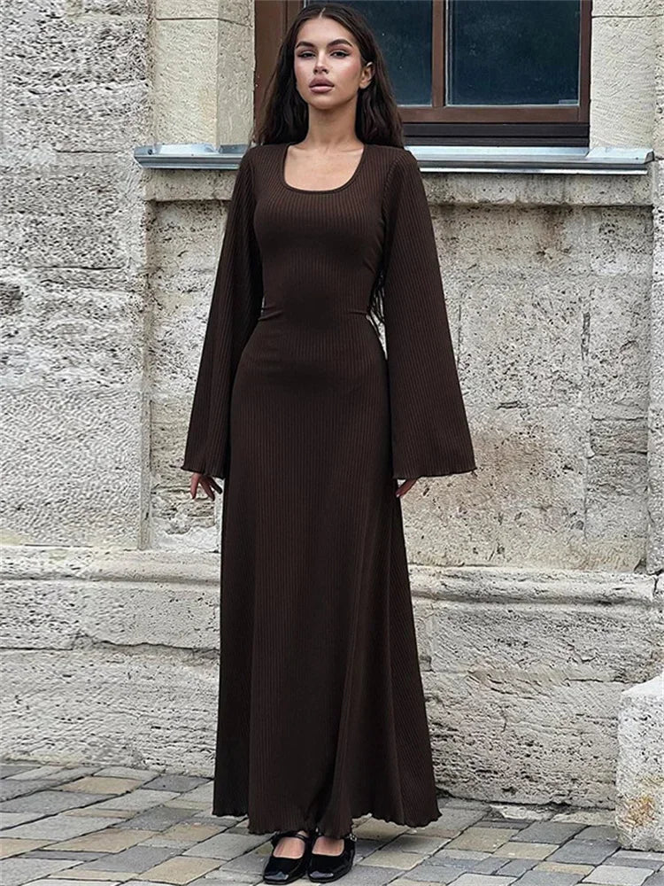 DERMEARNE Tossy Scoop Neck Lace-Up Ribbed Maxi Dress Female Long Sleeve Fashion Slim Loose Bandage Dress Autumn 2025 Solid Women Dress New