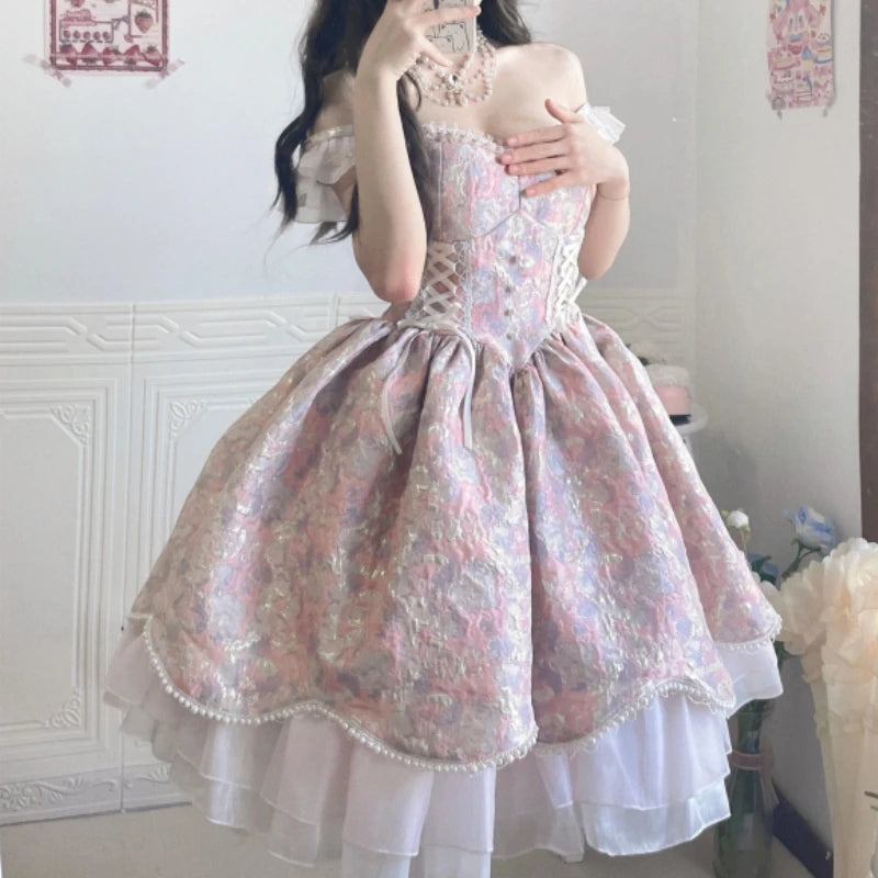 DERMEARNE Victorian Vintage Lolita Dress Sweet Elegant Women Lace Ruffles Pearl Slim Bandage Princess Dresses Female Cute Party Mini Dress